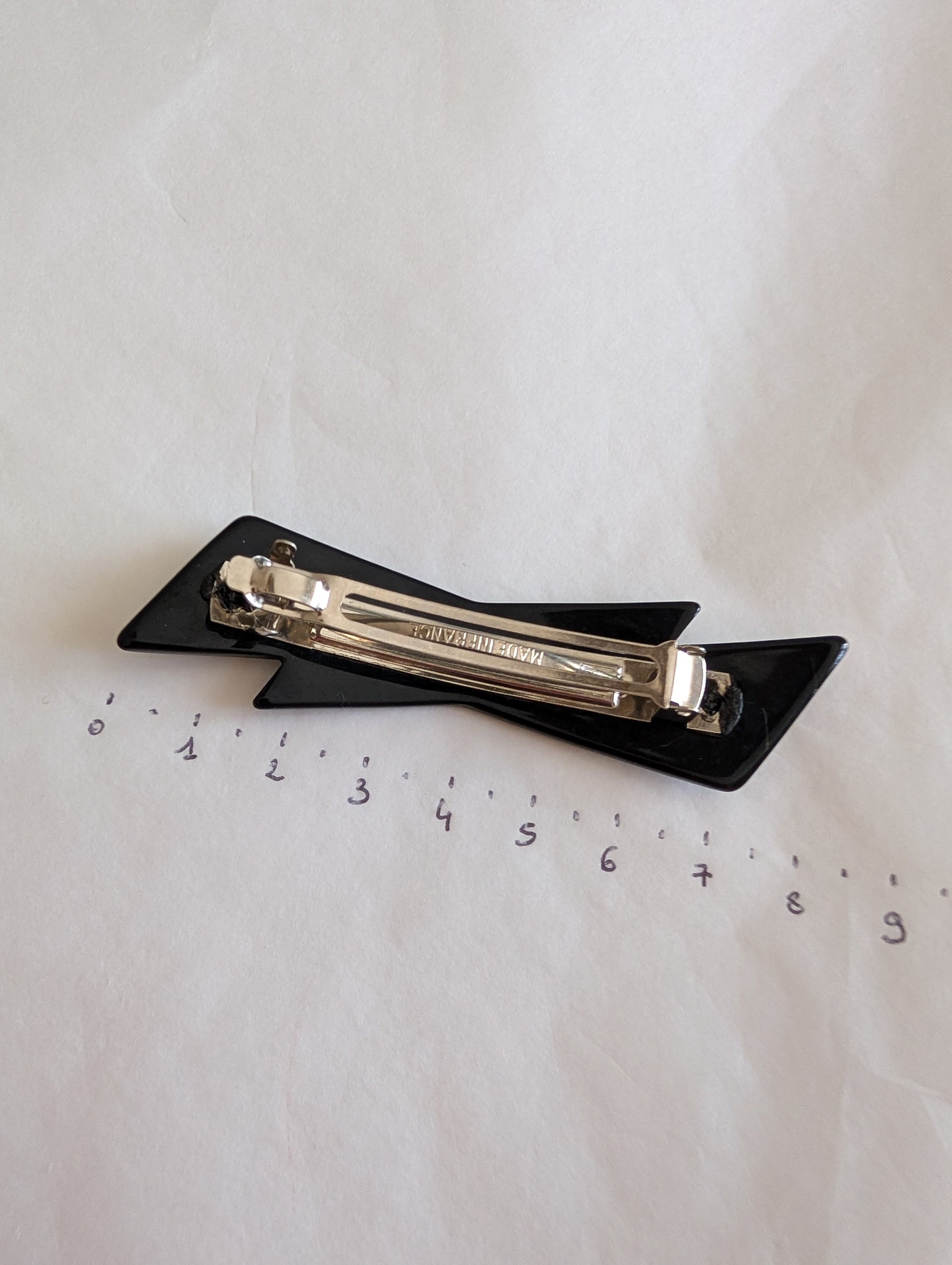 La pièce provient du stock d'un atelier de fabrication de barrettes et bijoux de cheveux situé dans le Jura. Le Jura est le berceau de l'industrie du plastique français. On y fabrique des pièces de très grande qualité.