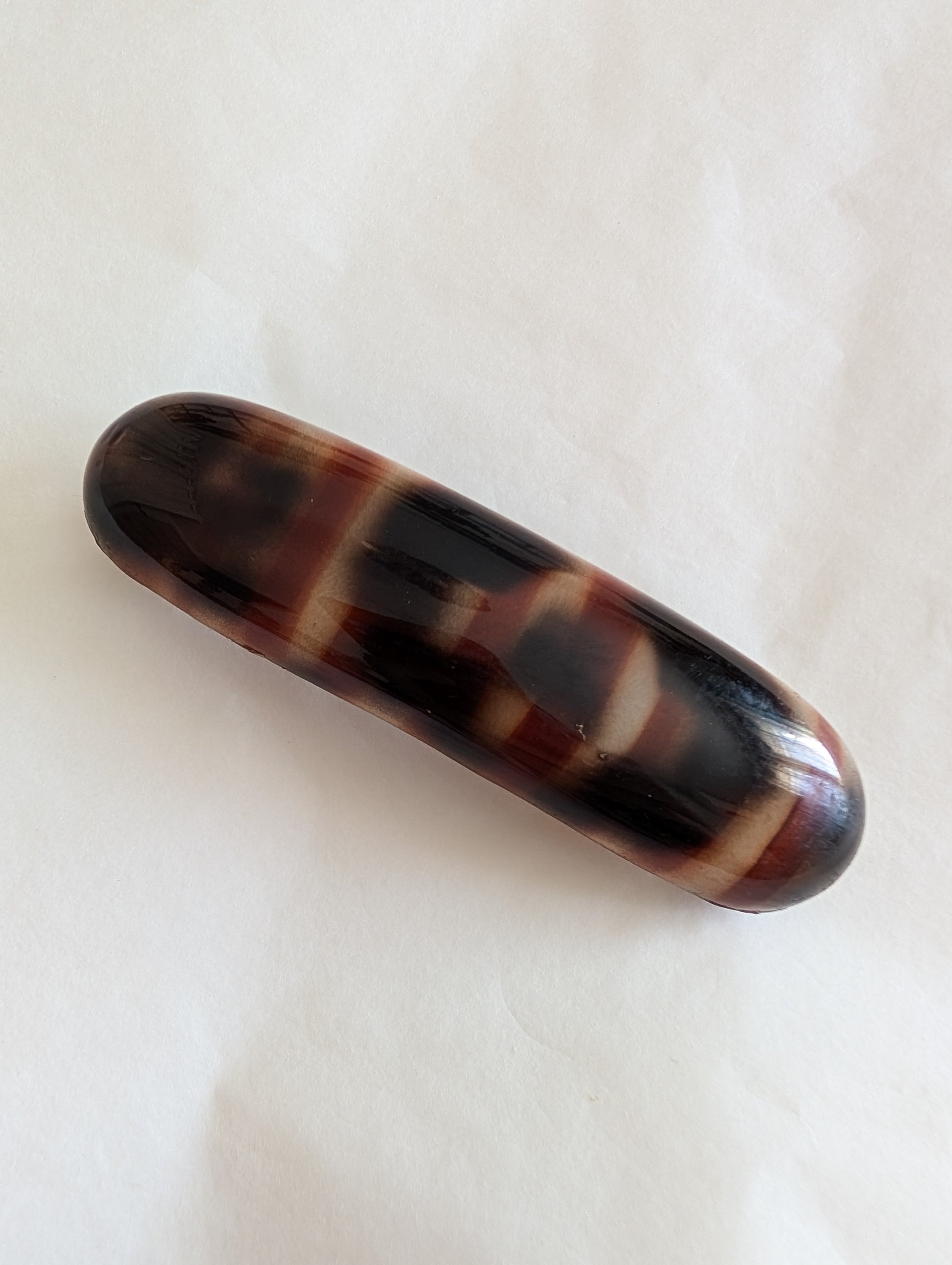 La pièce provient du stock d'un atelier de fabrication de barrettes et bijoux de cheveux situé dans le Jura. Le Jura est le berceau de l'industrie du plastique français. On y fabrique des pièces de très grande qualité.