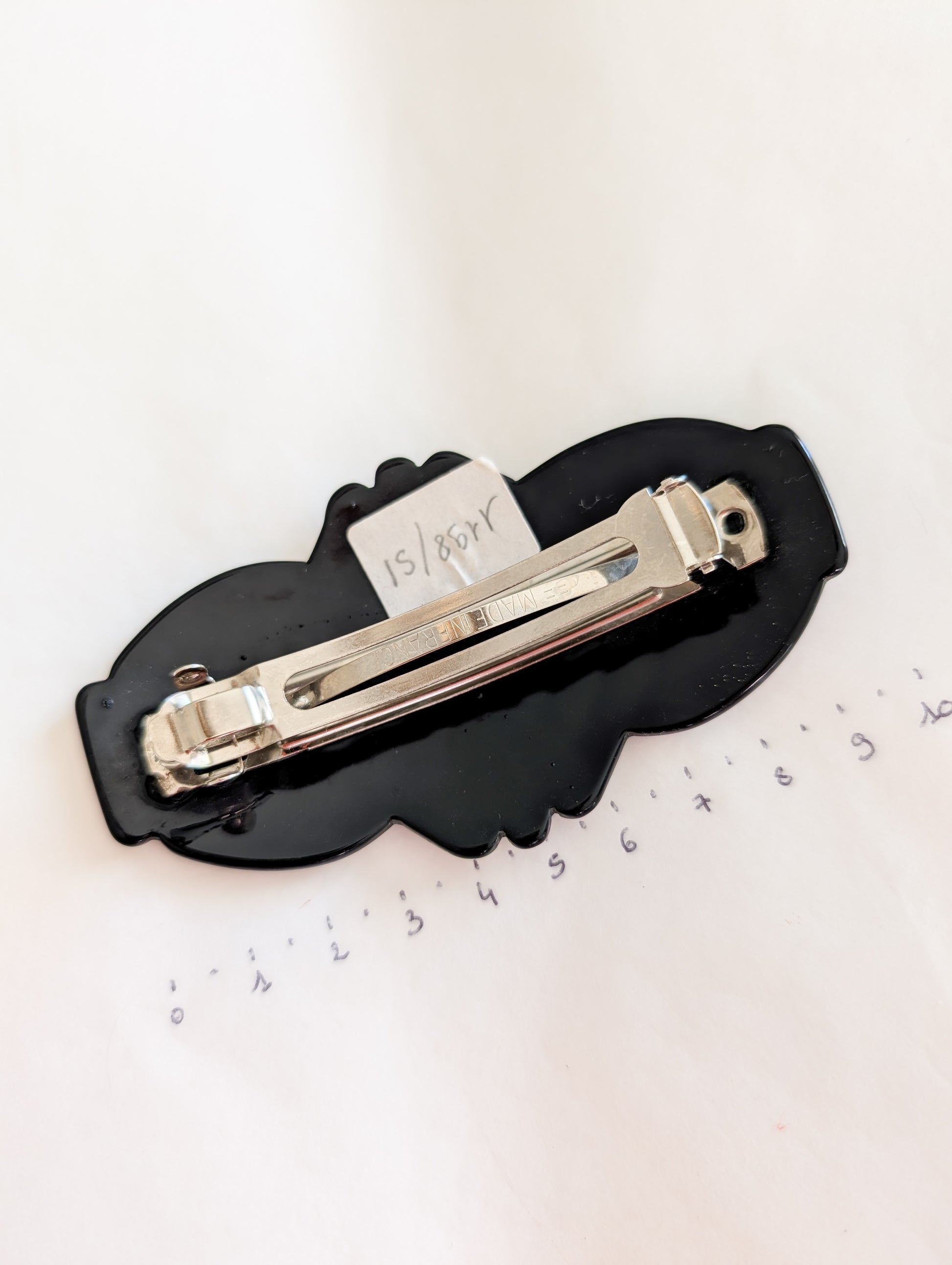 La pièce provient du stock d'un atelier de fabrication de barrettes et bijoux de cheveux situé dans le Jura. Le Jura est le berceau de l'industrie du plastique français. On y fabrique des pièces de très grande qualité.