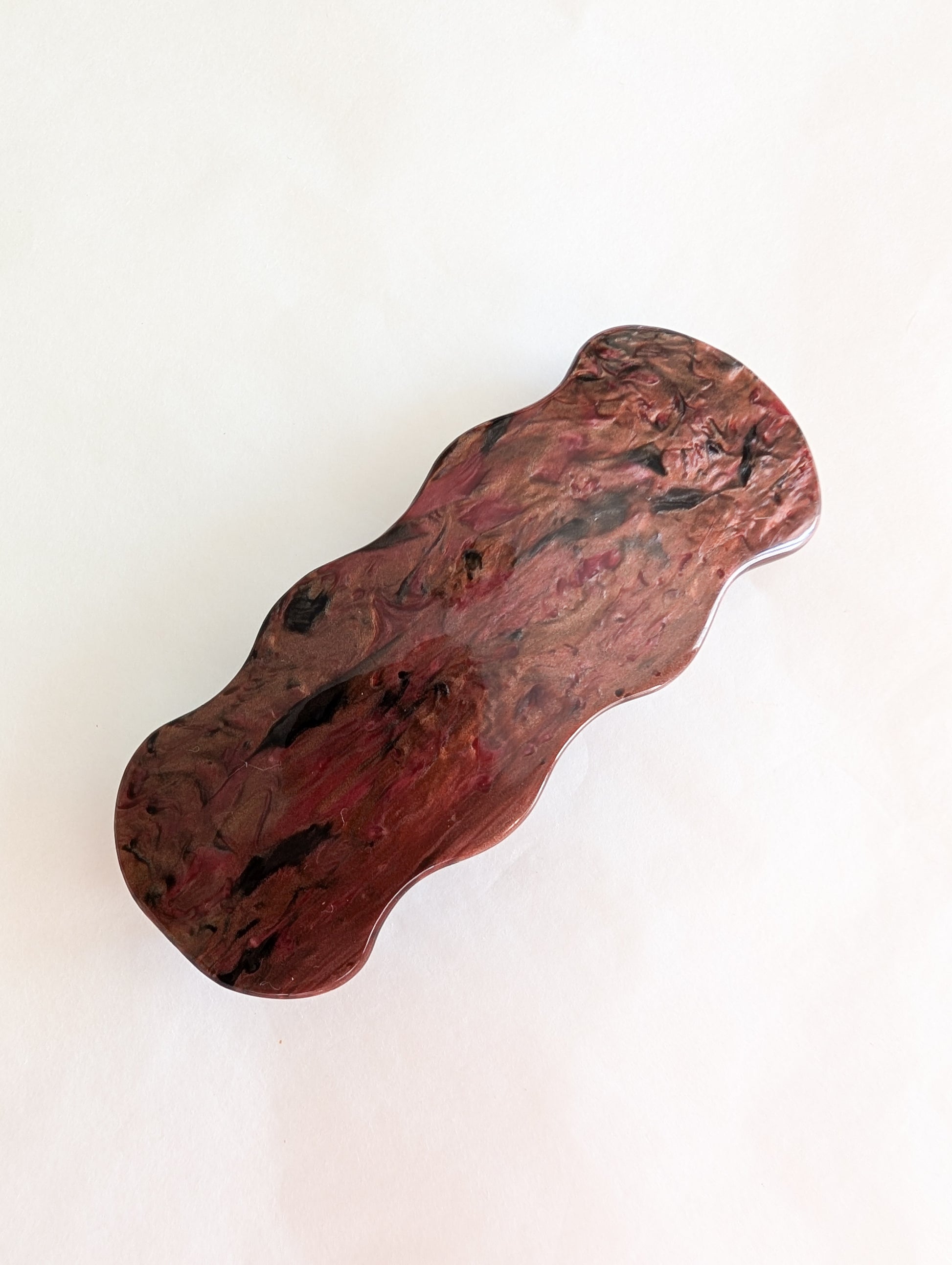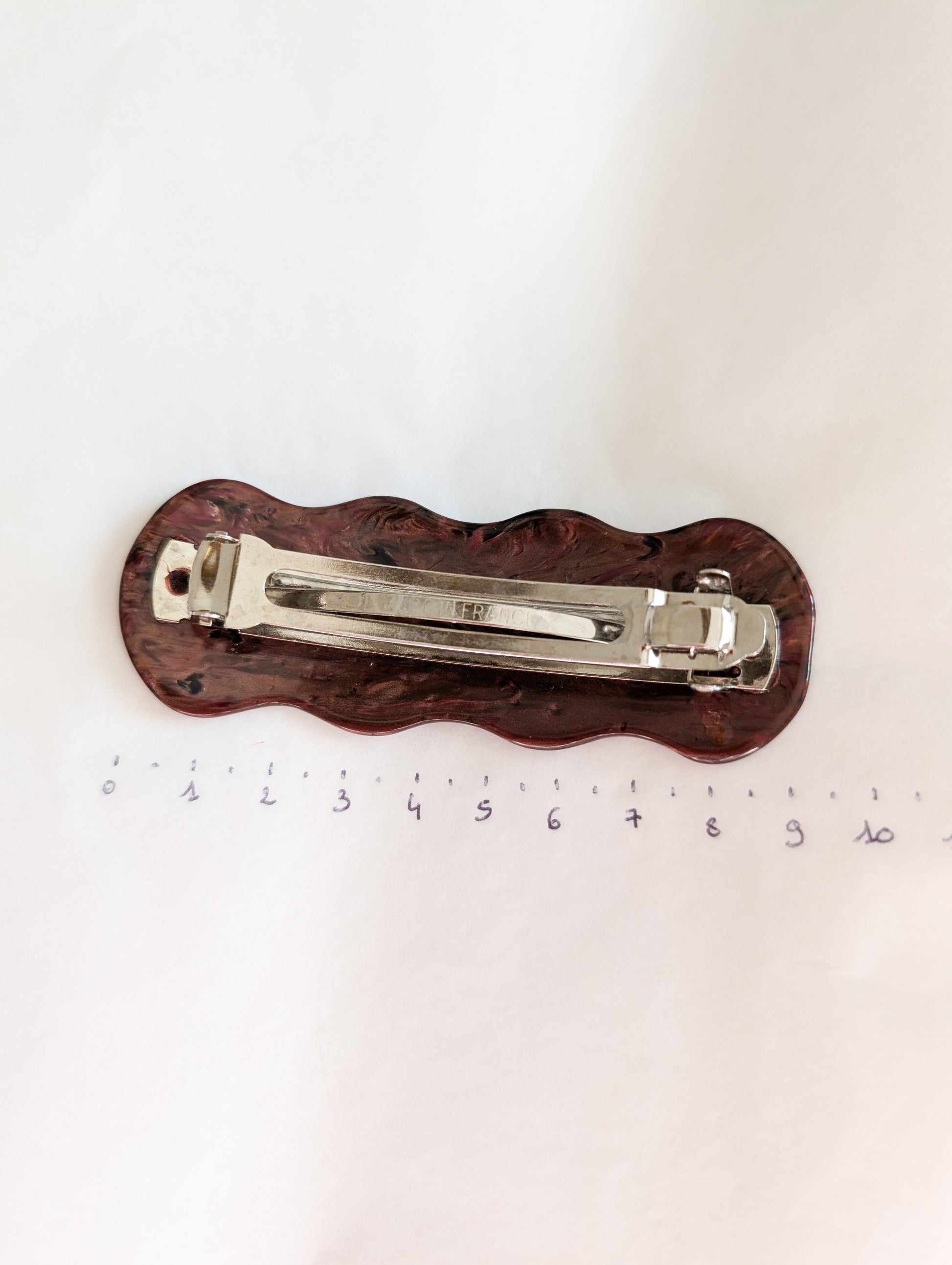 La pièce provient du stock d'un atelier de fabrication de barrettes et bijoux de cheveux situé dans le Jura. Le Jura est le berceau de l'industrie du plastique français. On y fabrique des pièces de très grande qualité.