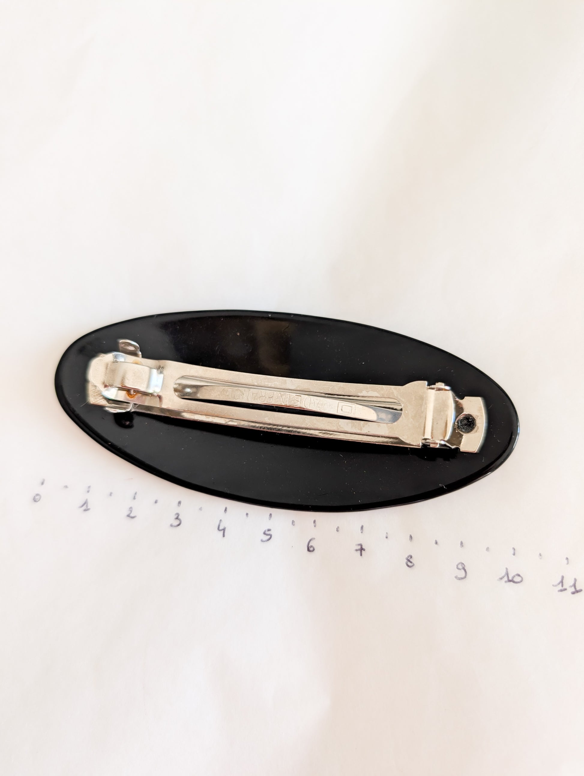 La pièce provient du stock d'un atelier de fabrication de barrettes et bijoux de cheveux situé dans le Jura. Le Jura est le berceau de l'industrie du plastique français. On y fabrique des pièces de très grande qualité.