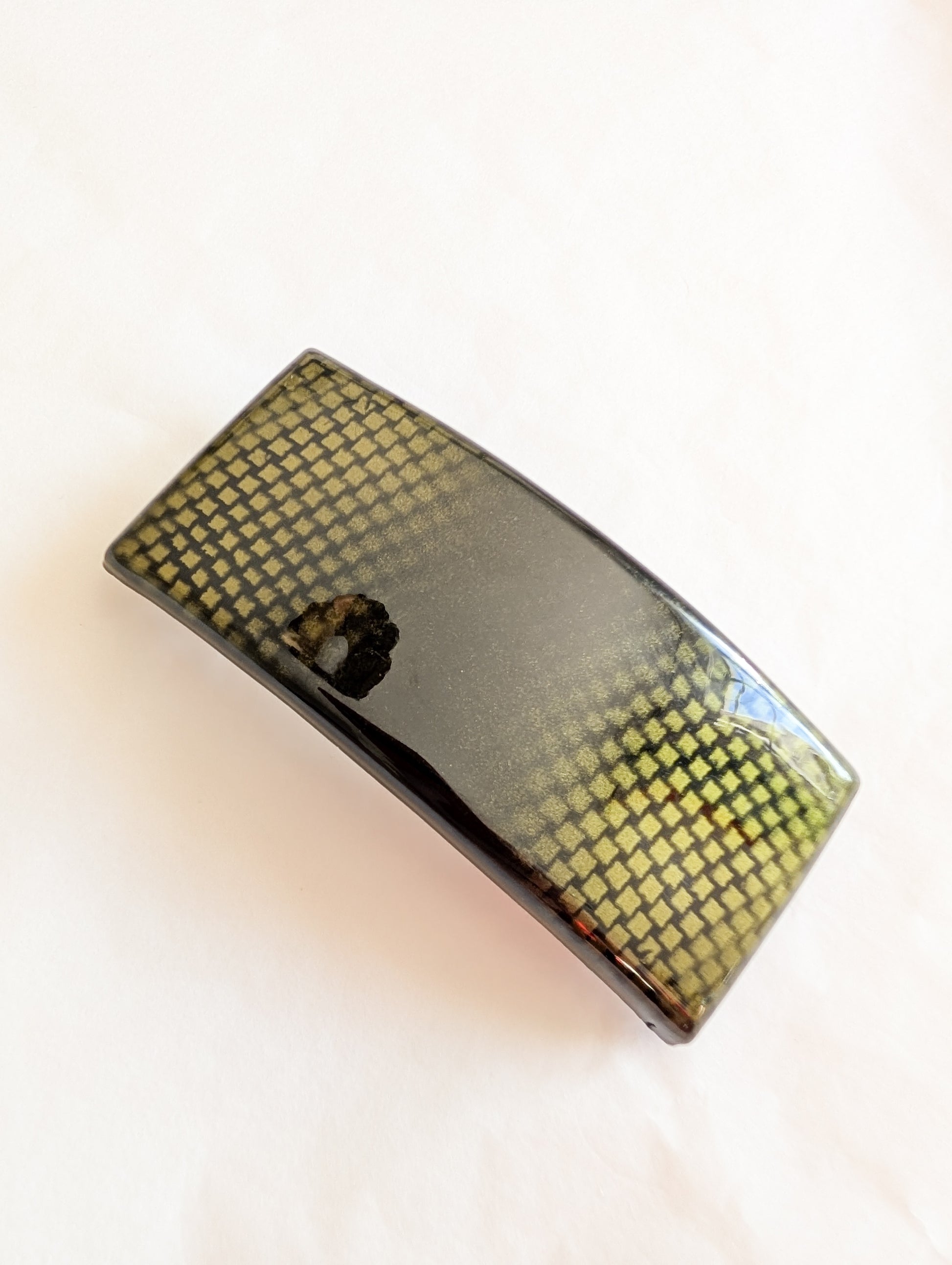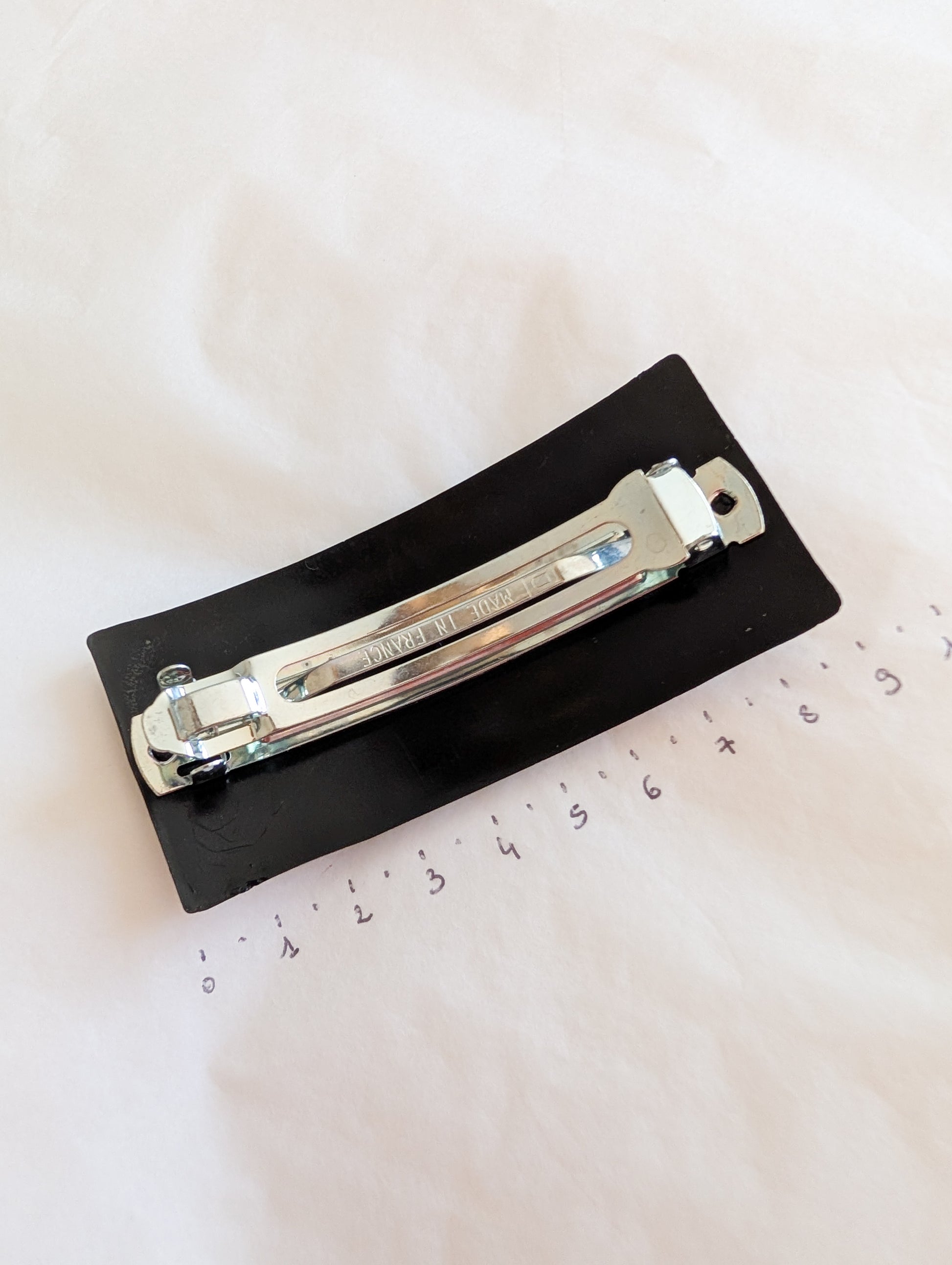 La pièce provient du stock d'un atelier de fabrication de barrettes et bijoux de cheveux situé dans le Jura. Le Jura est le berceau de l'industrie du plastique français. On y fabrique des pièces de très grande qualité.