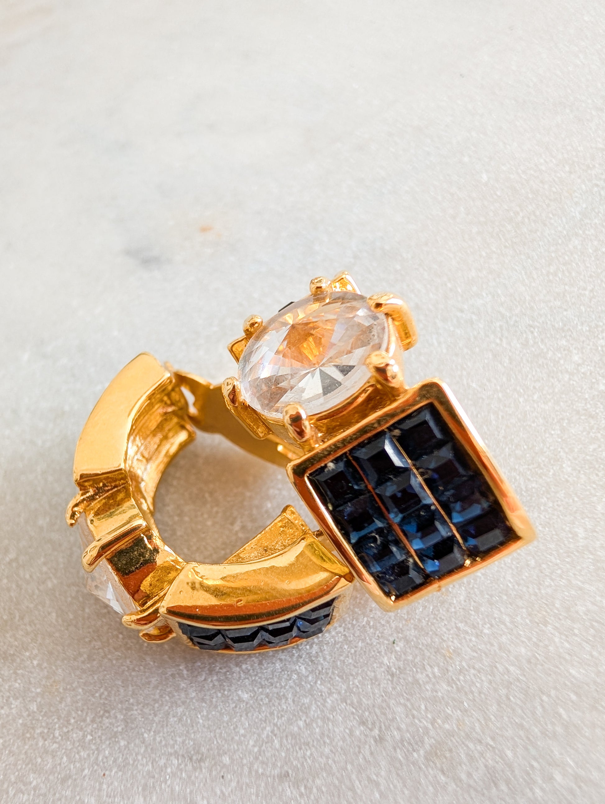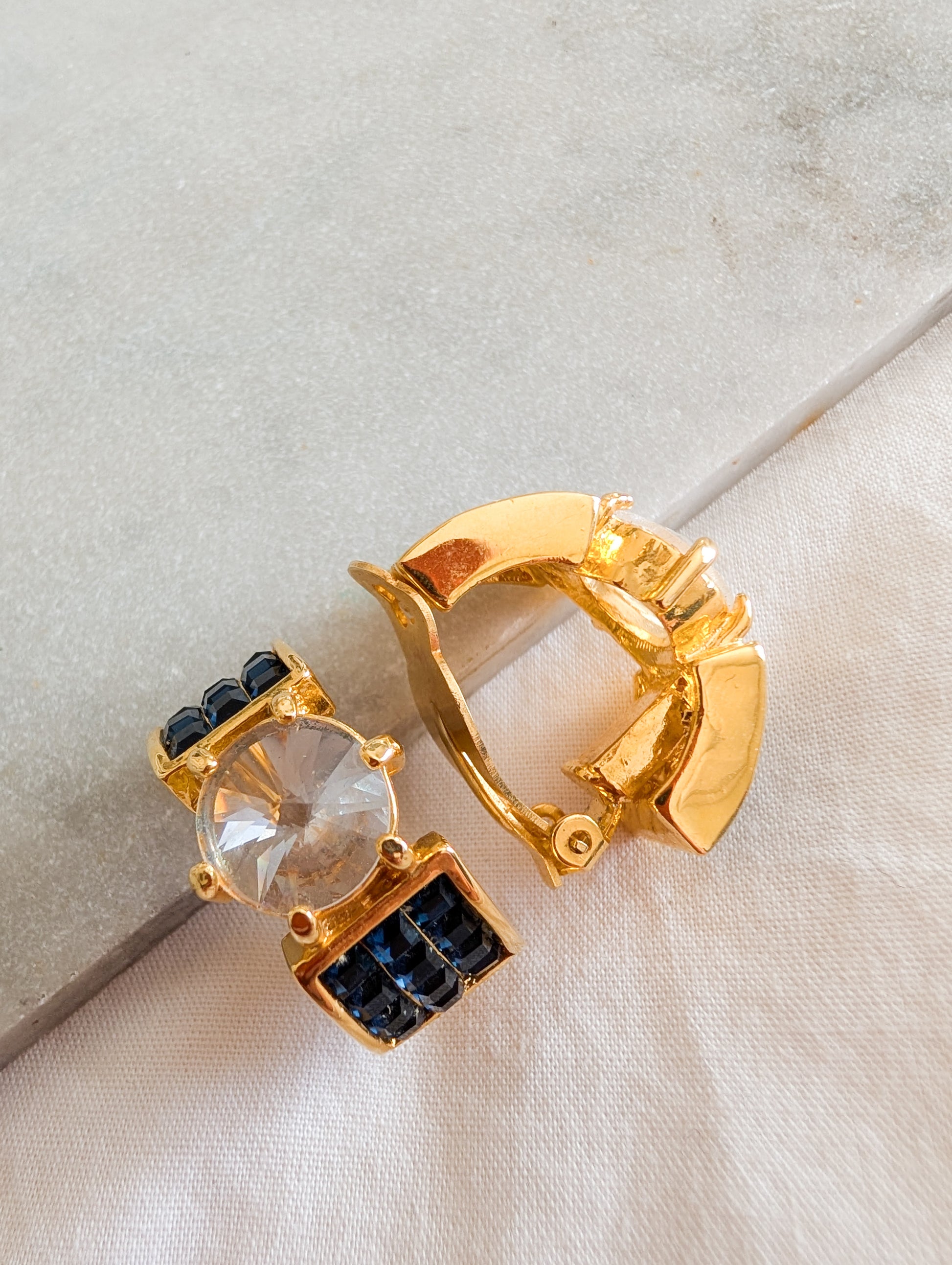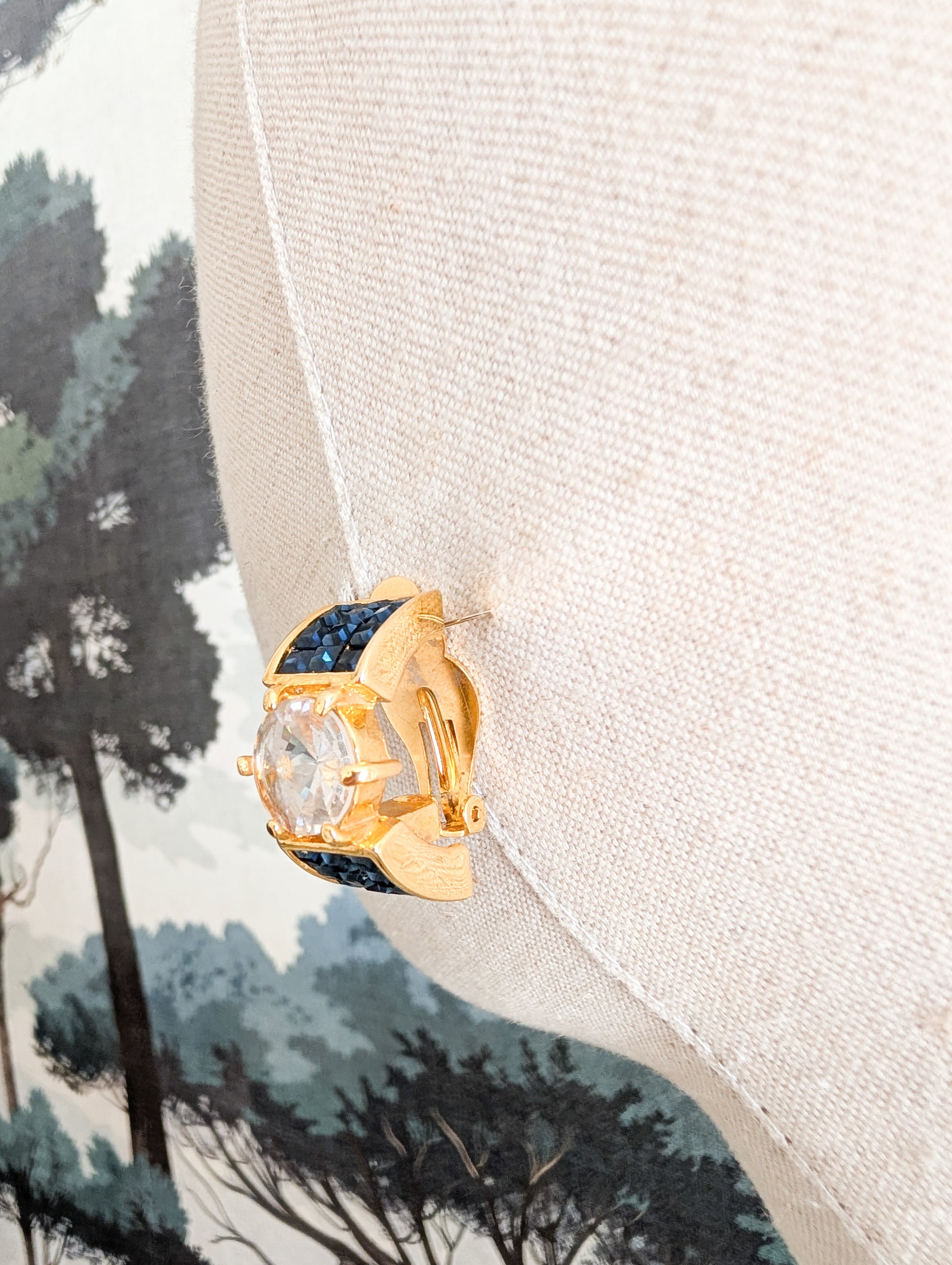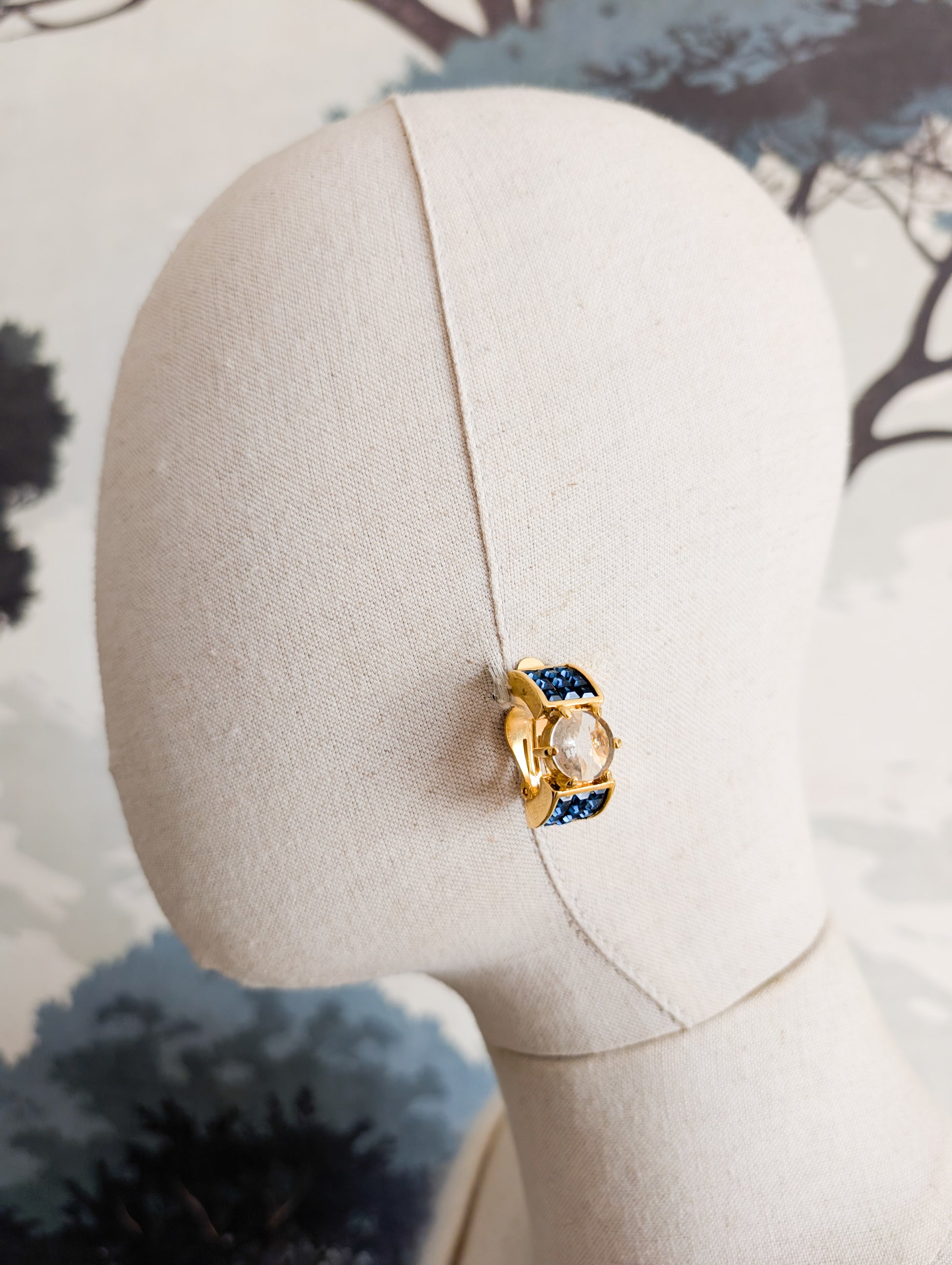 Les boucles sont en métal doré, pavé de strass en verre bleu. Au centre une pierre en verre à facettes.