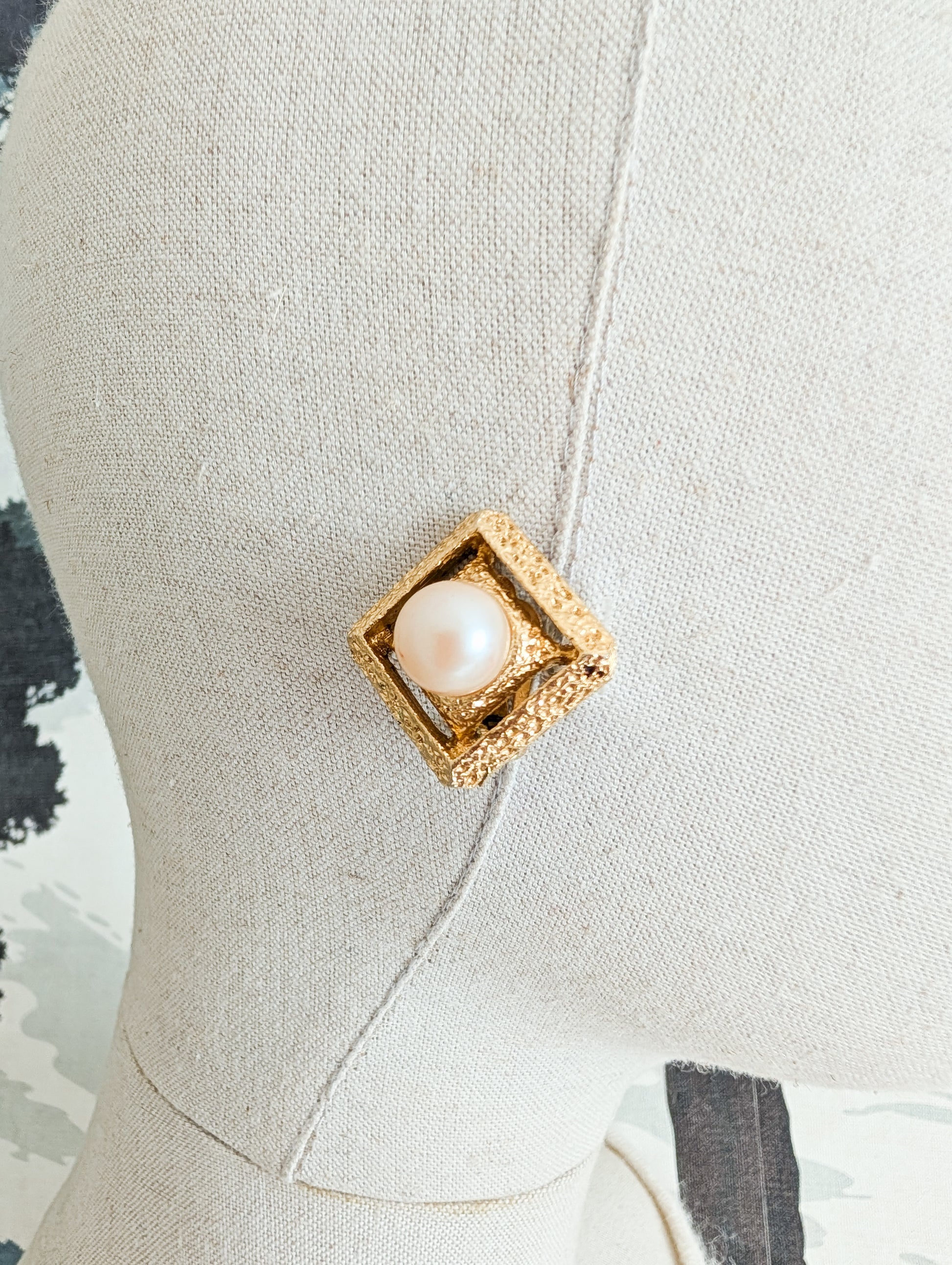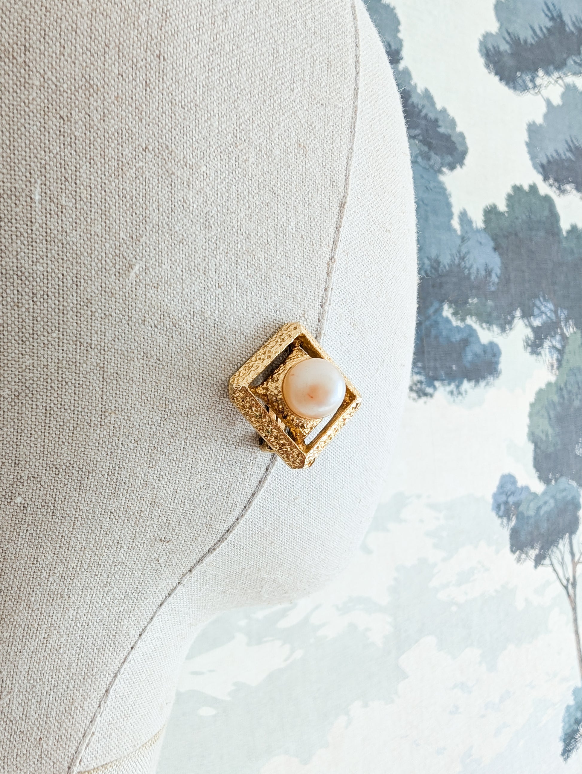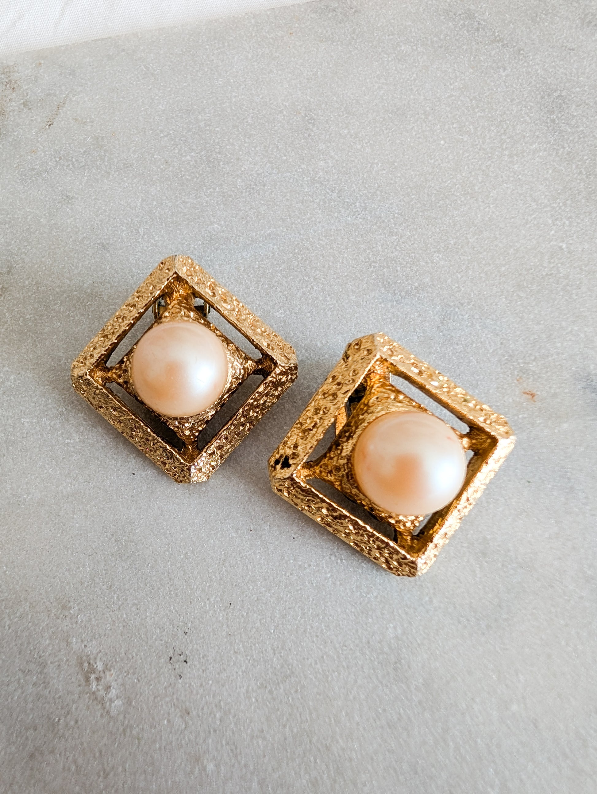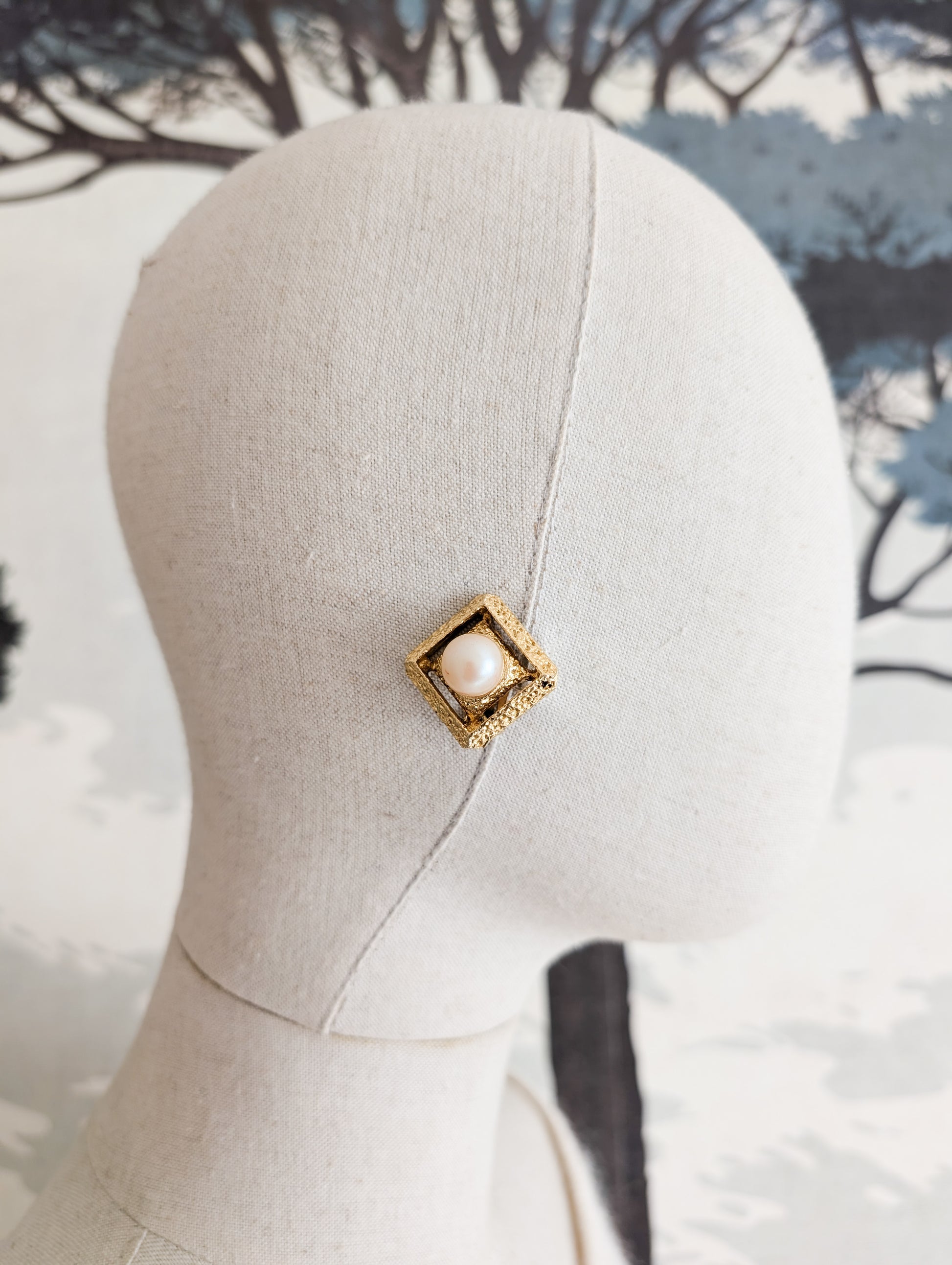 Très jolie paire de boucles d'oreilles à clip datant des années 60. Les boucles d'oreille sont en métal doré. Au centre, une belle perle fantaisie nacrée.