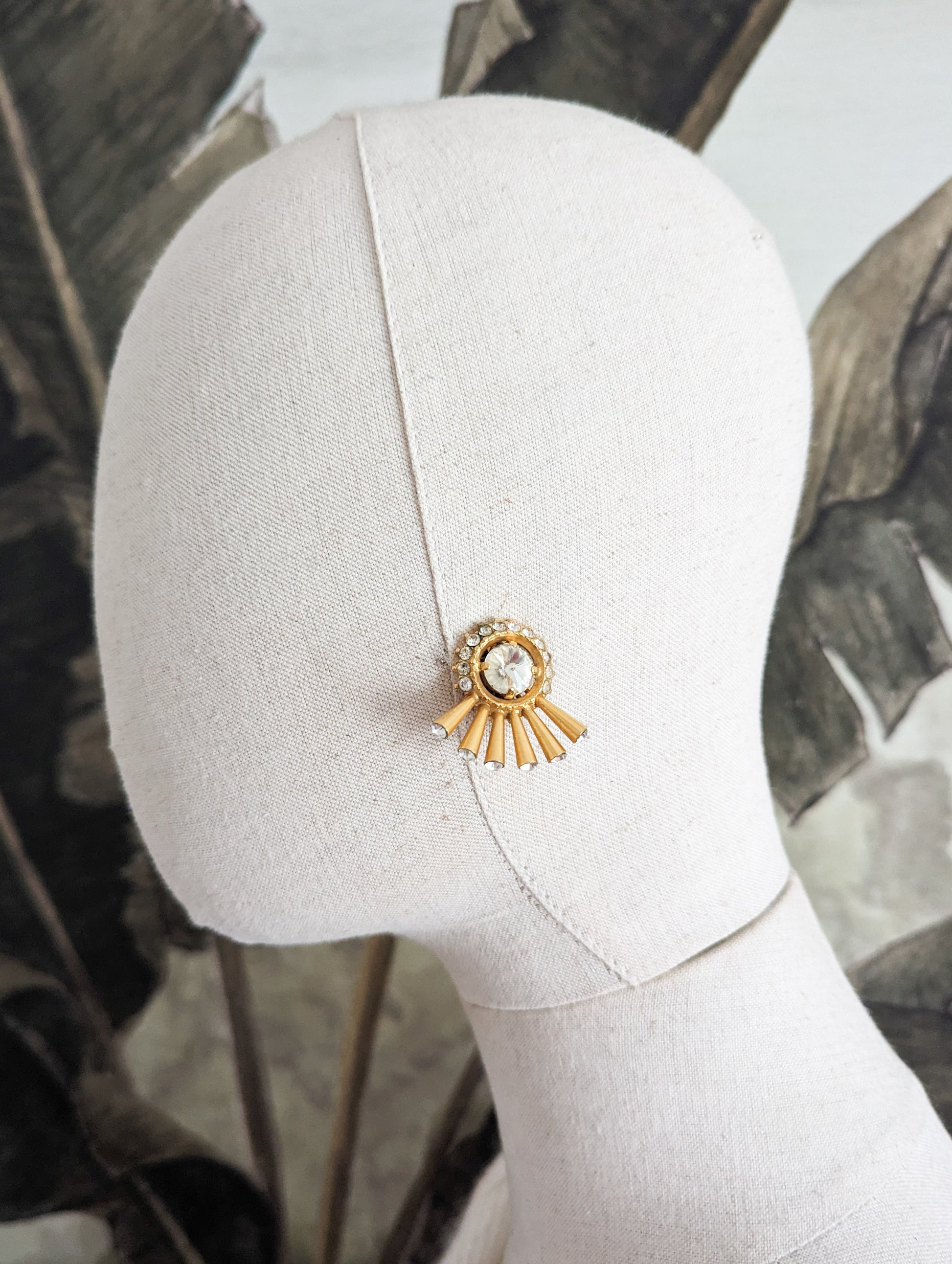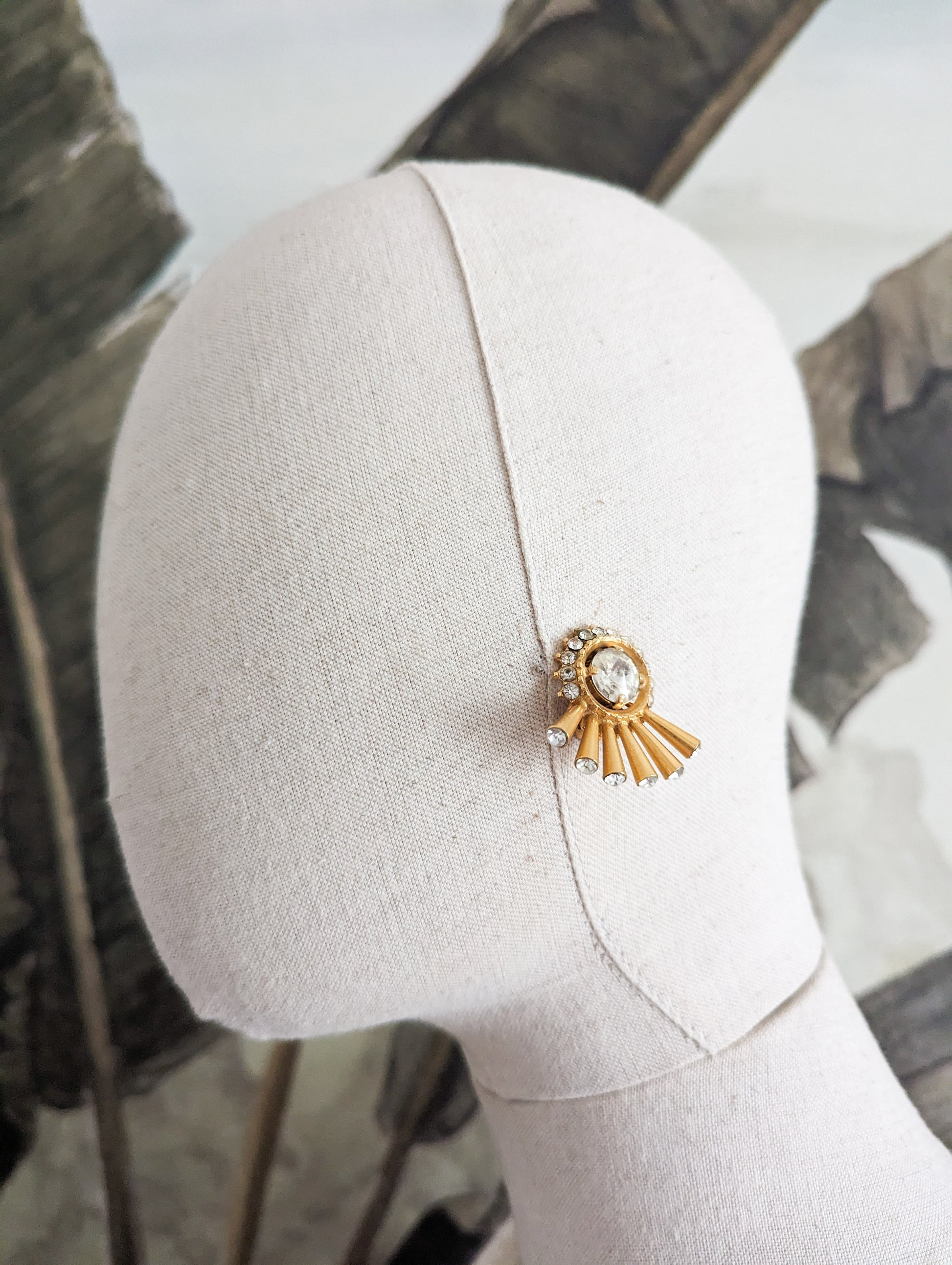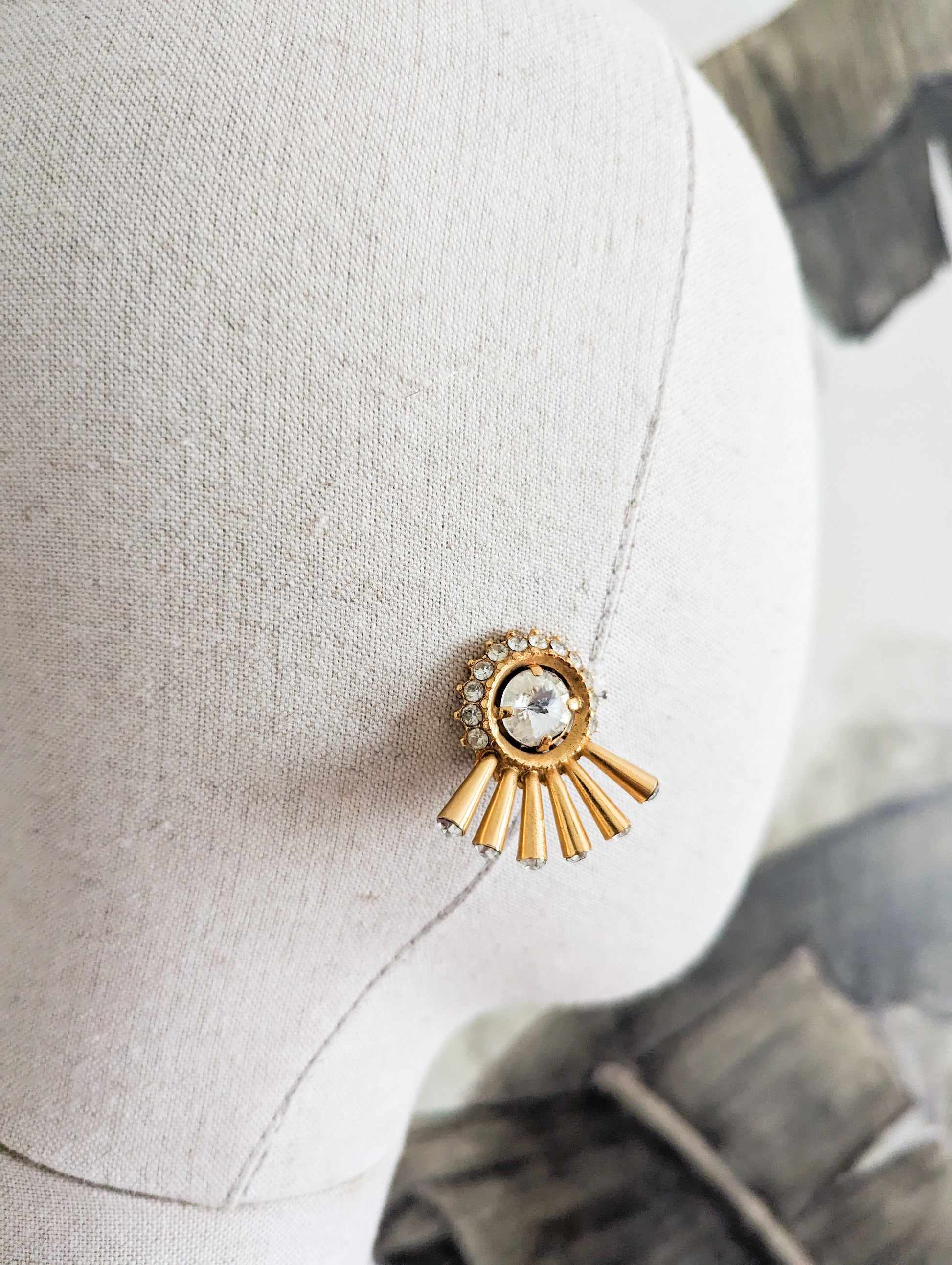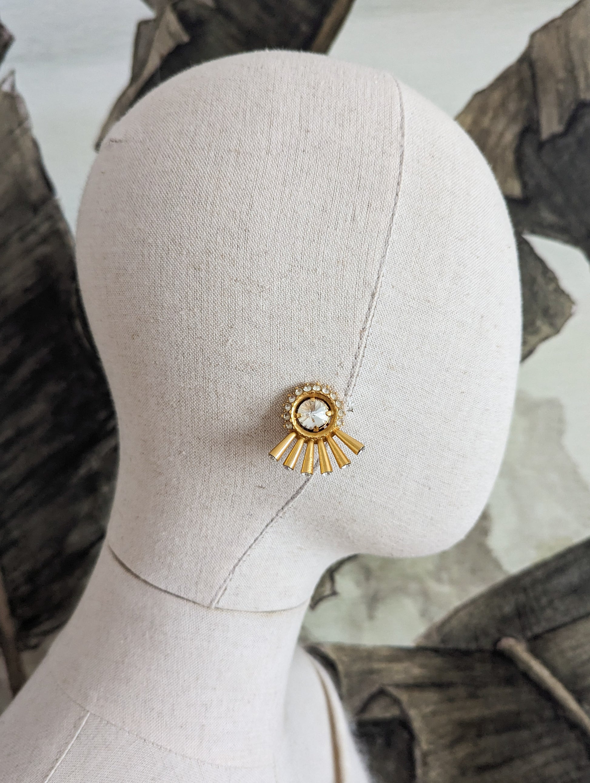 La monture est finement travaillée. J'aime particulièrement son dessin comme un soleil. En bas de chaque branche, un strass en verre blanc vient apporter de la lumière au bijou.