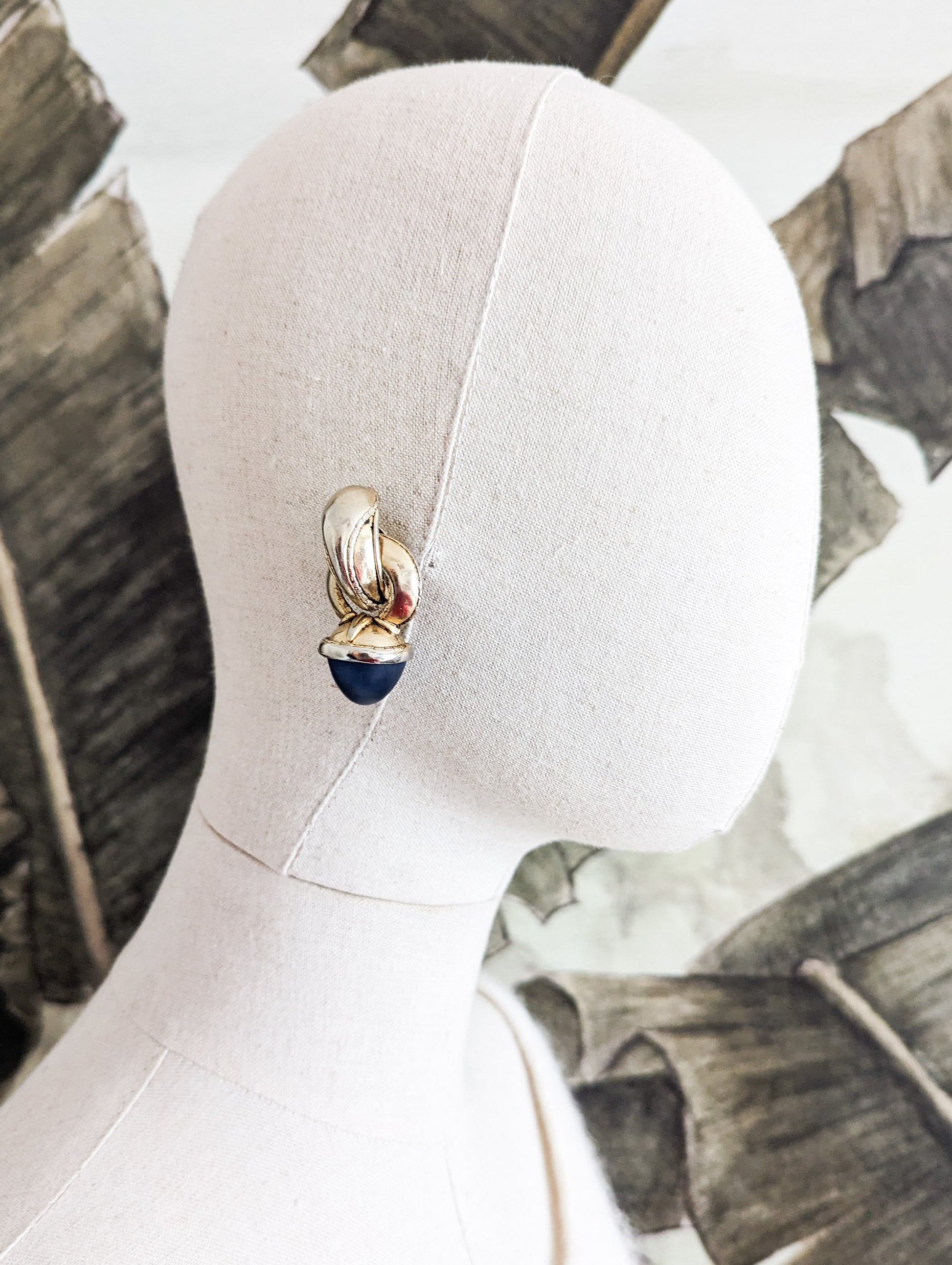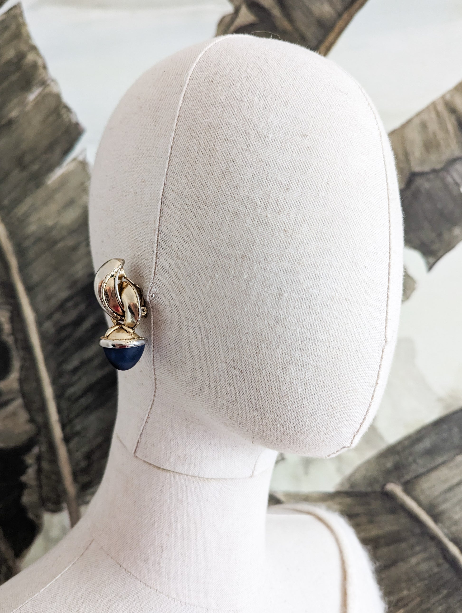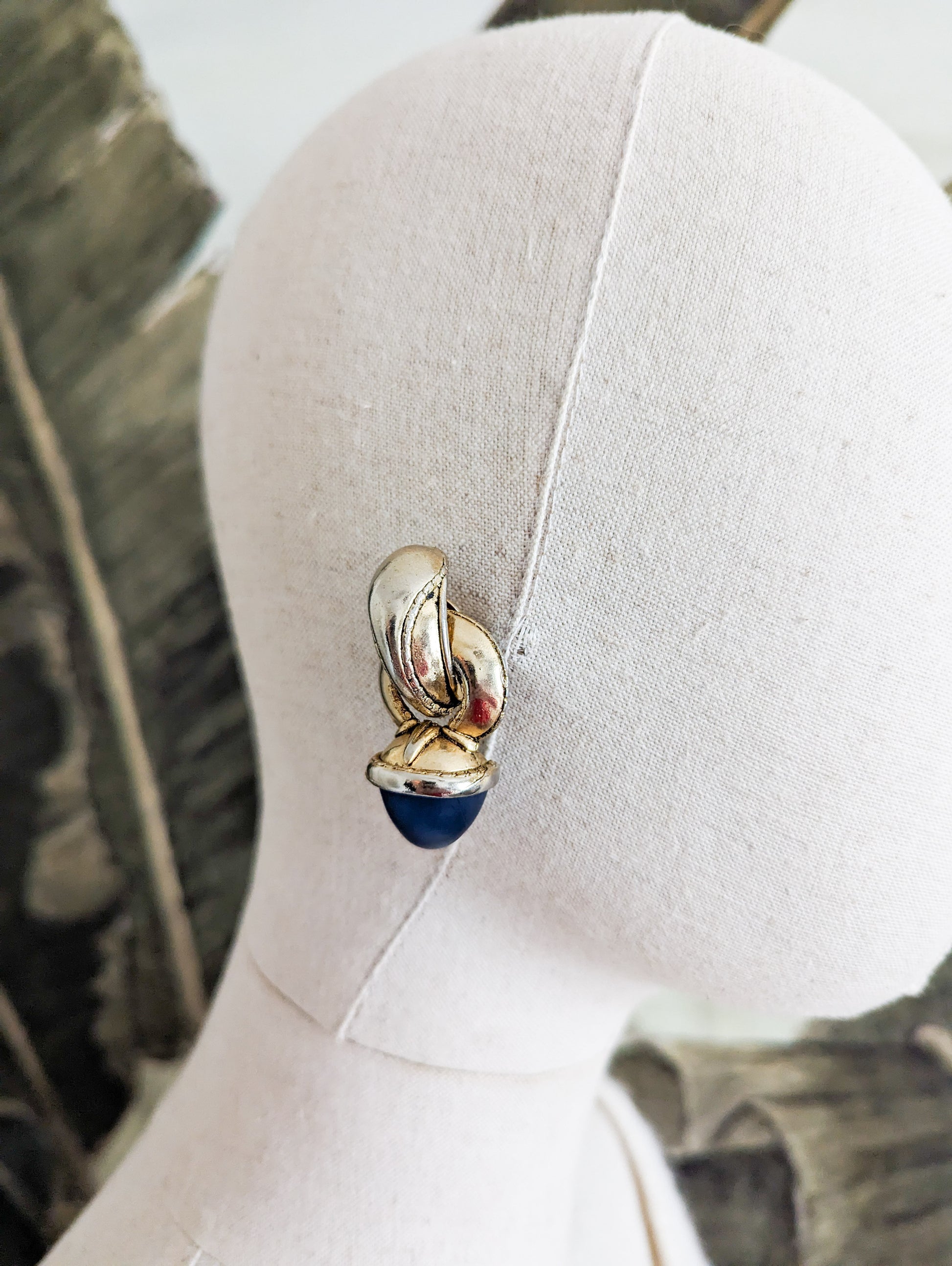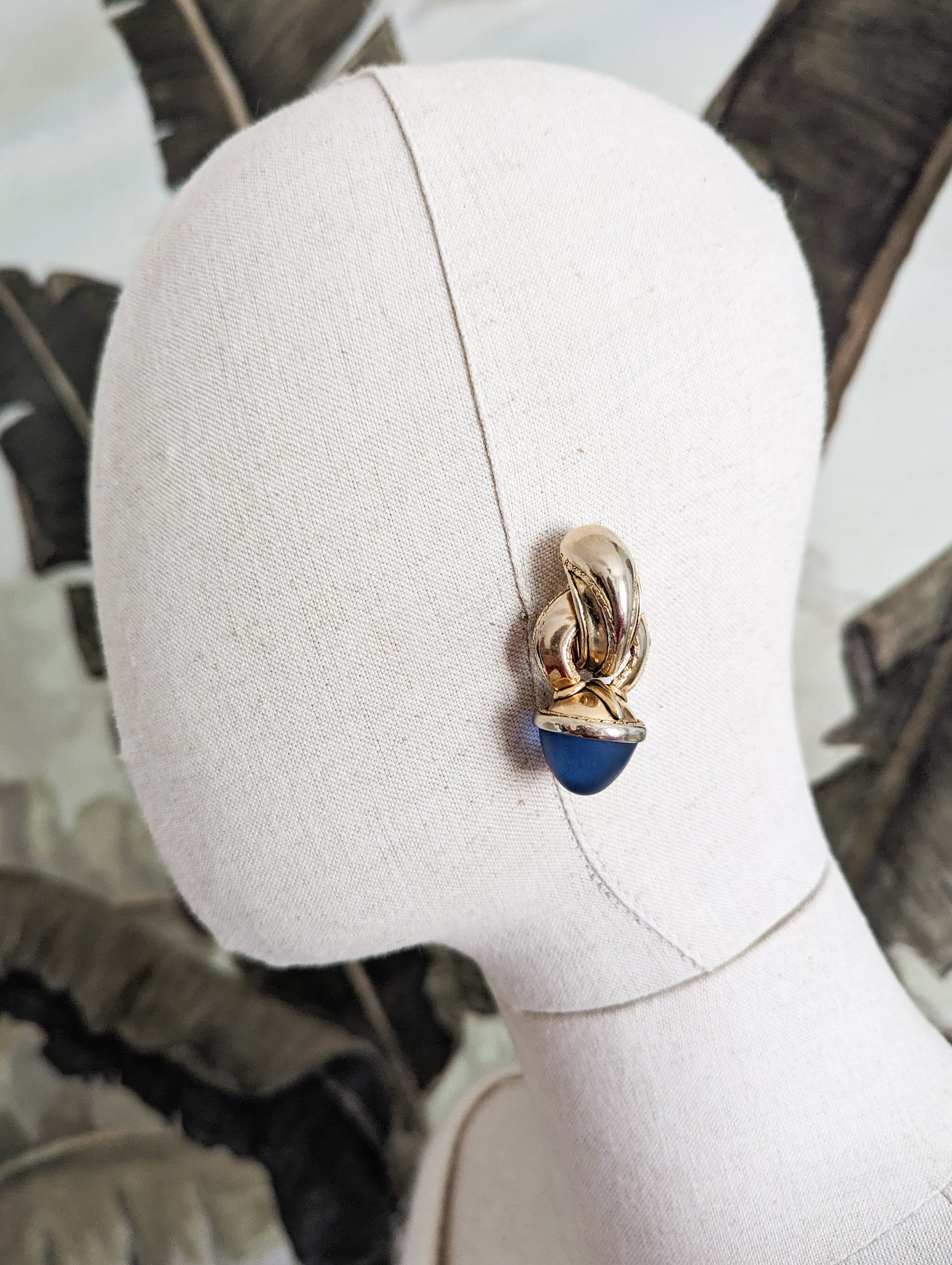 Un grand cabochon bleu mat et transparent fini chaque boucle. C'est un design typique de cette époque, où le parfum Boucheron était très à la mode. Le flacon reprenait un dessin semblable.