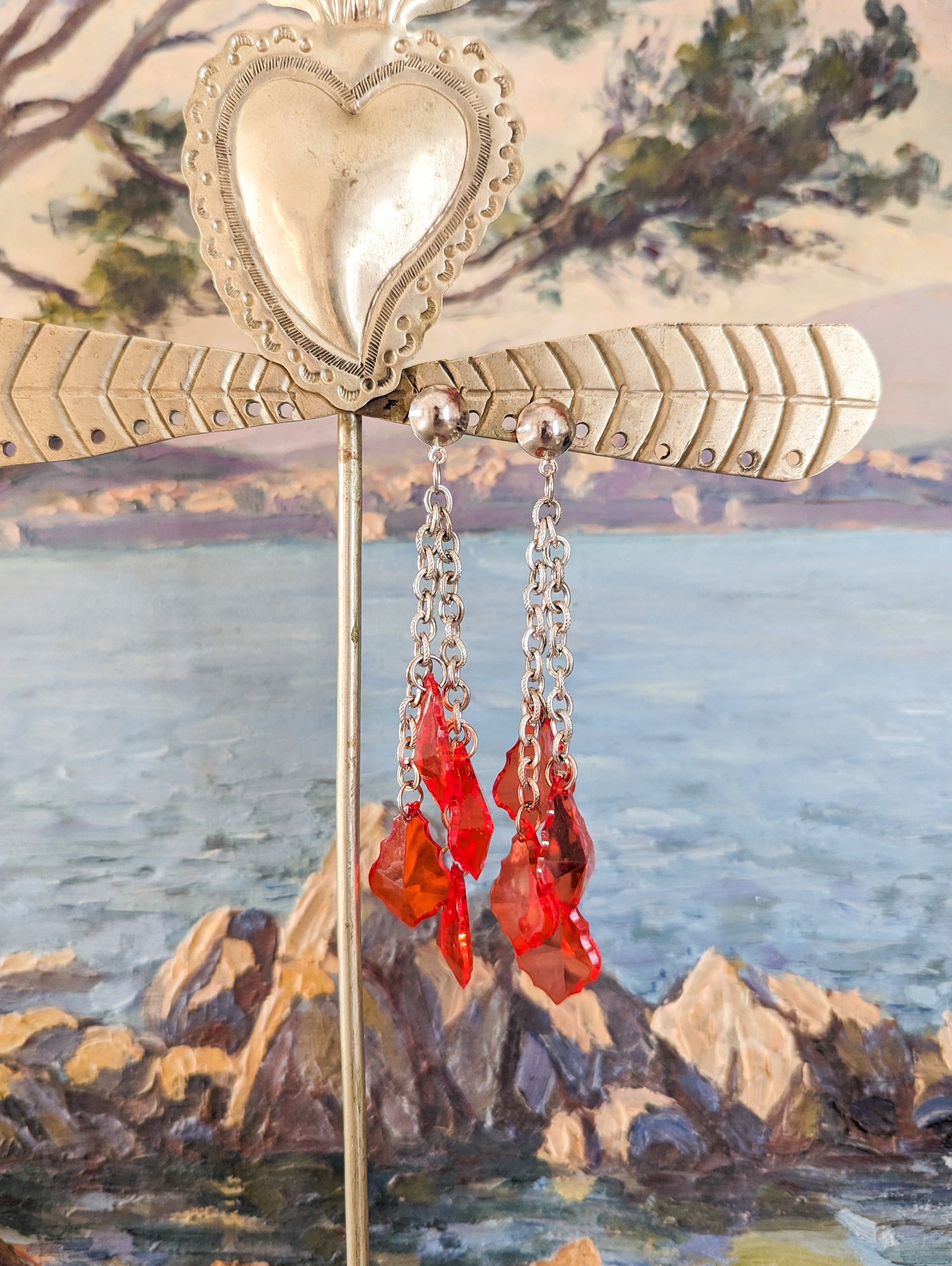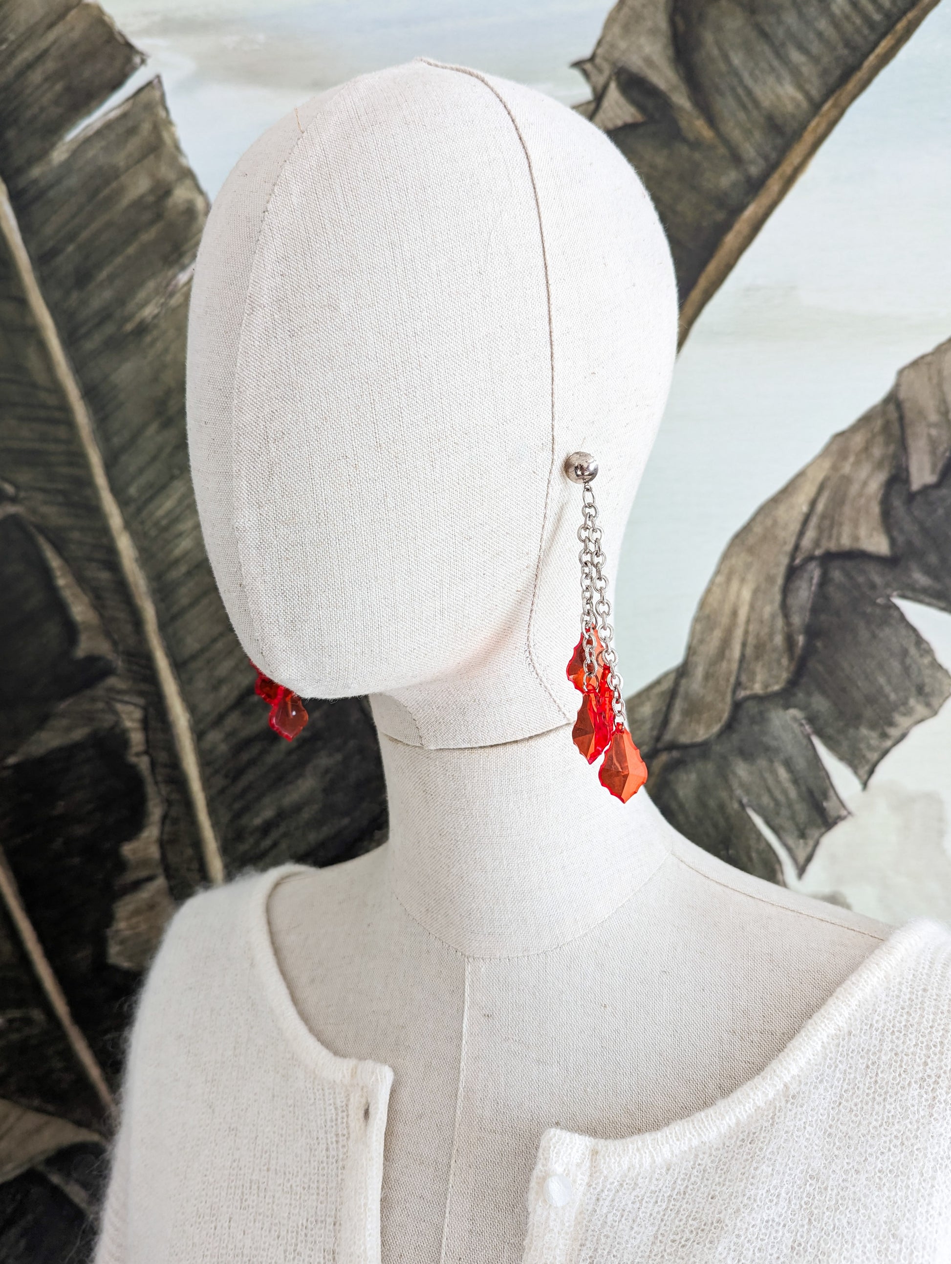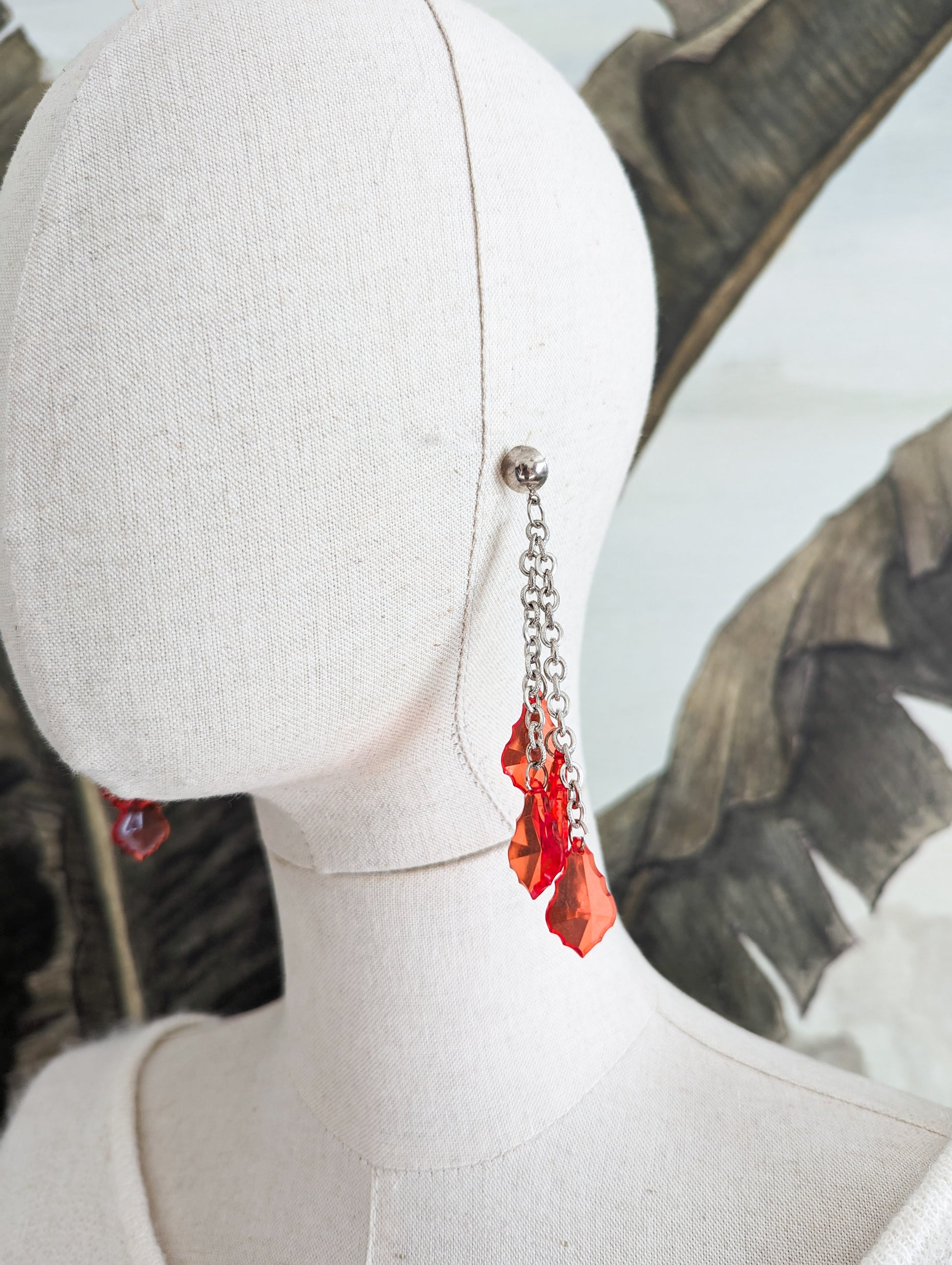 Les boucles sont en métal argenté. Les pampilles sont en perles de plastique rouge vif, transparentes.
