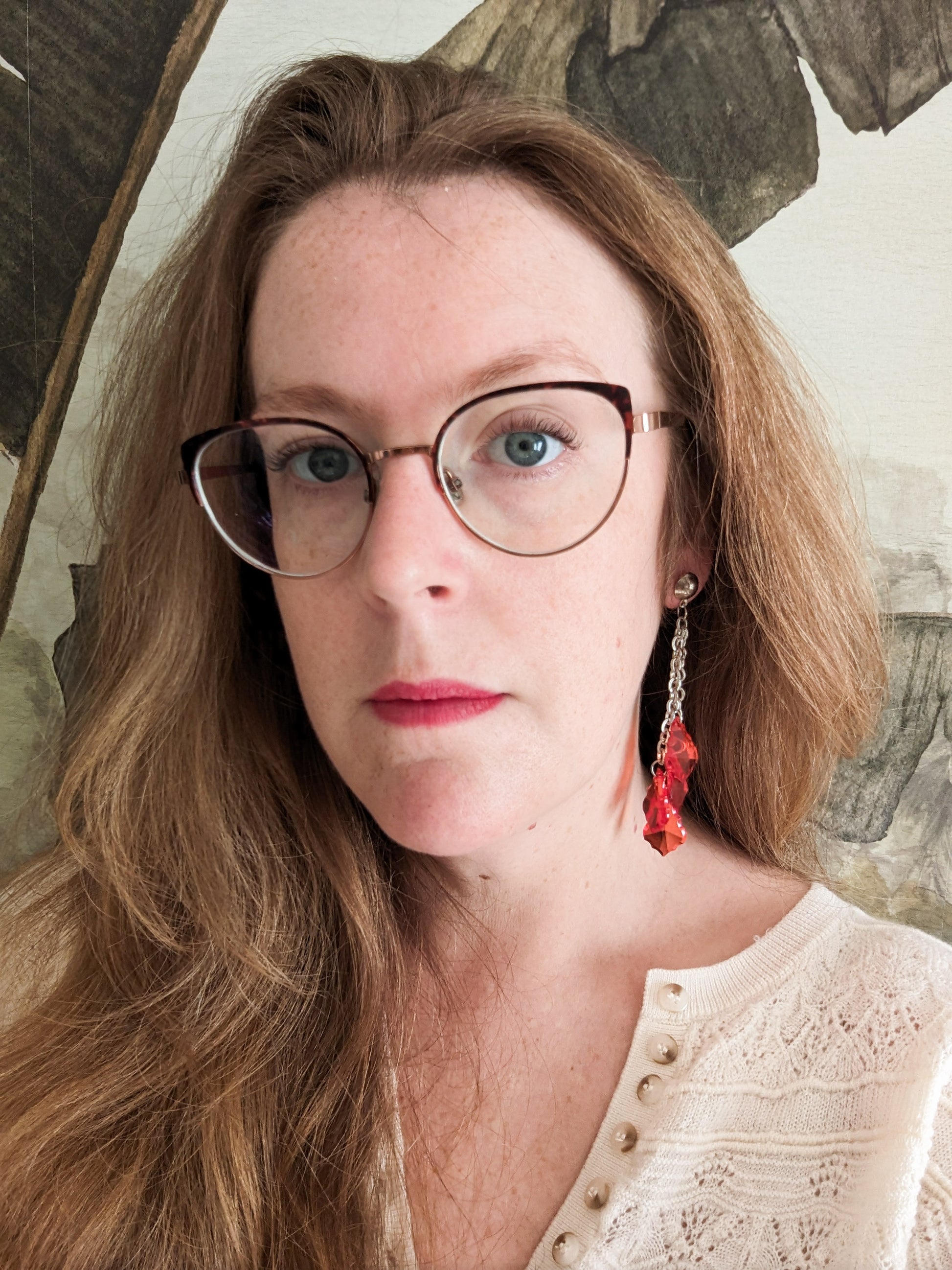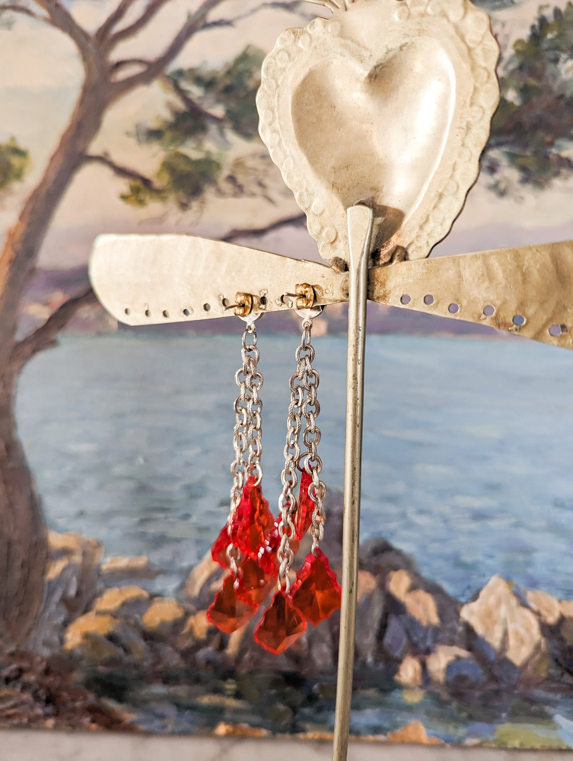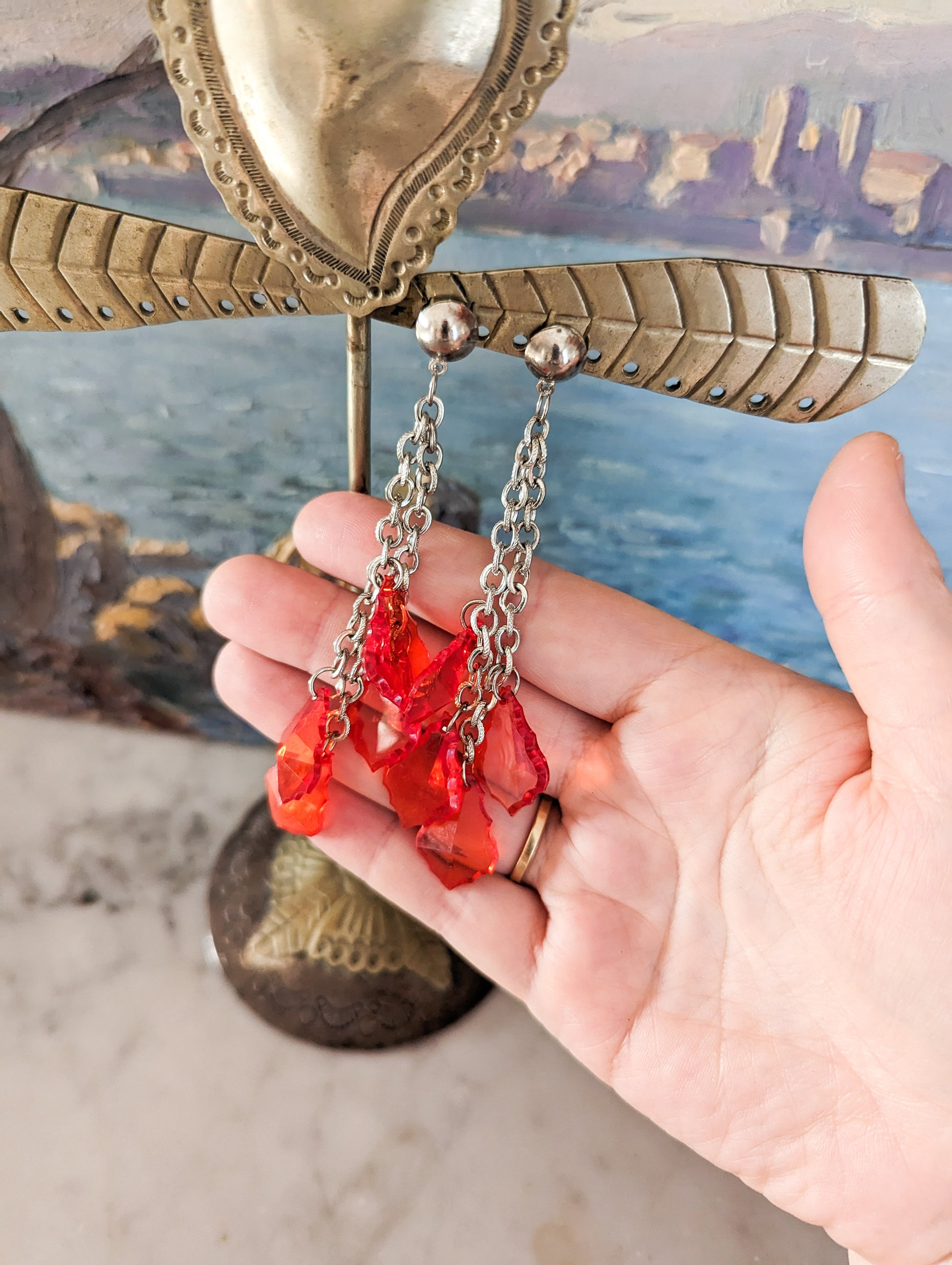 Les boucles sont en métal argenté. Les pampilles sont en perles de plastique rouge vif, transparentes.