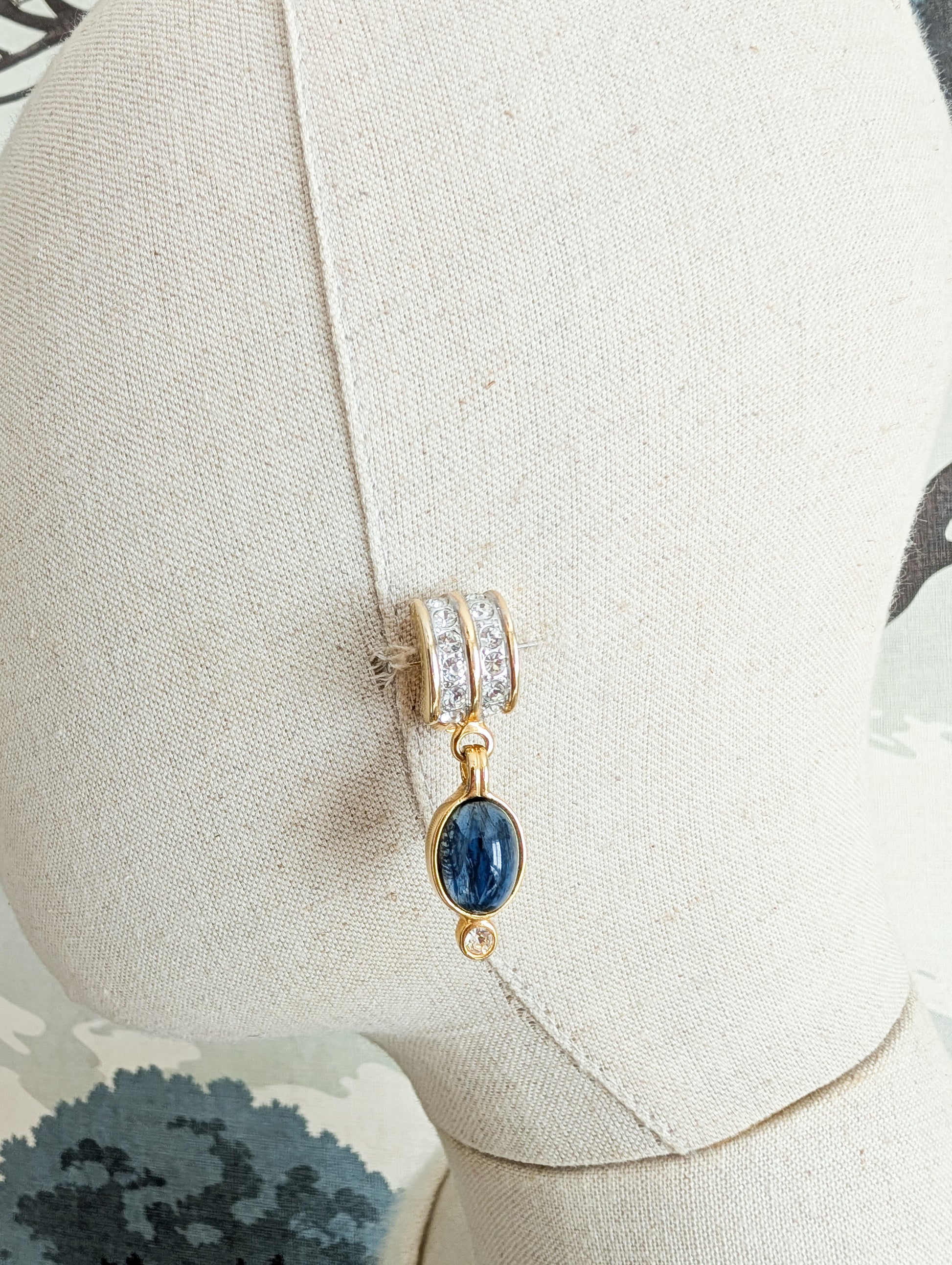 Les boucles sont en métal doré. Elles sont pavées de strass en verre blanc et d'un beau cabochon en verre bleu.