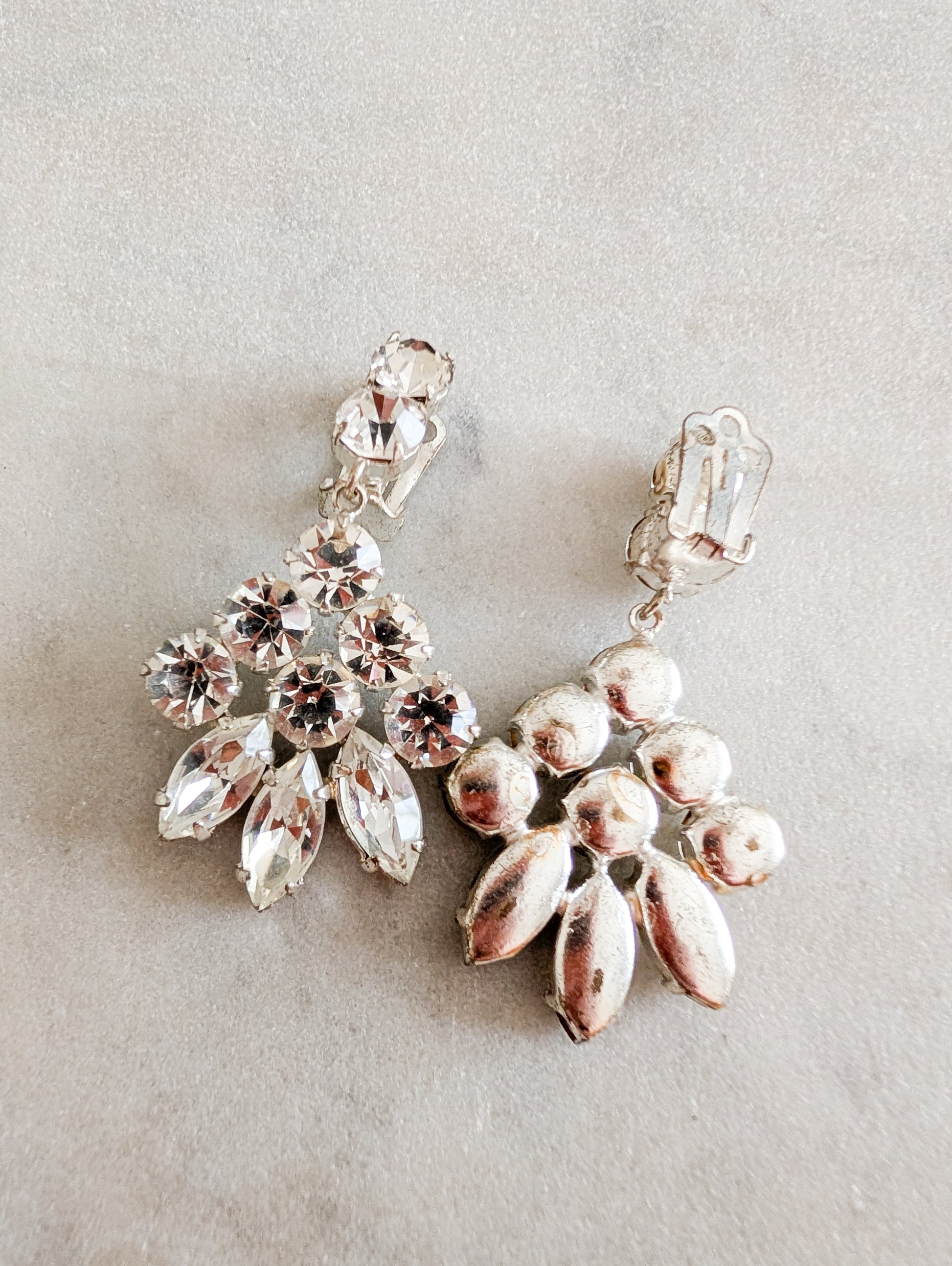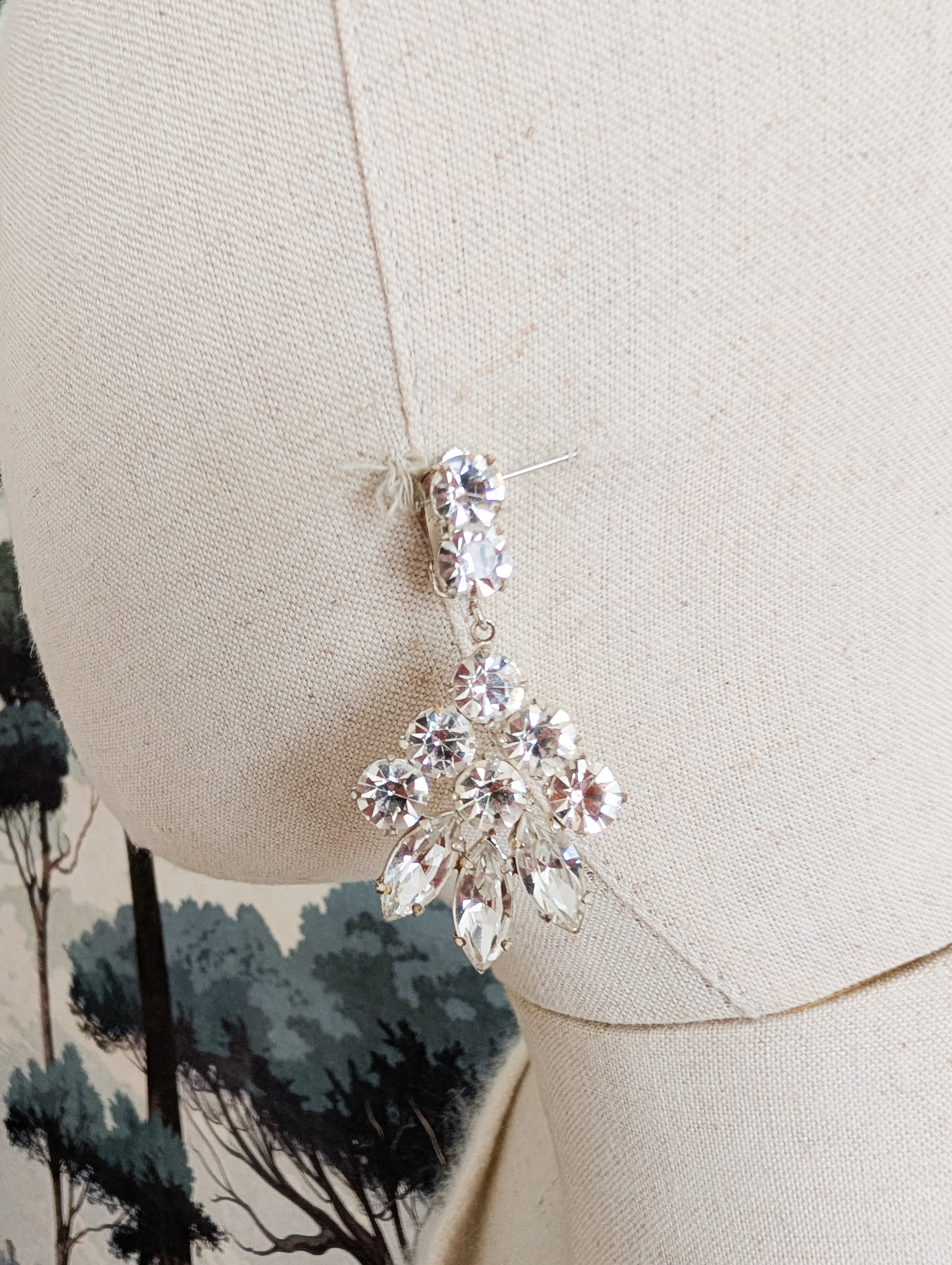 Les boucles sont en métal argenté. Elles sont pavées de strass en verre blanc.