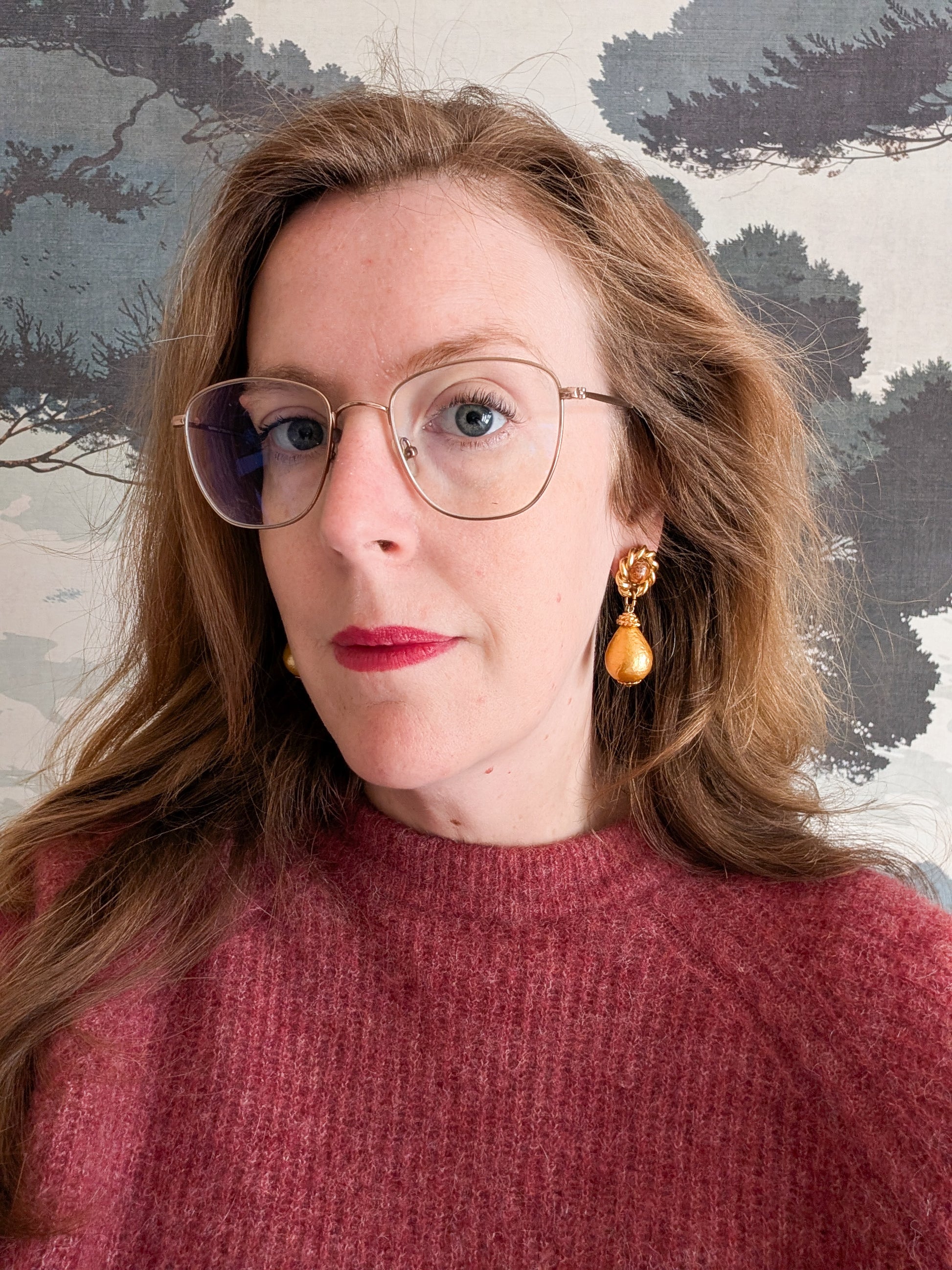 Les boucles présente une attache en métal doré pavée d'une pierre en résine ambrée. Très belle perle en papier mâché doré (elle ressemble à du verre ou de la résine mais est super légère! Vrai travail d'artisan ✨).