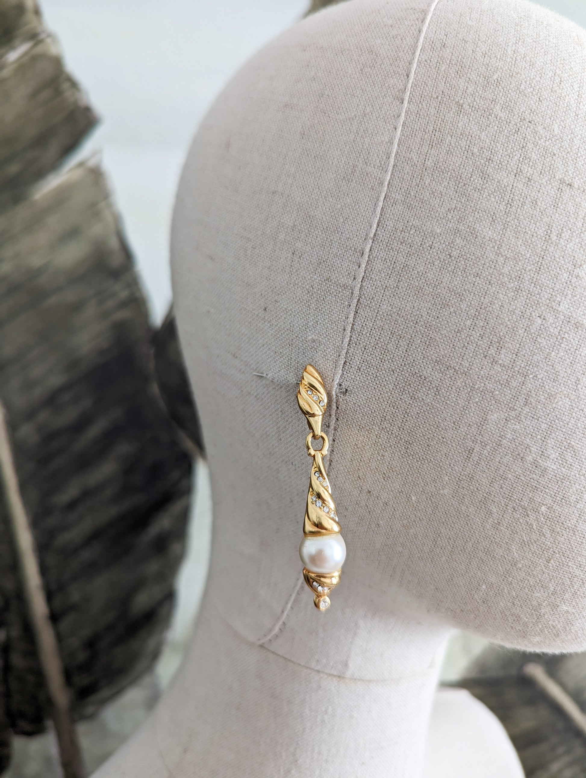 Les boucles d'oreilles sont en métal doré. Elles portent une perle fantaisie nacrée. Pavage de strass en verre blanc.