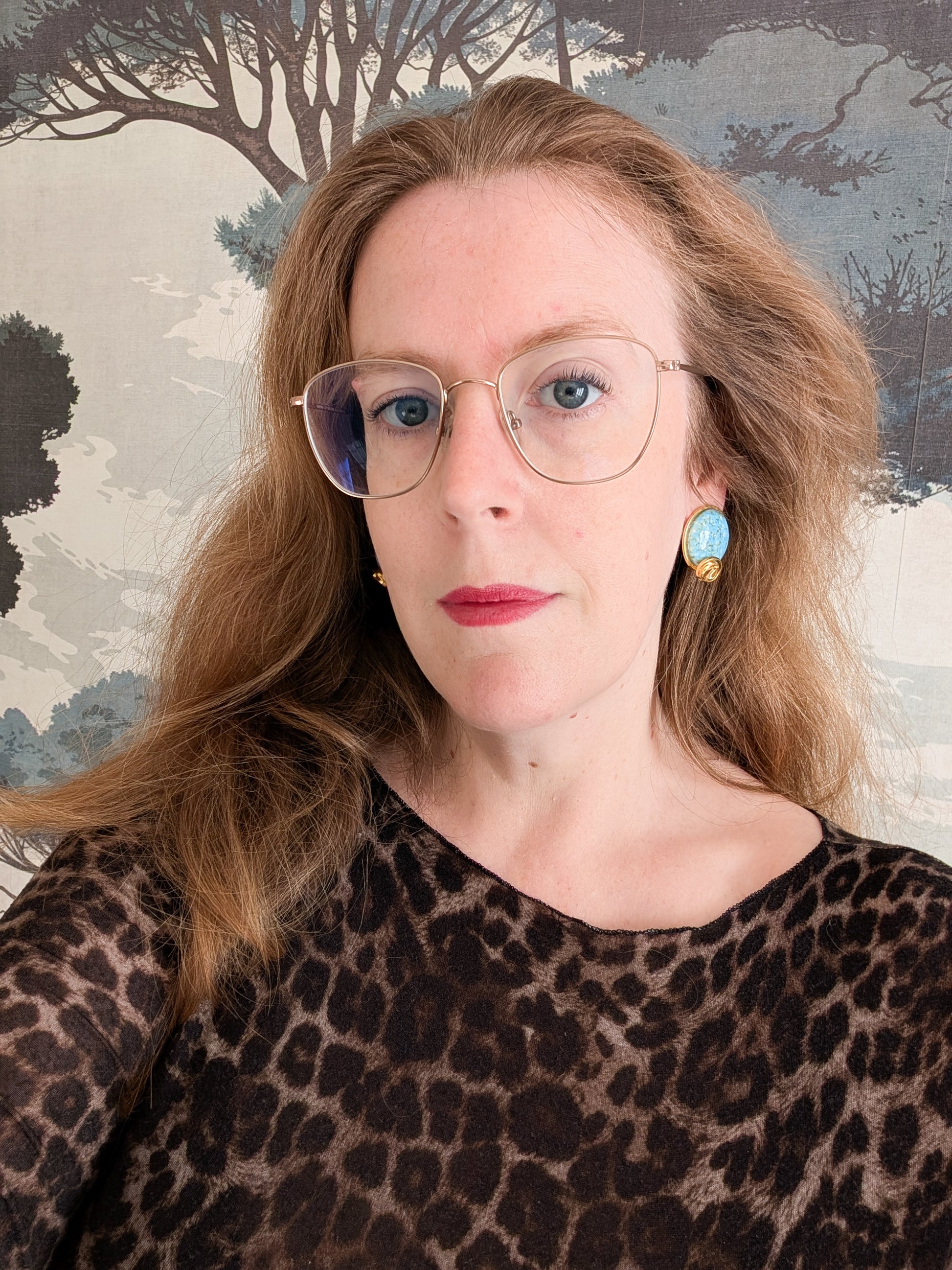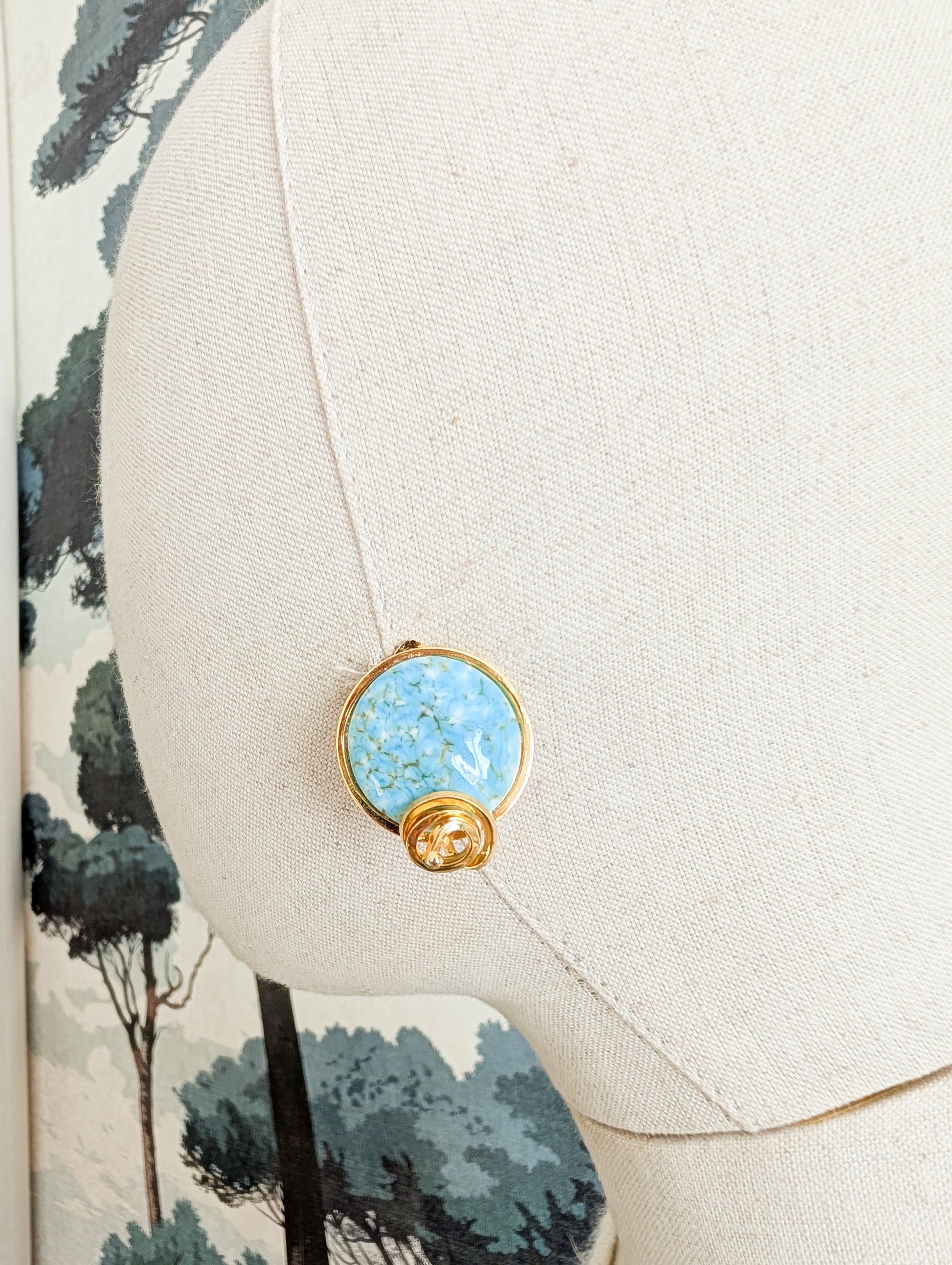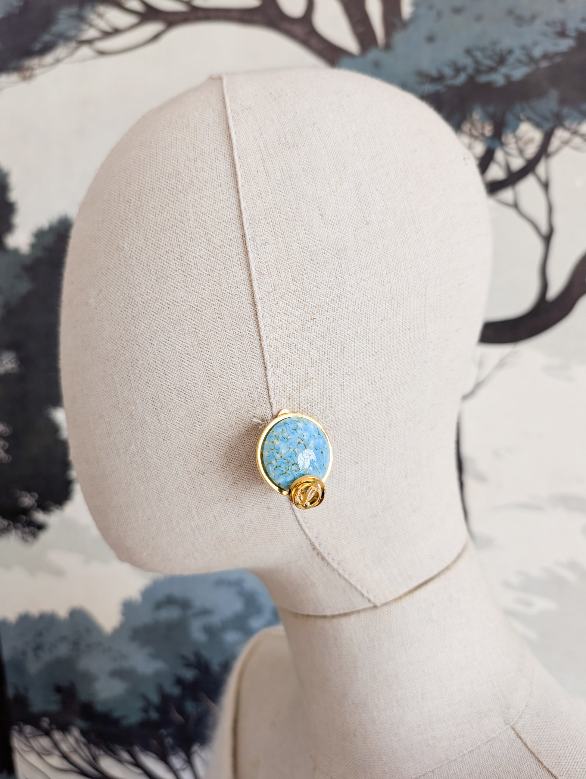 Les boucles sont en métal doré. La monture de chaque boucle porte un cabochon en pâte de verre bleu.