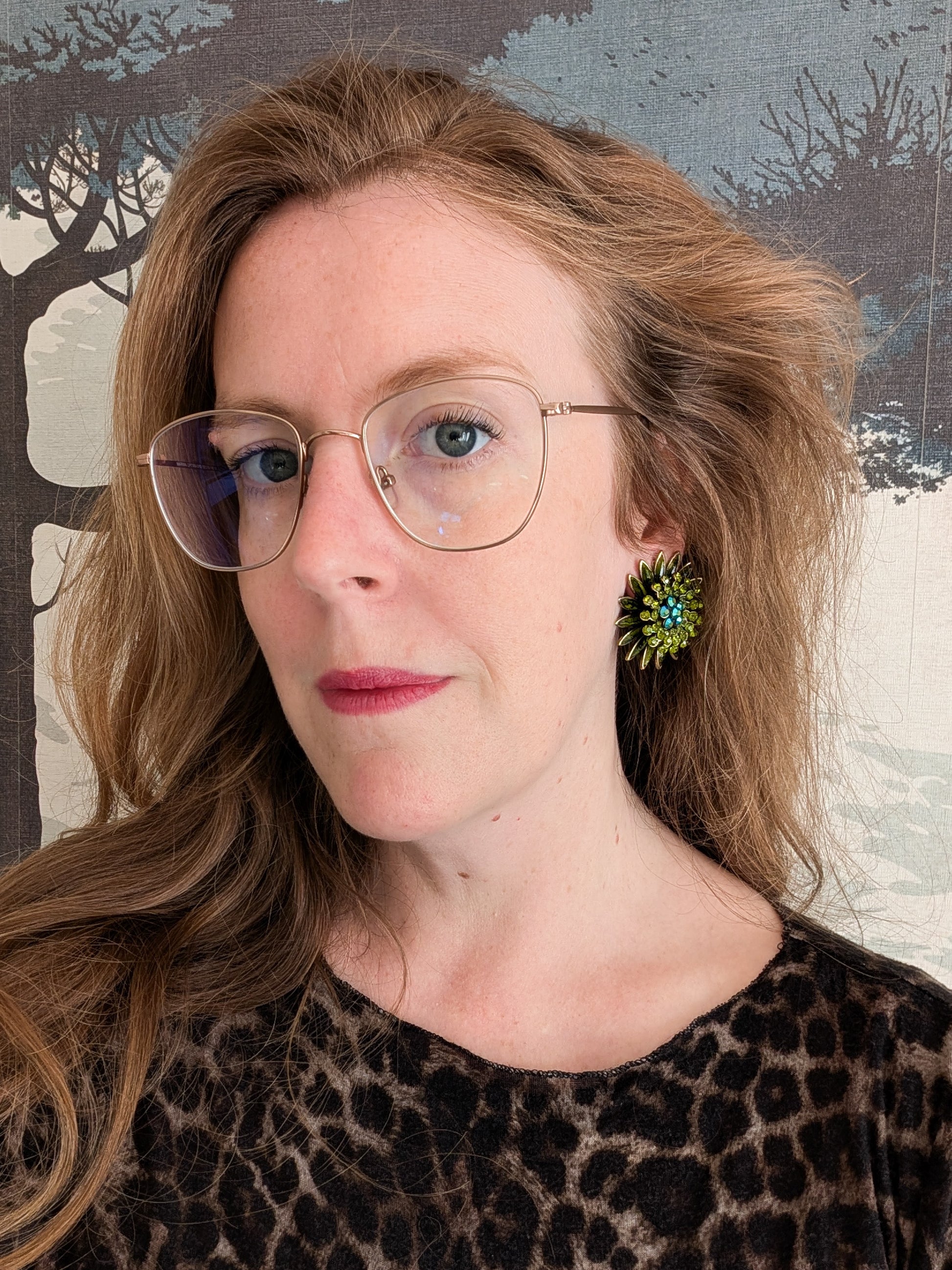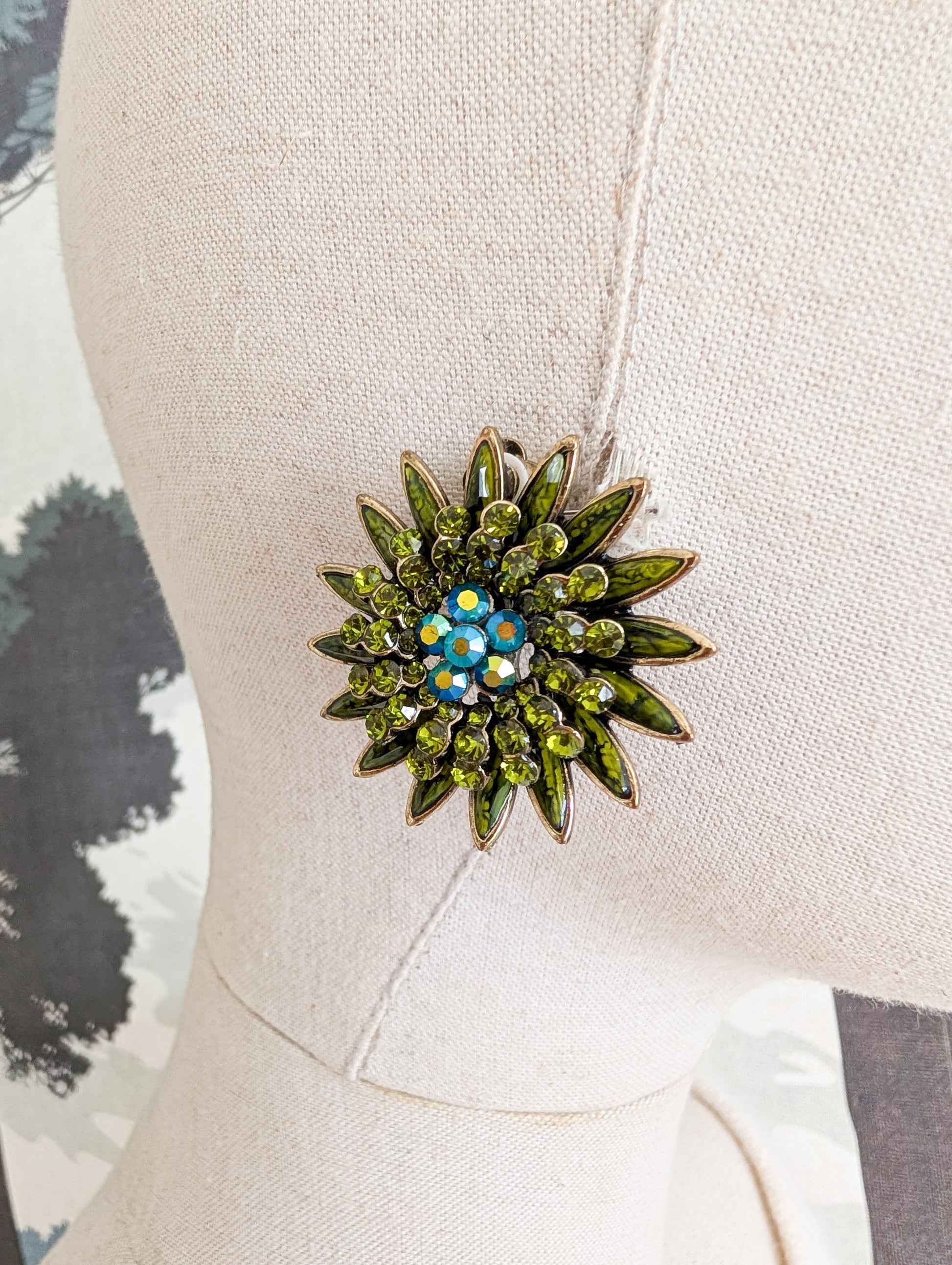 Les boucles sont en métal doré. Les pétales sont recouvertes de pierre en résine verte. Le cœur de la fleur est richement décoré de strass verts en verre et cristal.