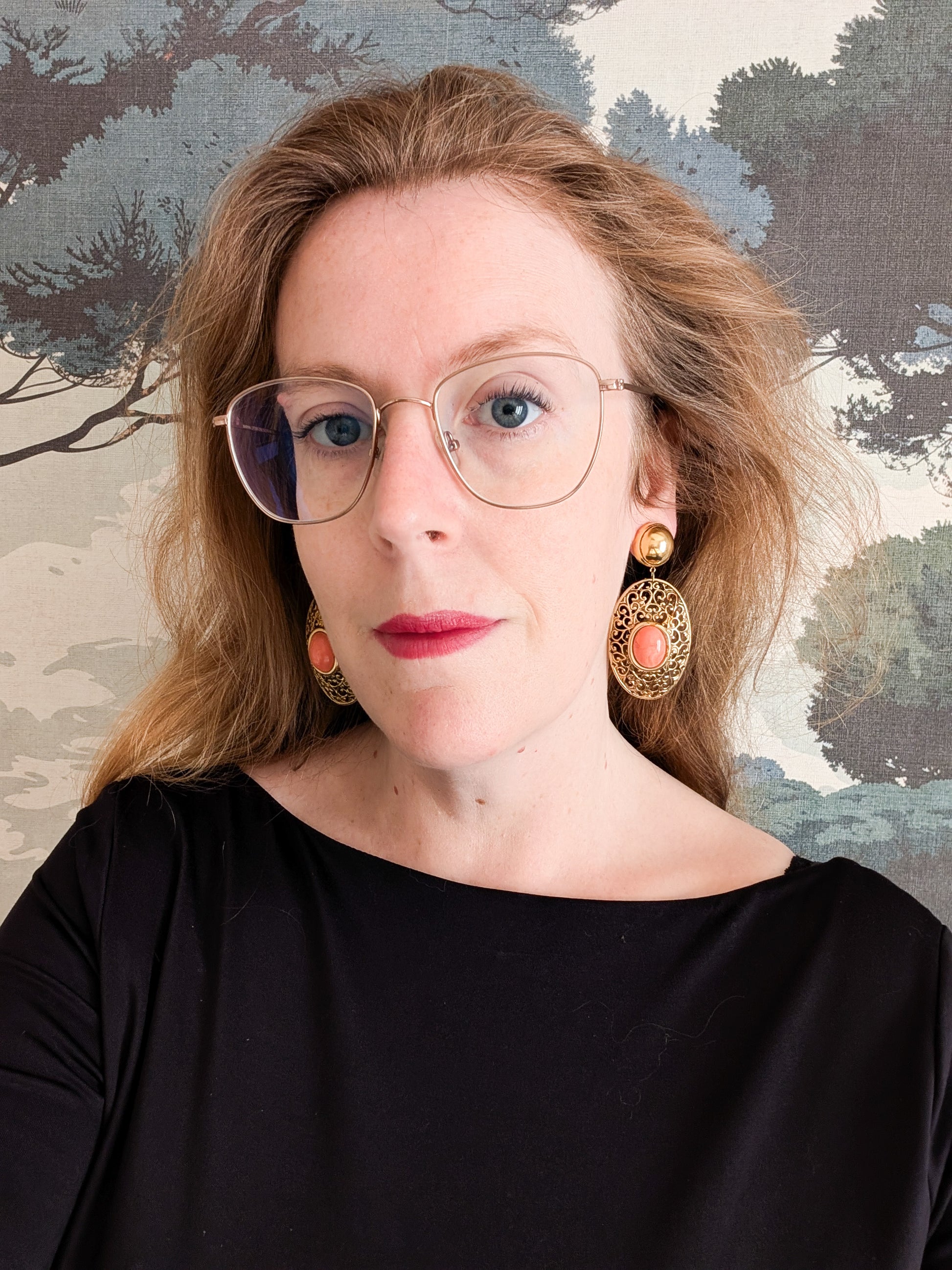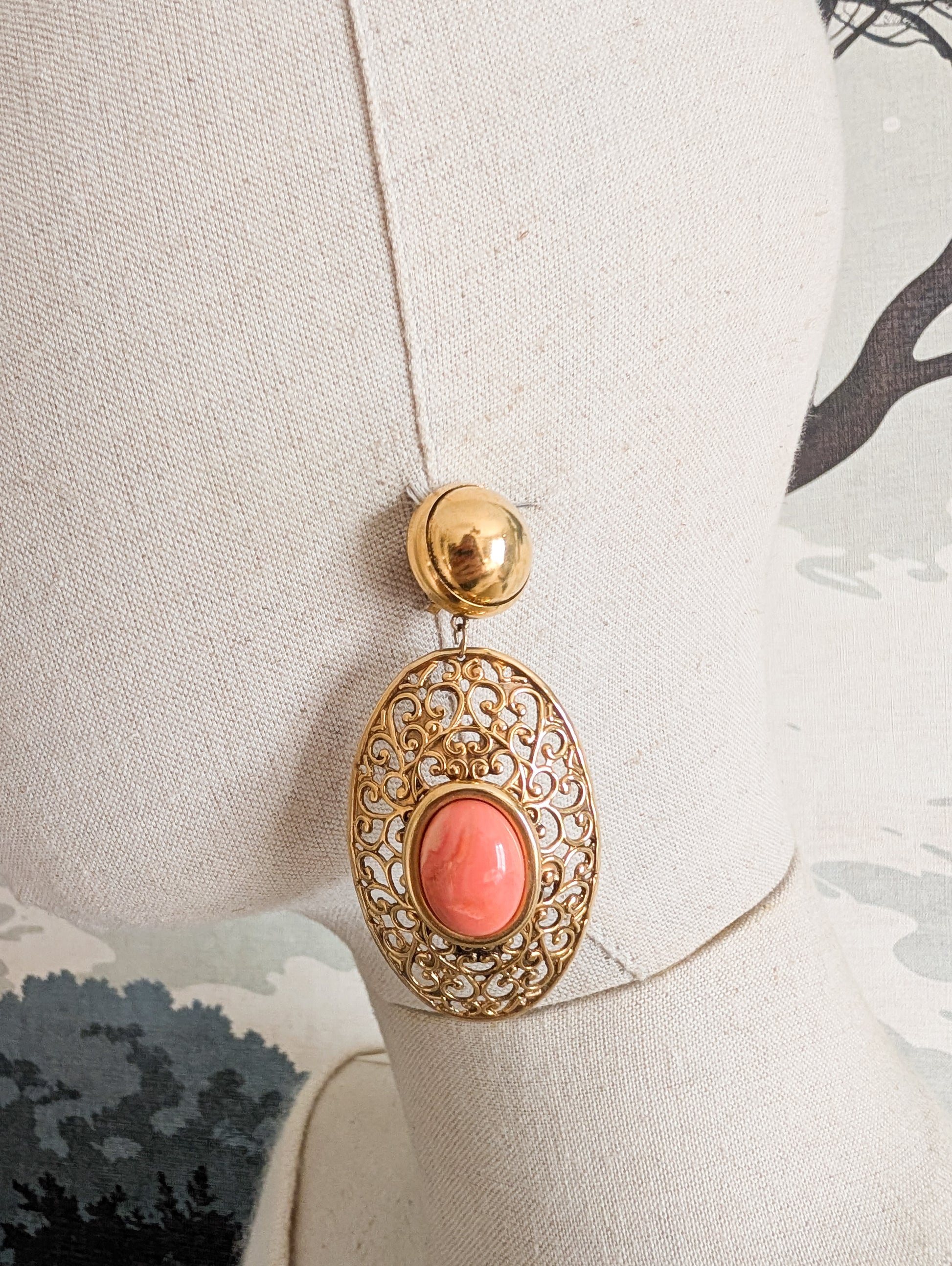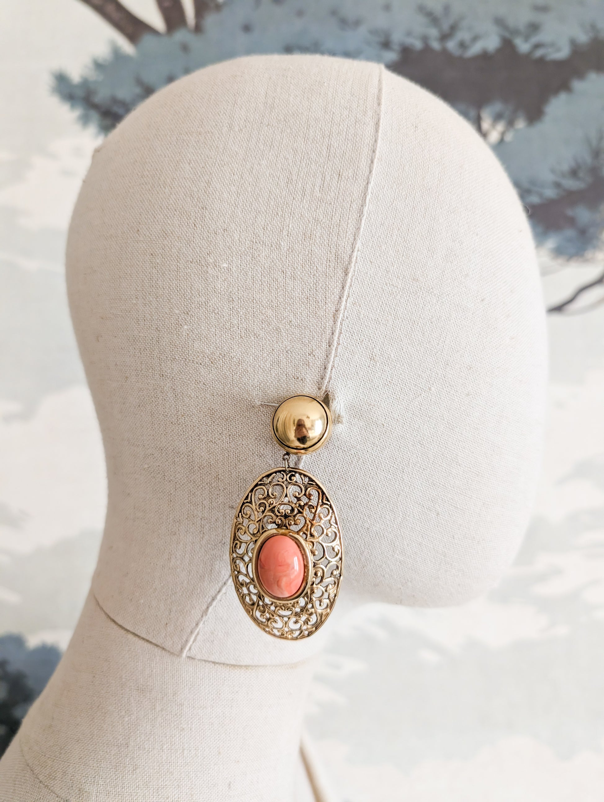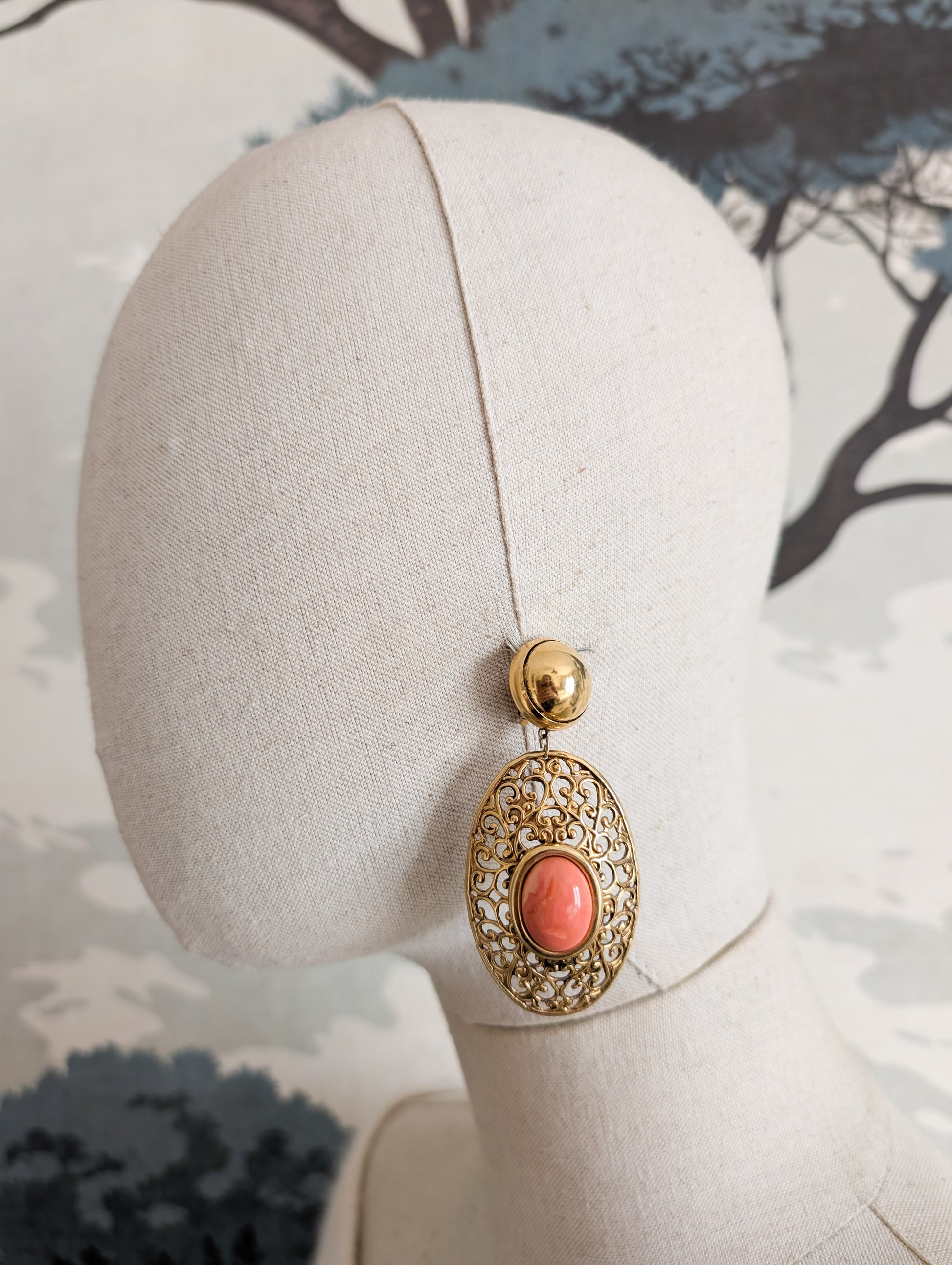 Les boucles sont en métal doré. Elles sont pavées d'un grand cabochon corail.