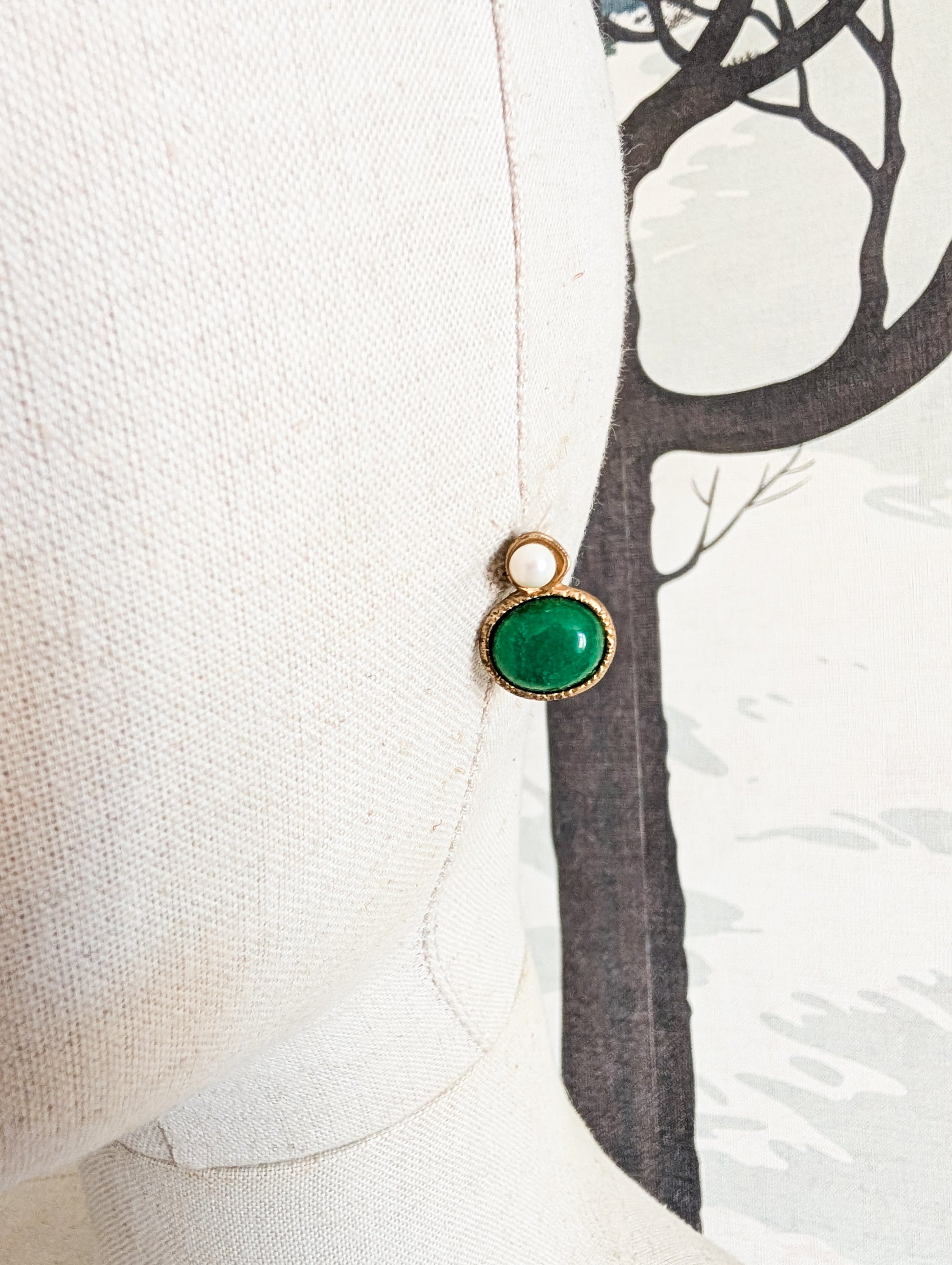 Les boucles sont en métal doré, pavée d'une perle nacrée fantaisie et d'un cabochon en verre vert.