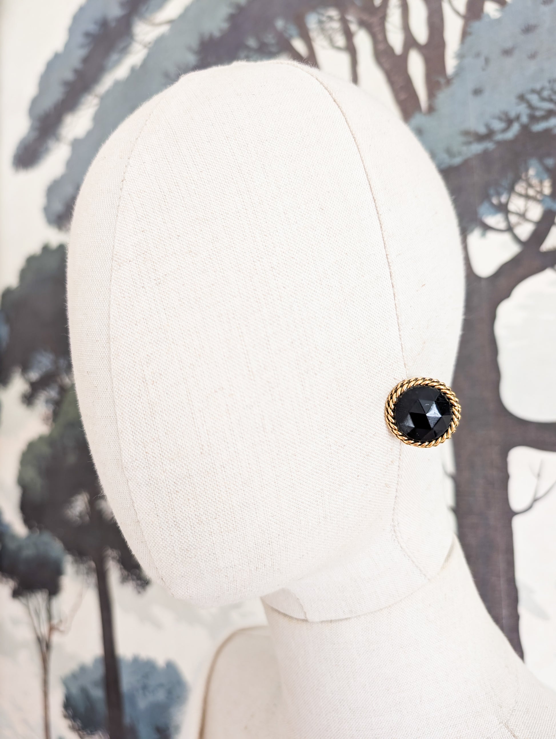 La monture est en métal doré pavée d'une pierre à facettes en verre.