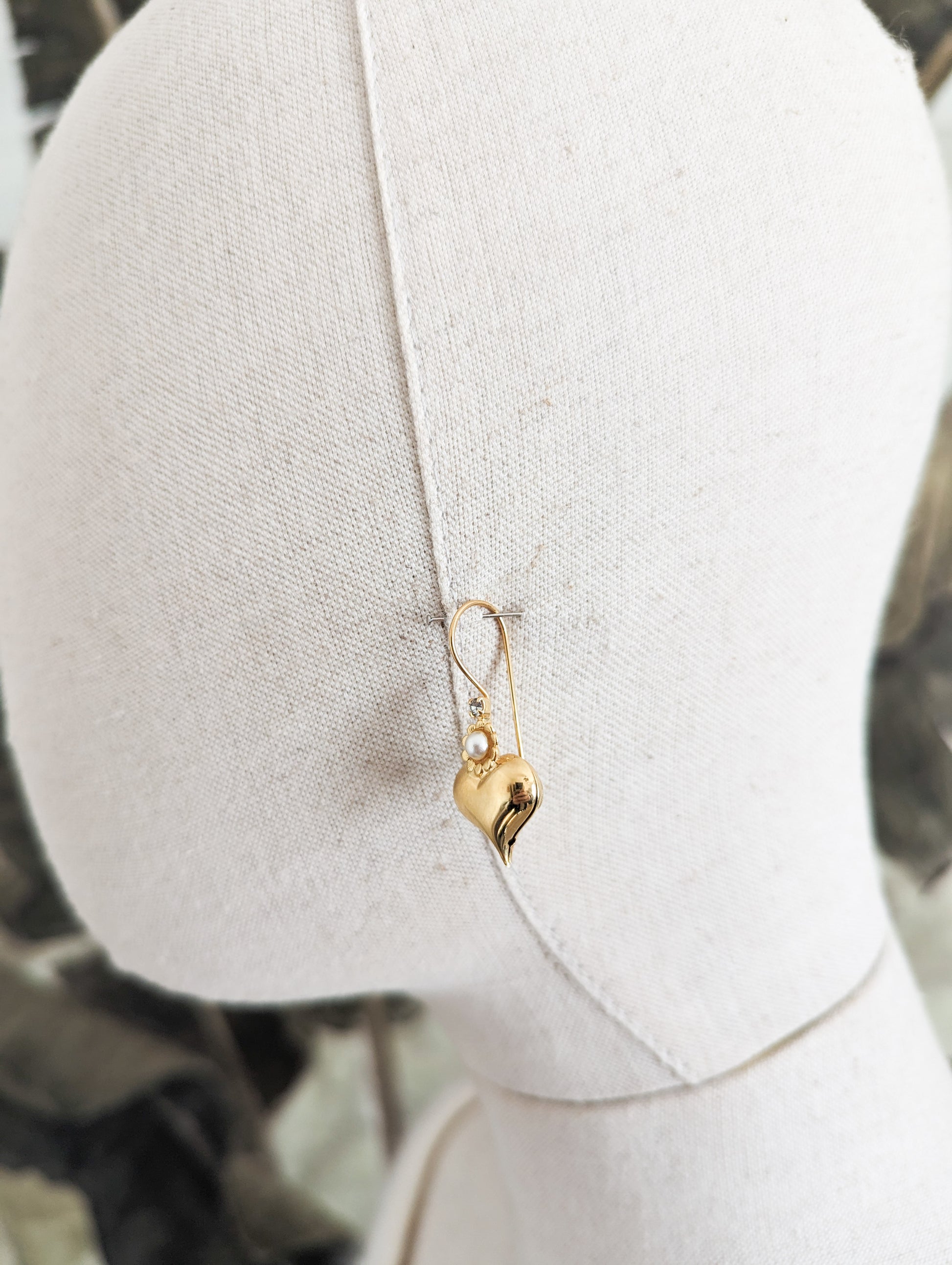 Les boucles sont en metal doré. Sur chaque boucle une petite fleur avec une perle fantaisie au centre. Un petit strass en verre blanc vient renvoyer la lumière. J'aime beaucoup le dessin des cœurs.