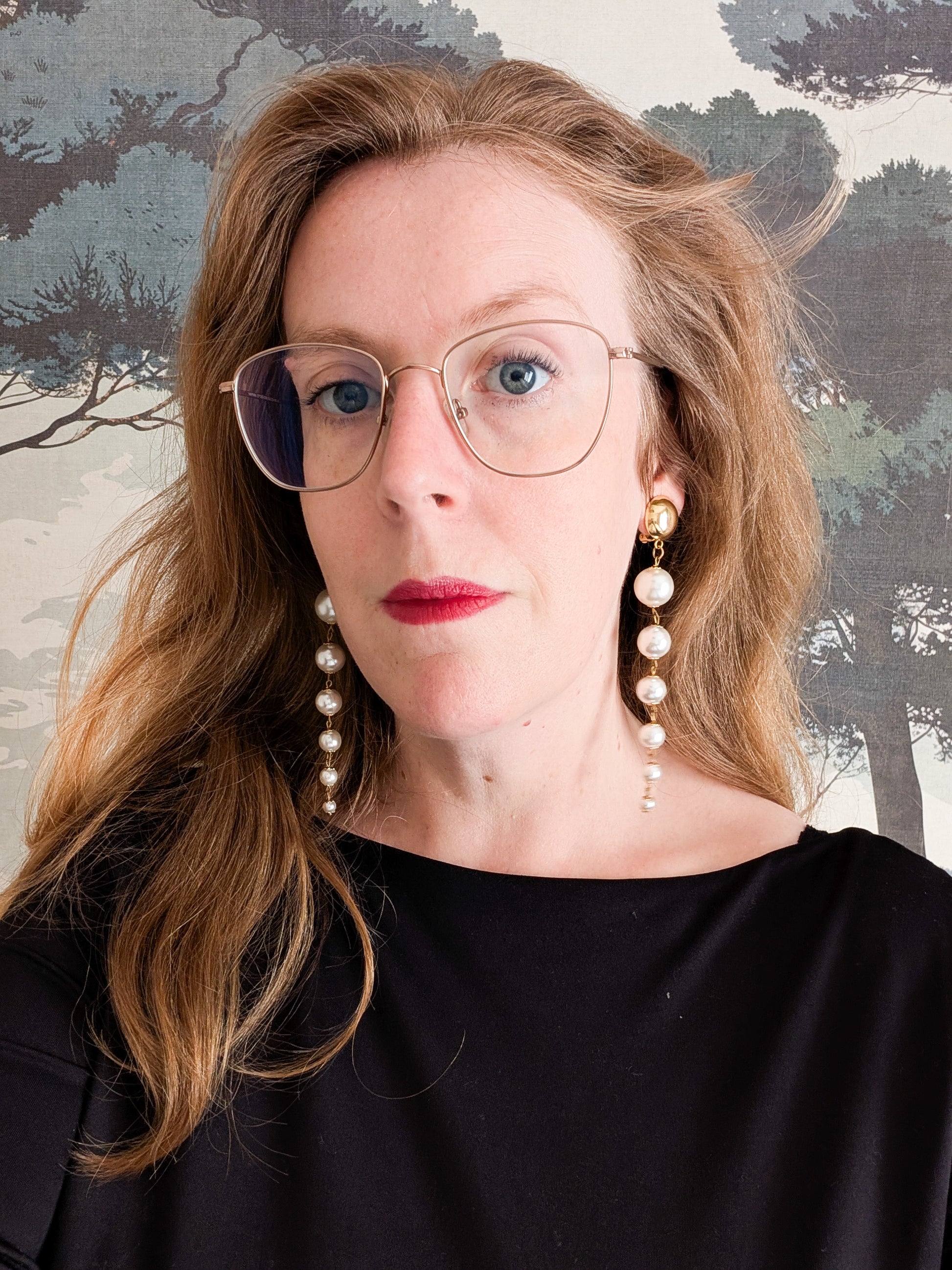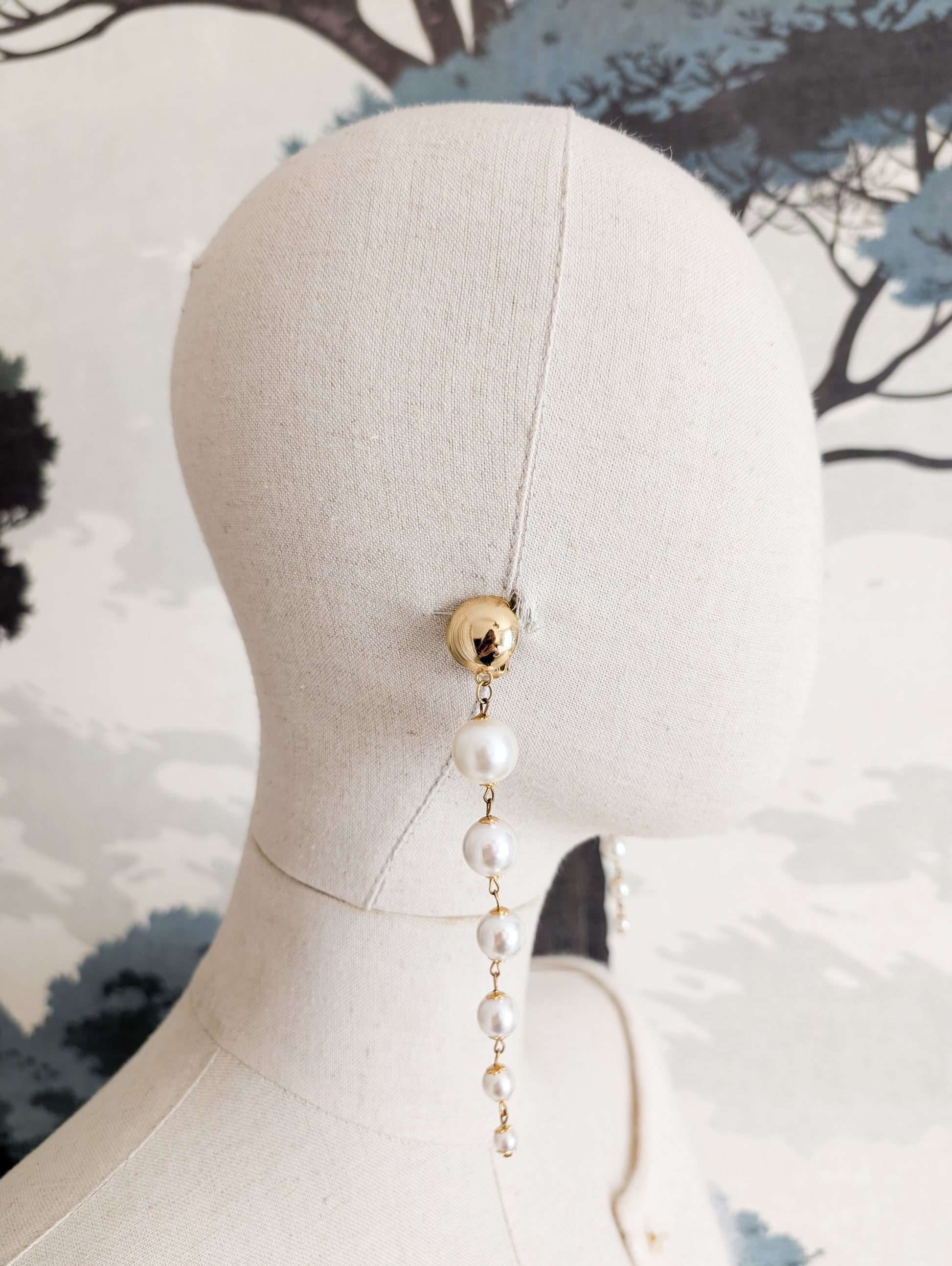 Les boucles présentent une attache en métal doré et des perles fantaisies en plastique blanc nacré.
