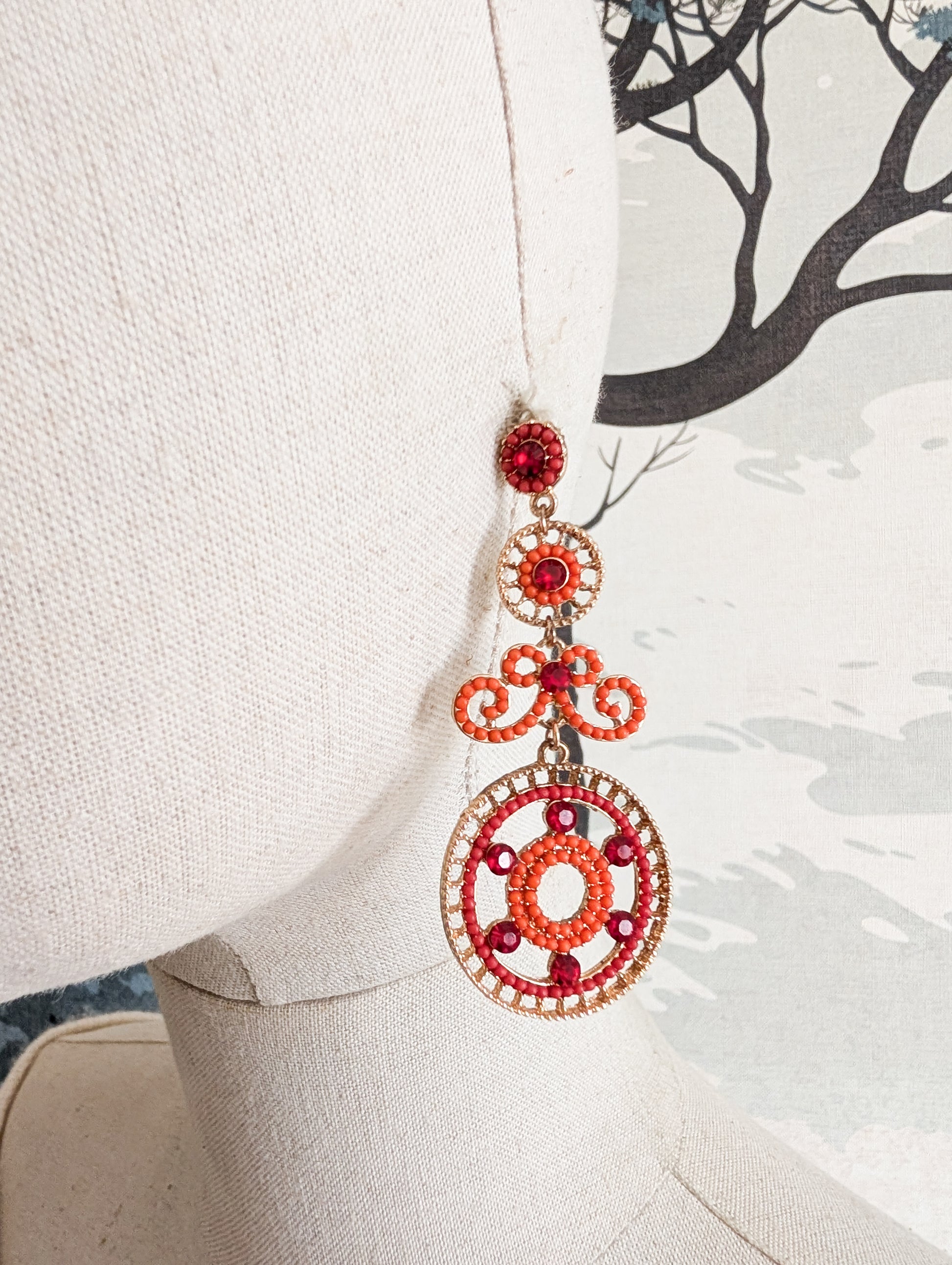 Les boucles sont en métal dore, pavées de petits strass en perles rouges.