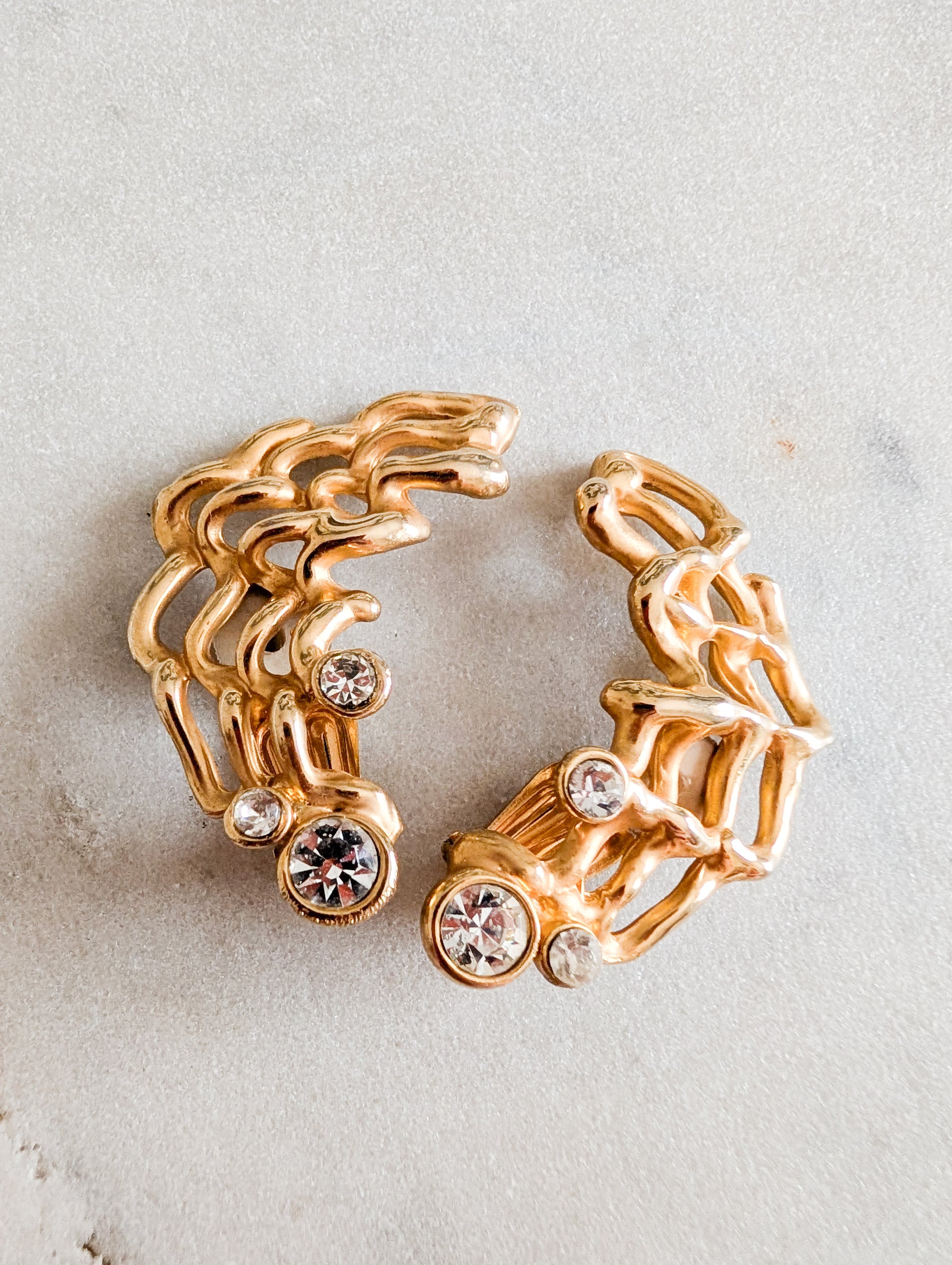 Magnifique design, très sculpturale. Les boucles sont en métal doré pavées de strass en verre blanc.