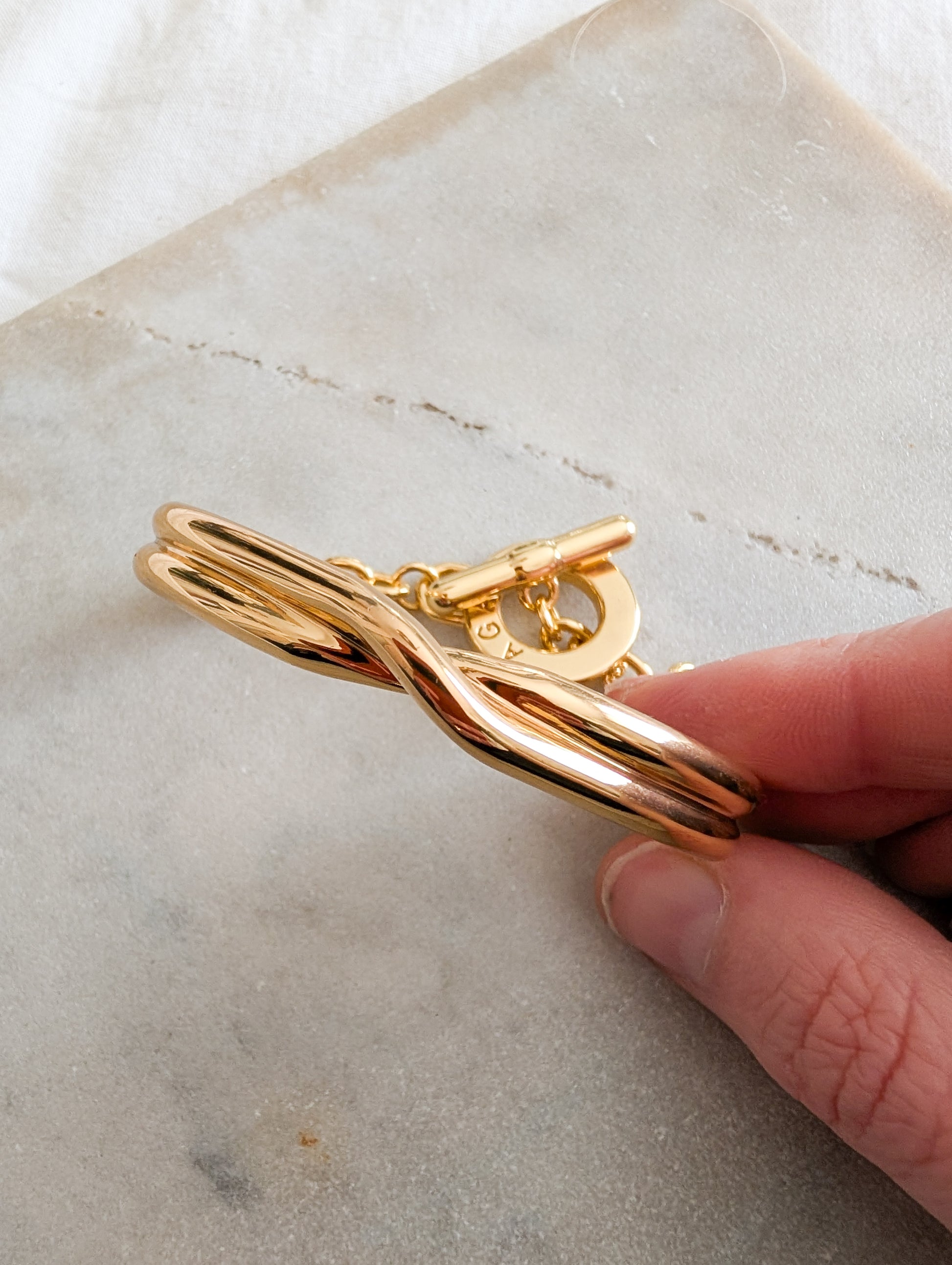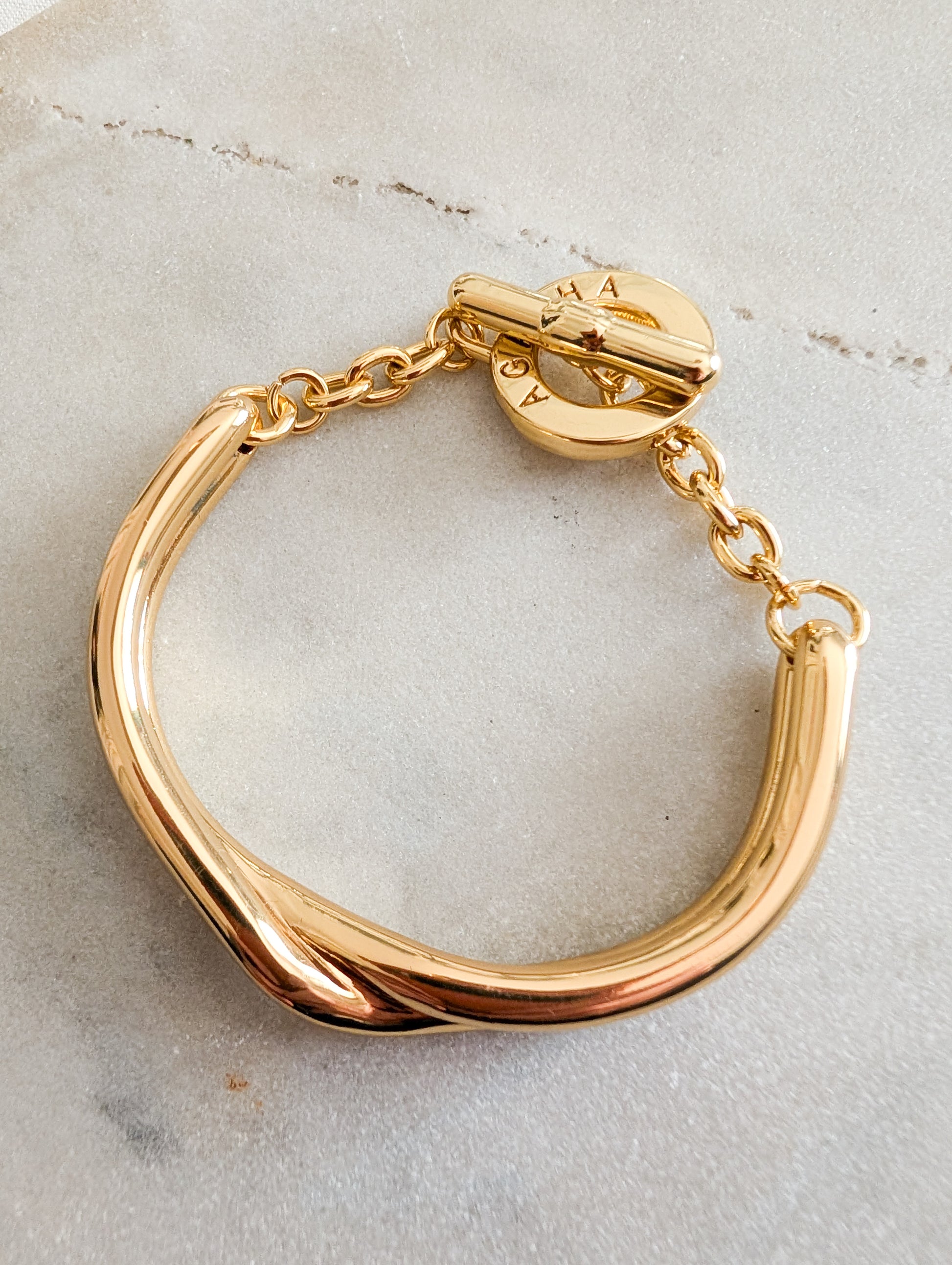 Le bracelet présente un grand élément rigide. Il s'attache par un fermoir bâton tenu par une chaîne forçat. Deux élément iconiques de la maison.