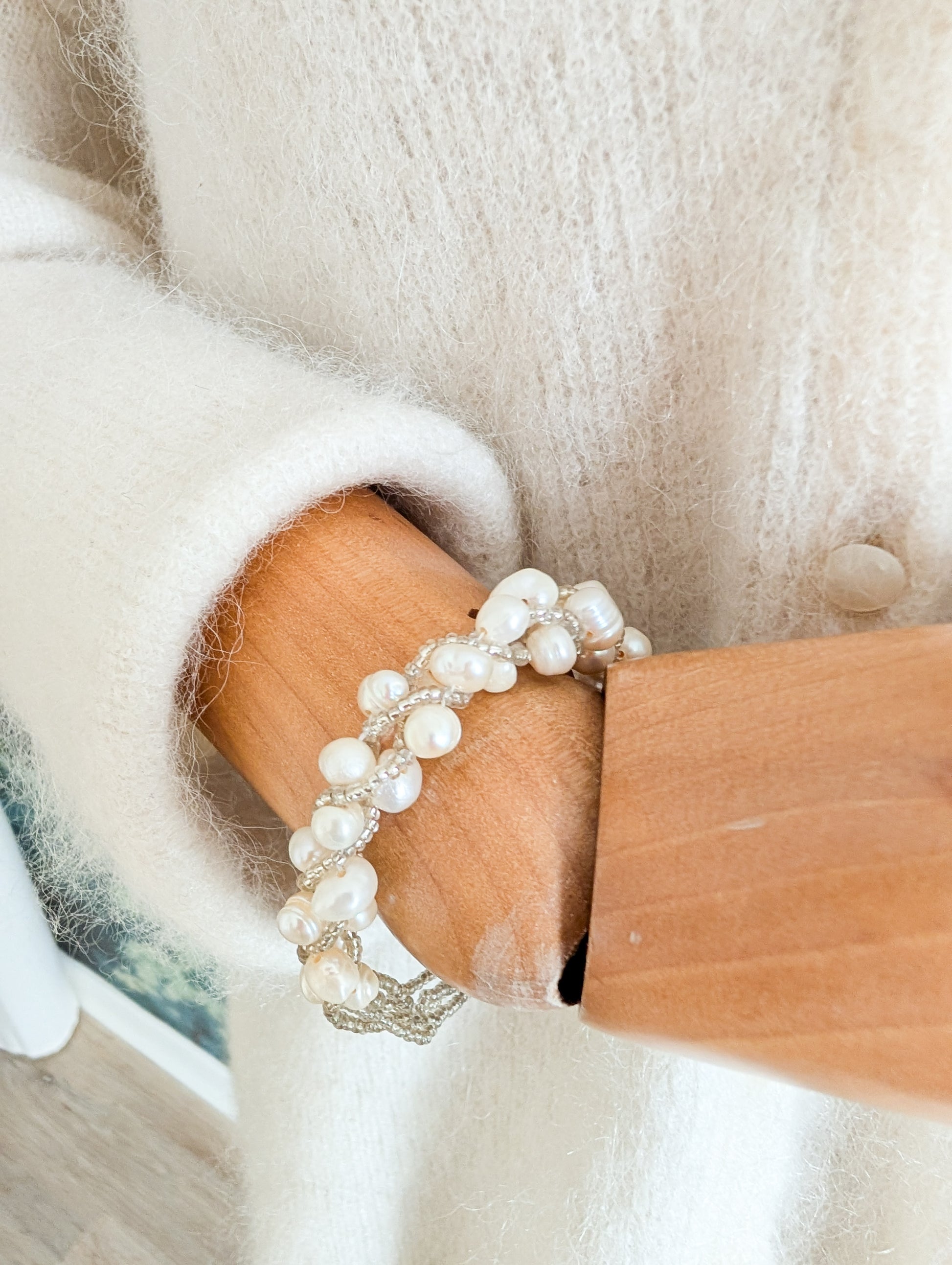 Très joli bracelet de perles composées de véritables perles d'eau douce et de perles de rocailles en verre argenté.