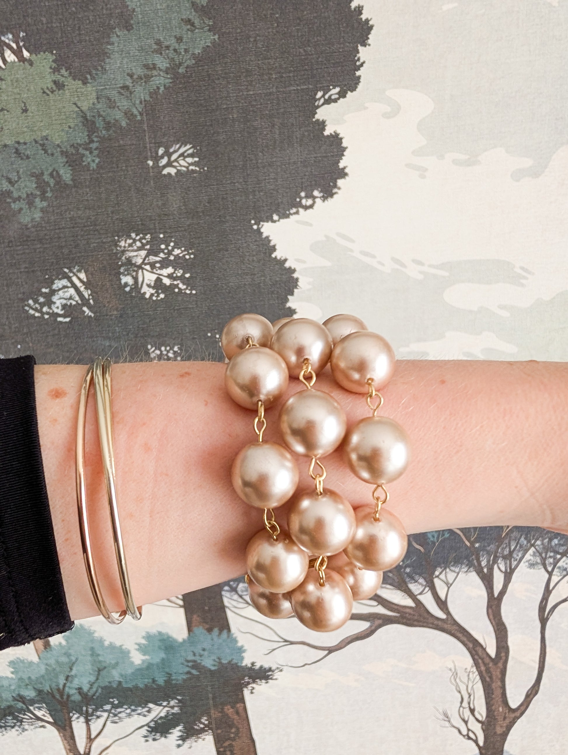 Les perles d'origine étaient rayées, je les ai intégralement changées à l'atelier. Elles ont été remplacées par des perles tchèques datant également des années 80. Les perles sont en verre couleur champagne.