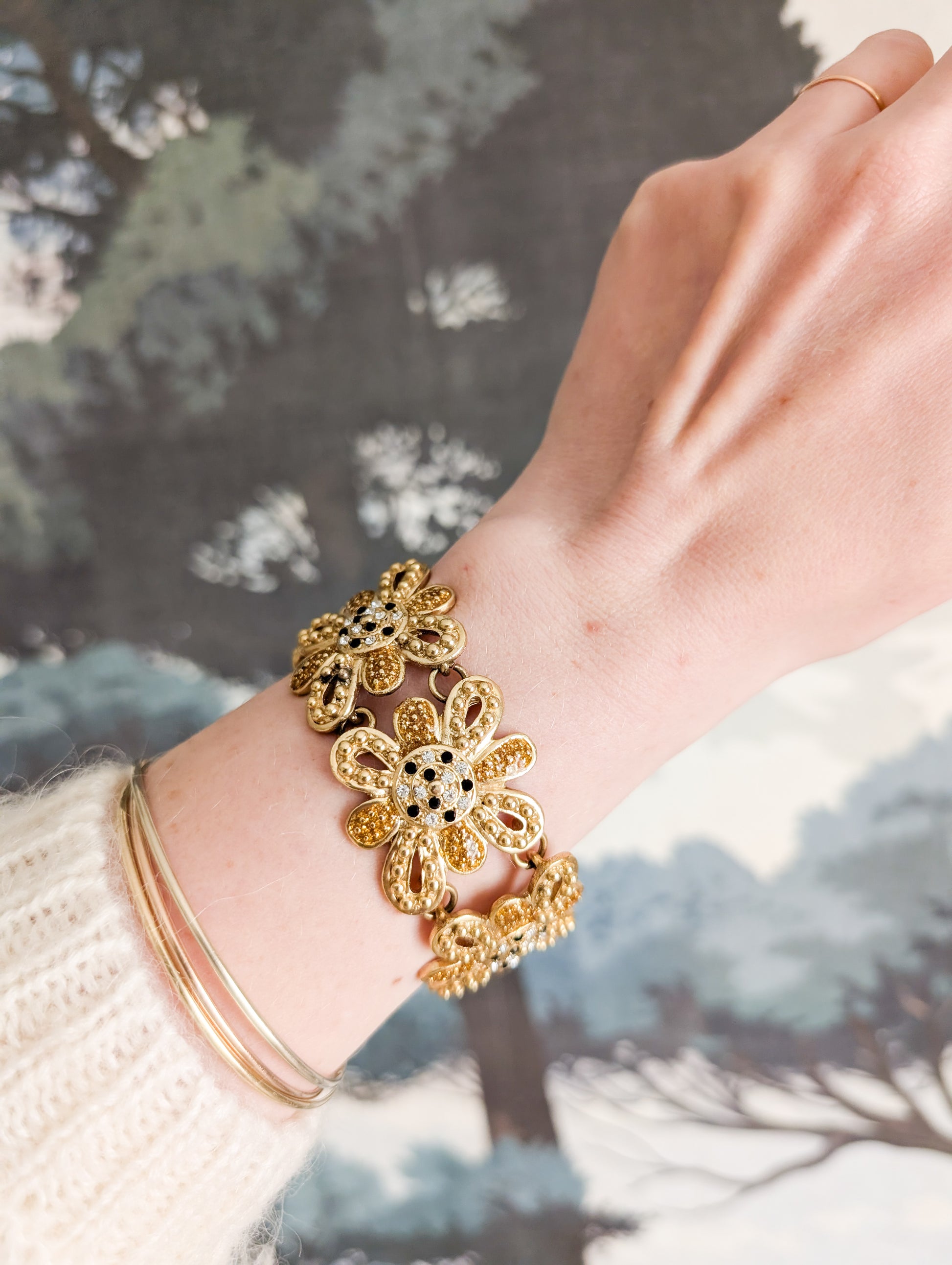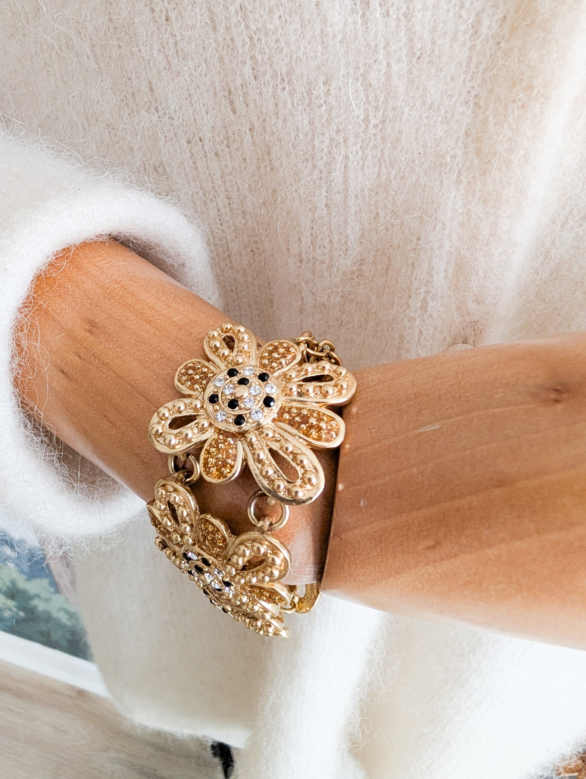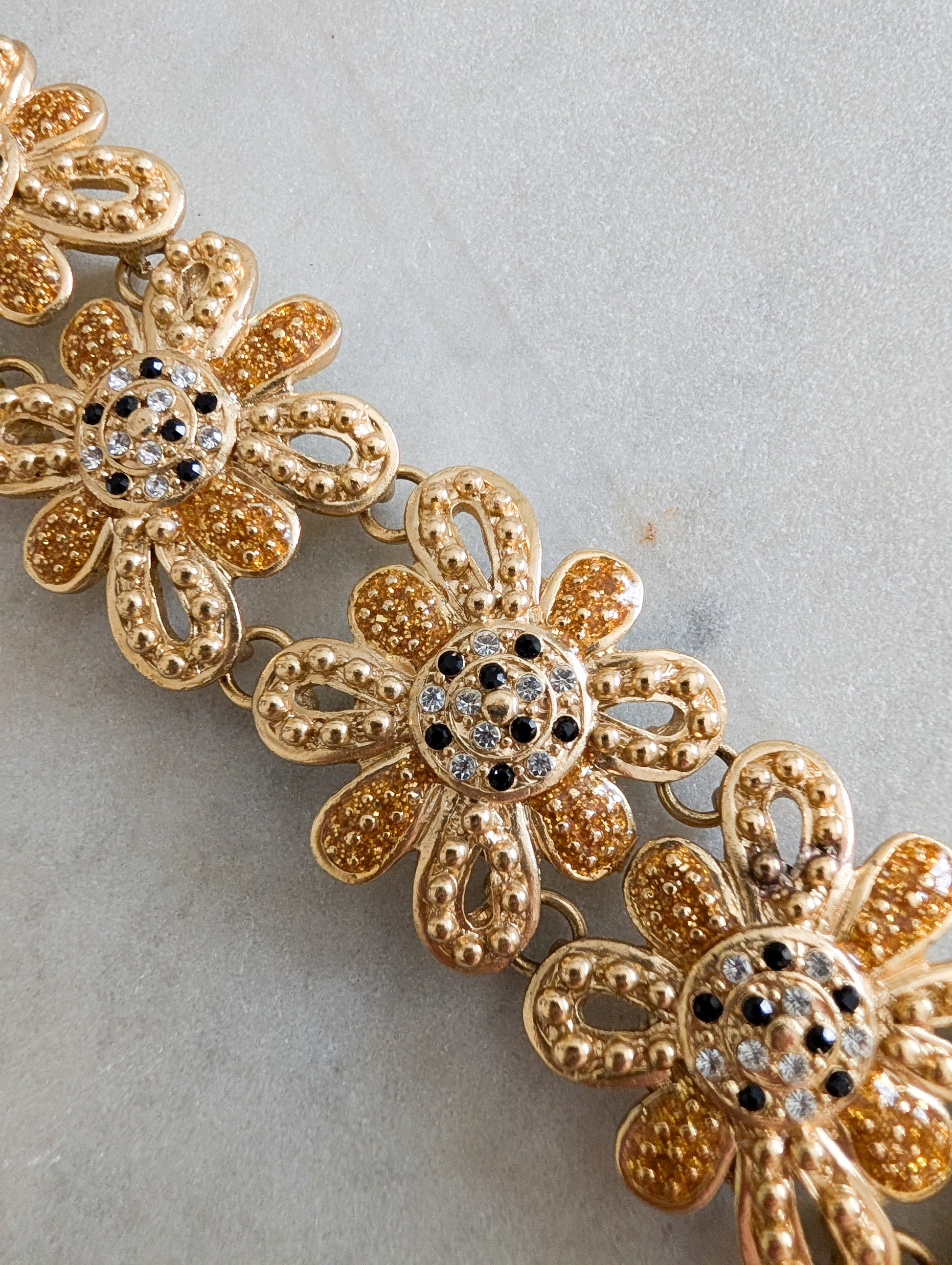 Le bracelet est composé d'une succession de fleurs en métal doré à la texture finement travaillée. Le cœur de chaque fleur est pavé de petits strass en verre blanc et noir.