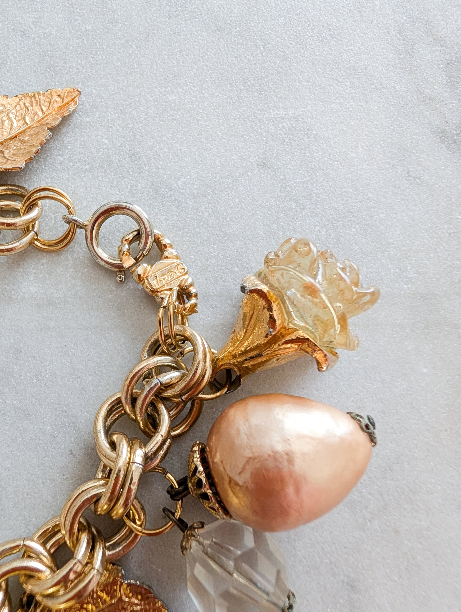 Le bracelet présente une double maille forçat à laquelle sont attachées des breloques et des perles.