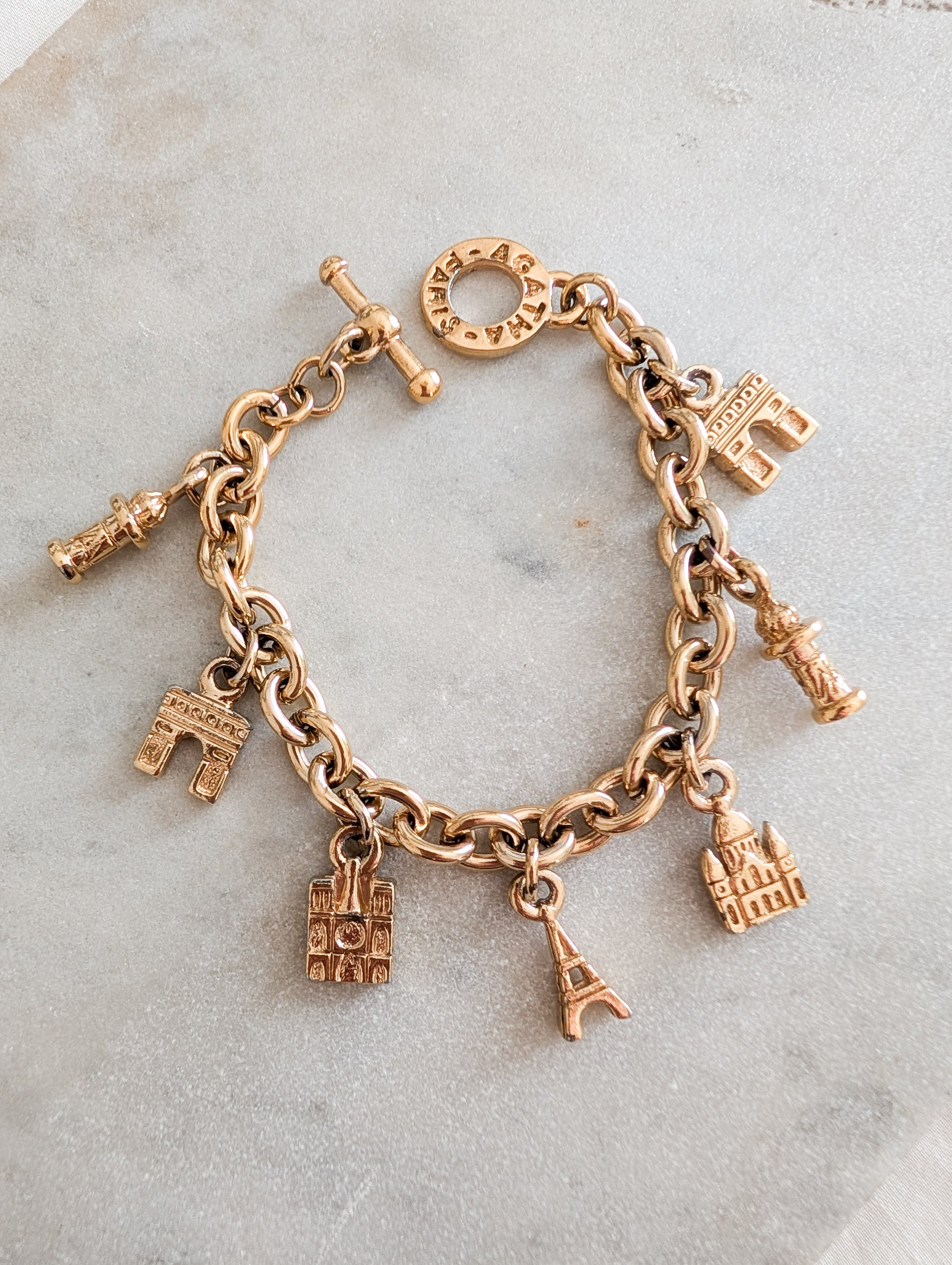 Le bracelet présente une belle maille forçat avec des pampilles. Chaque breloque représente un monument de Paris.