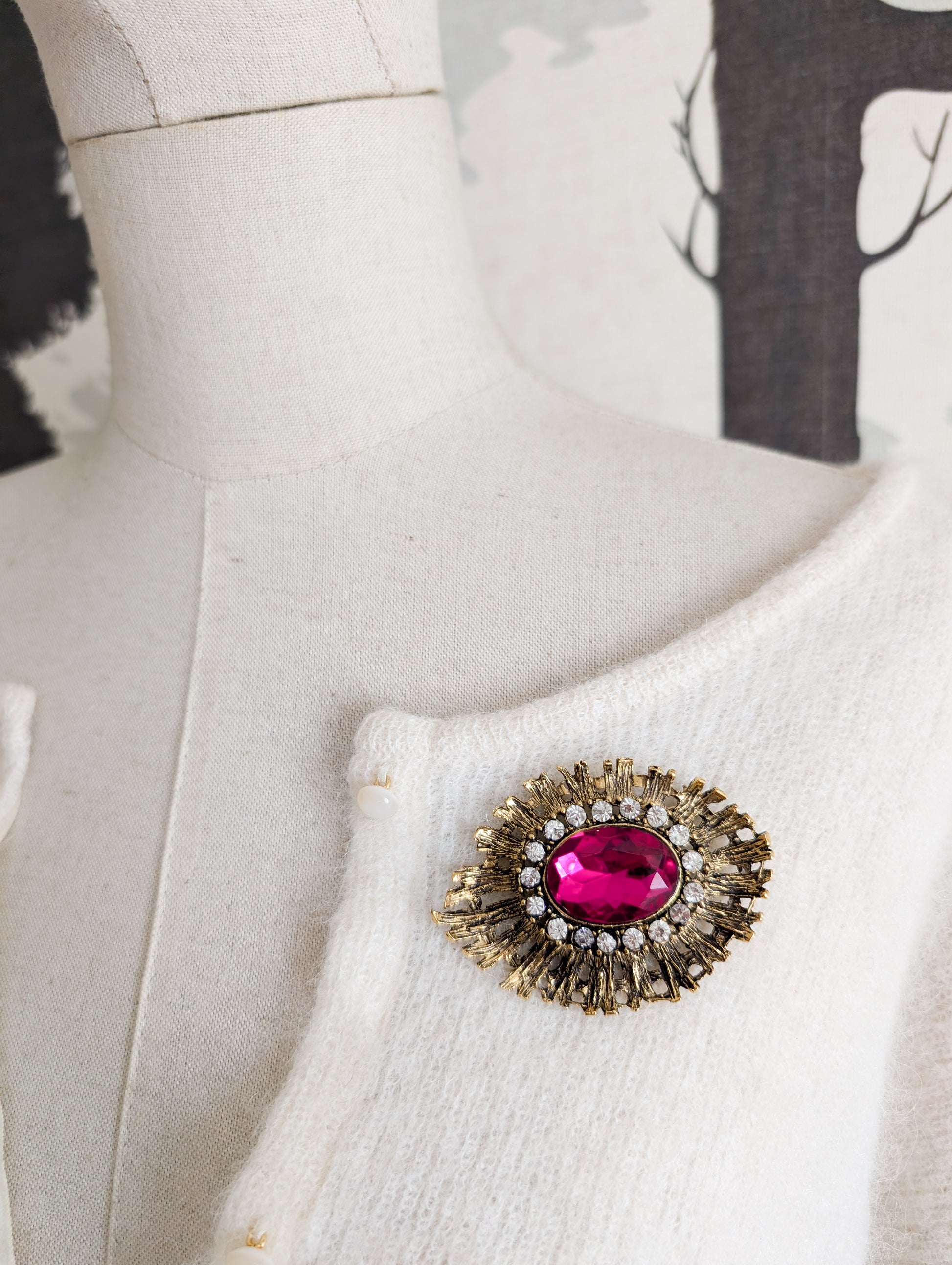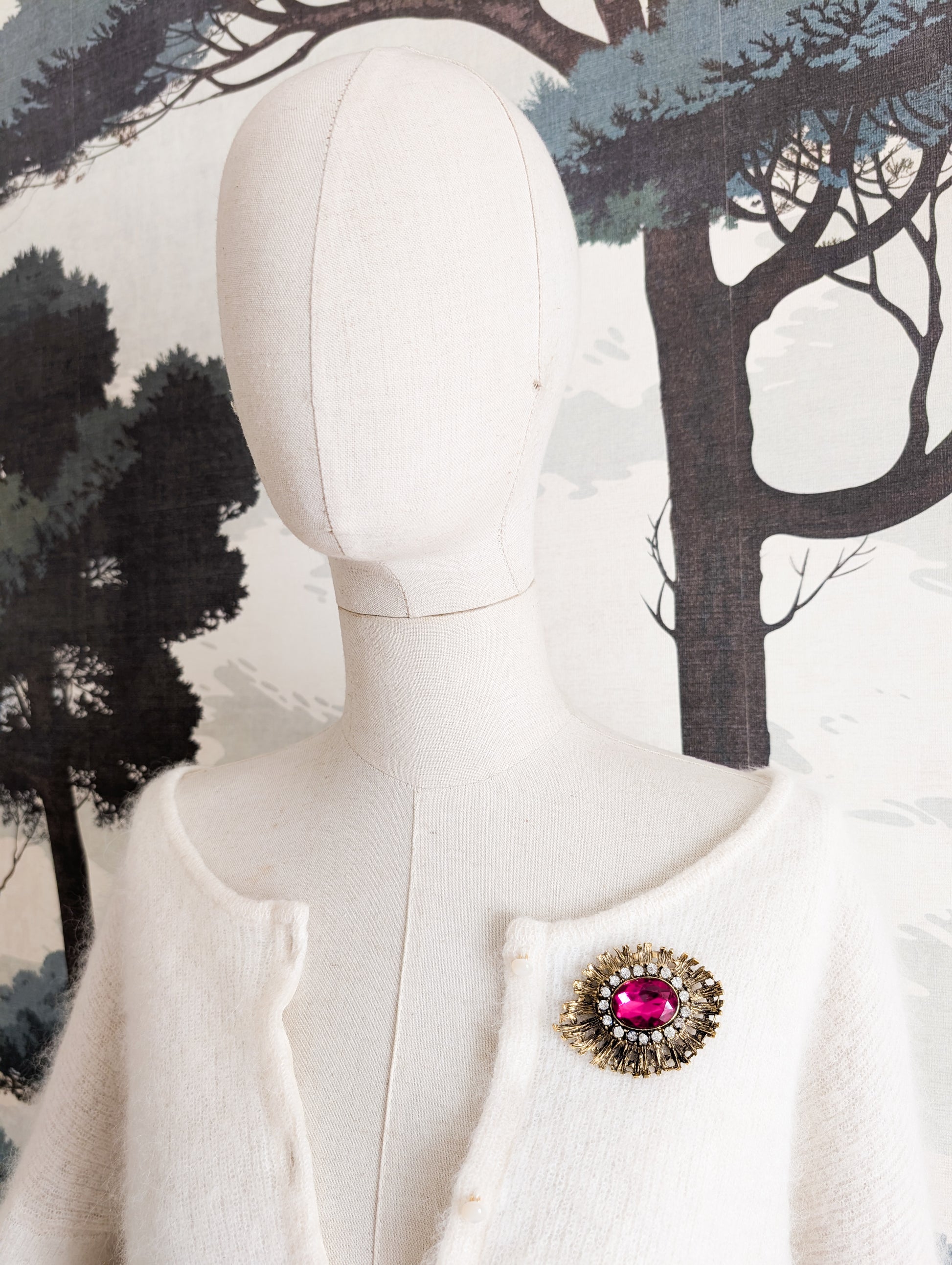 La broche est en métal doré. Elle est pavée de strass en verre blanc. Au centre, une très belle pierre à facettes en résine fushia. La couleur est vibrante, absolument superbe !