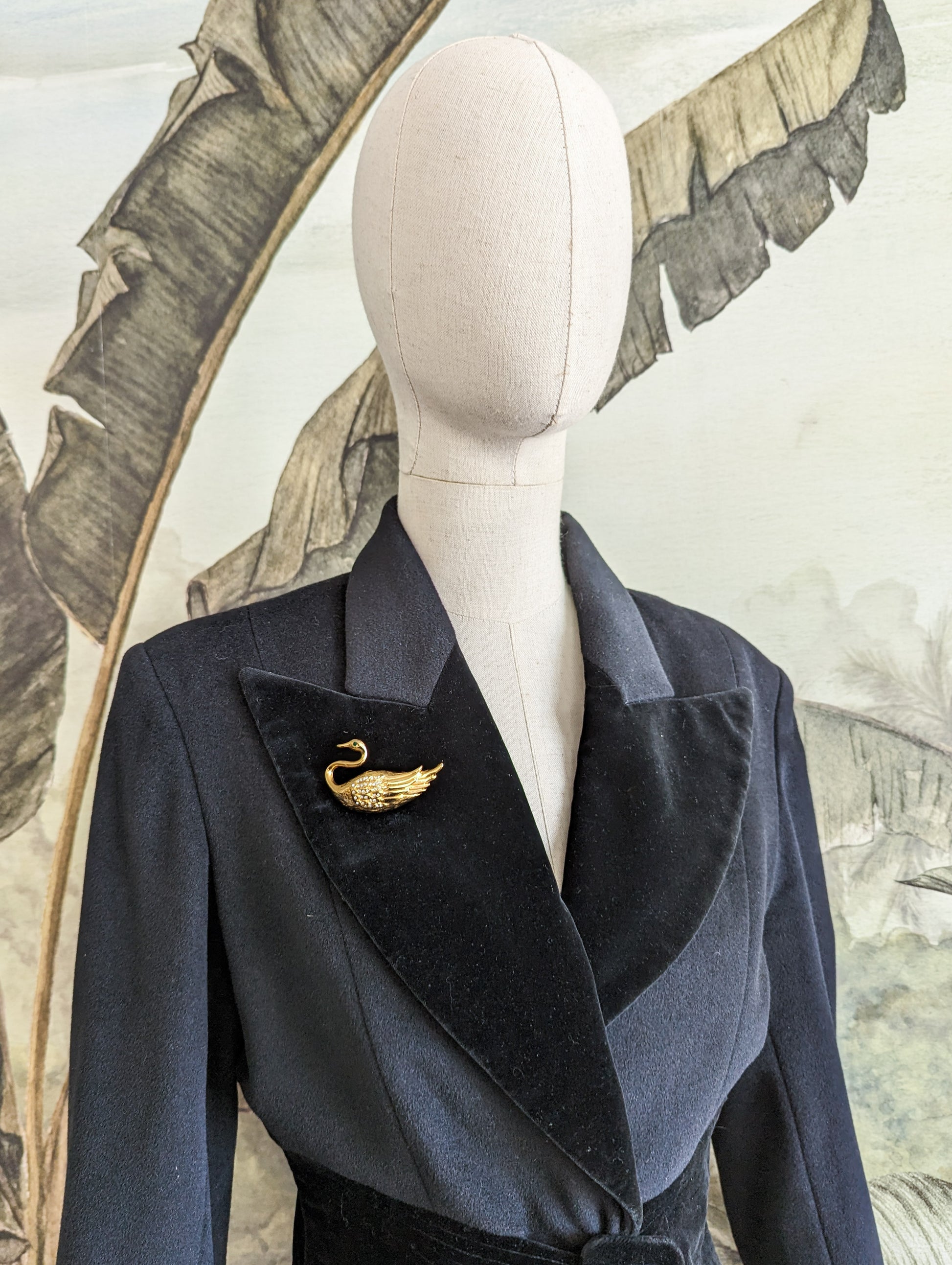 La broche représente un cygne. Elle est en métal doré, le plumes sont pavées de strass blancs. Un strass vert émeraude sur l'œil de l'oiseau.
