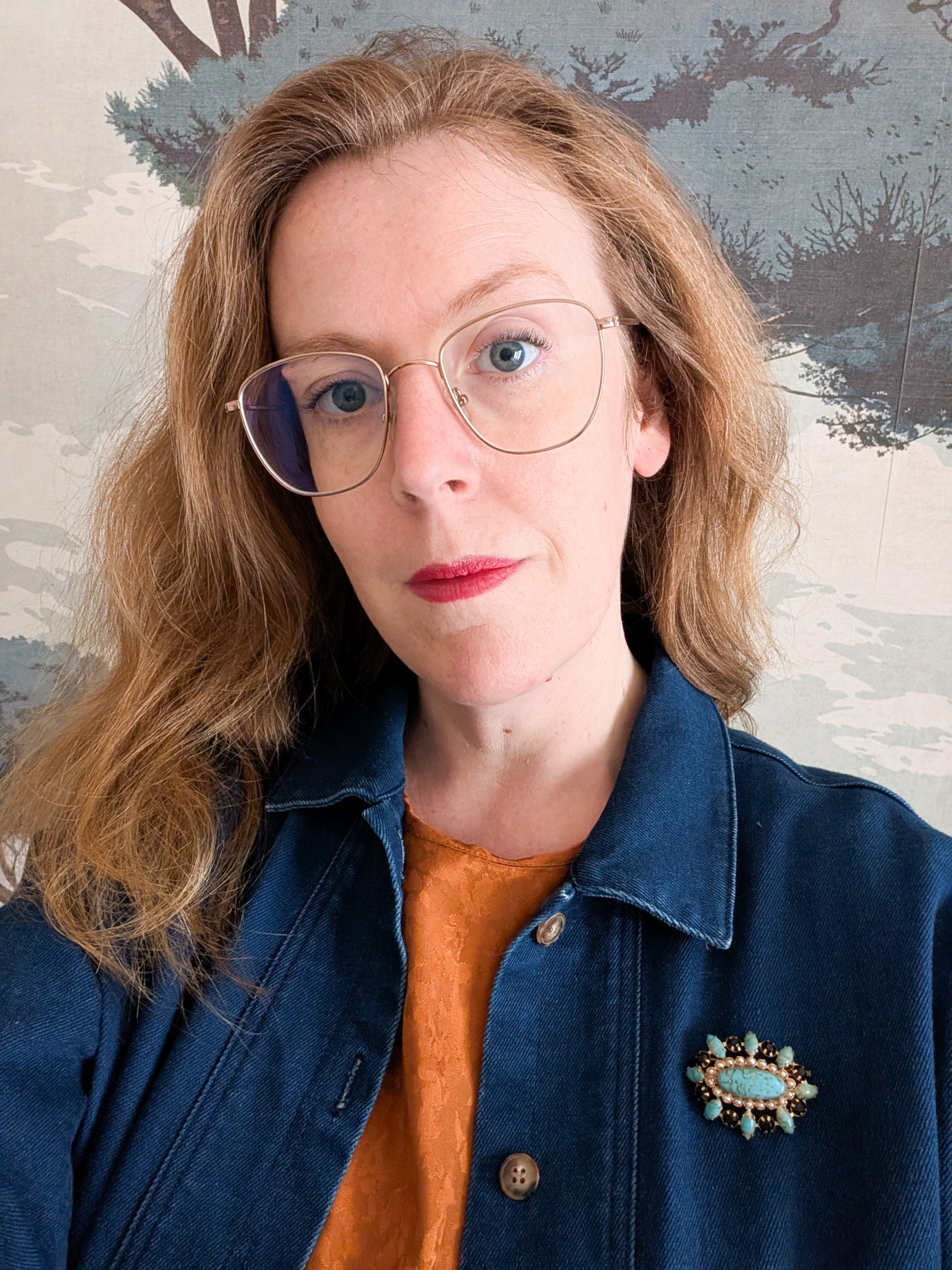 La broche est en métal doré. La monture est pavée de pierres en pâte de verre et perles fantaisies.
