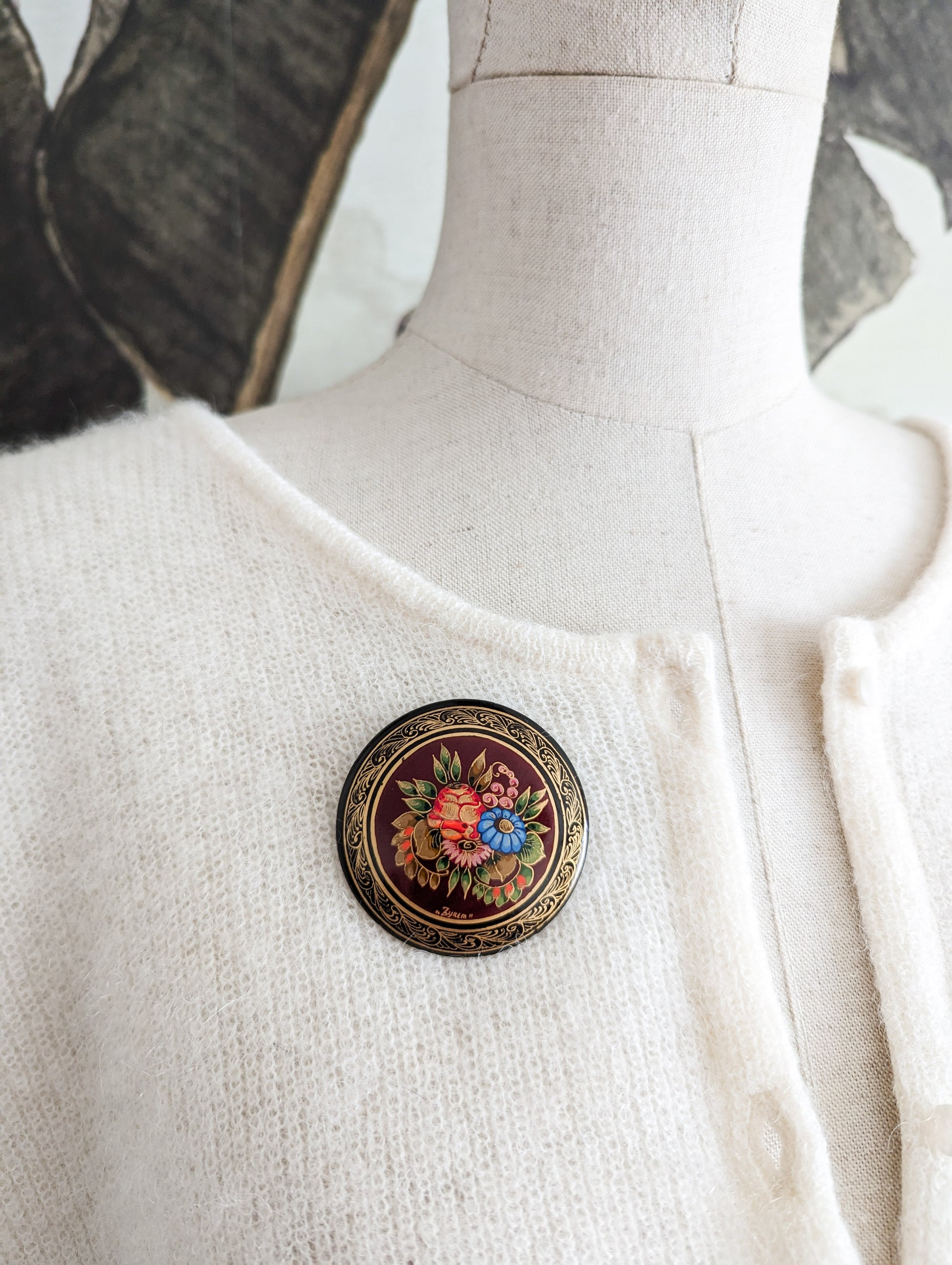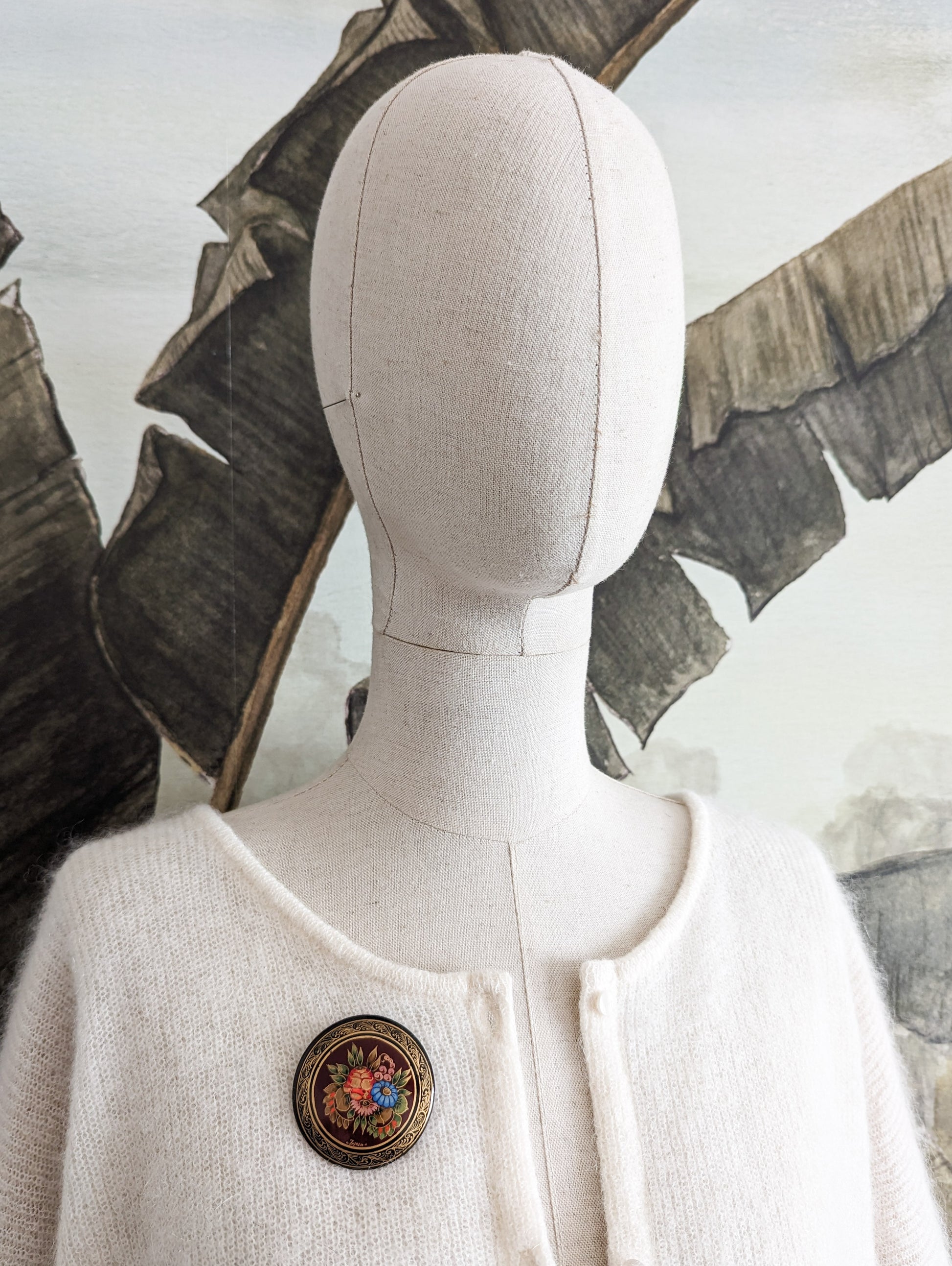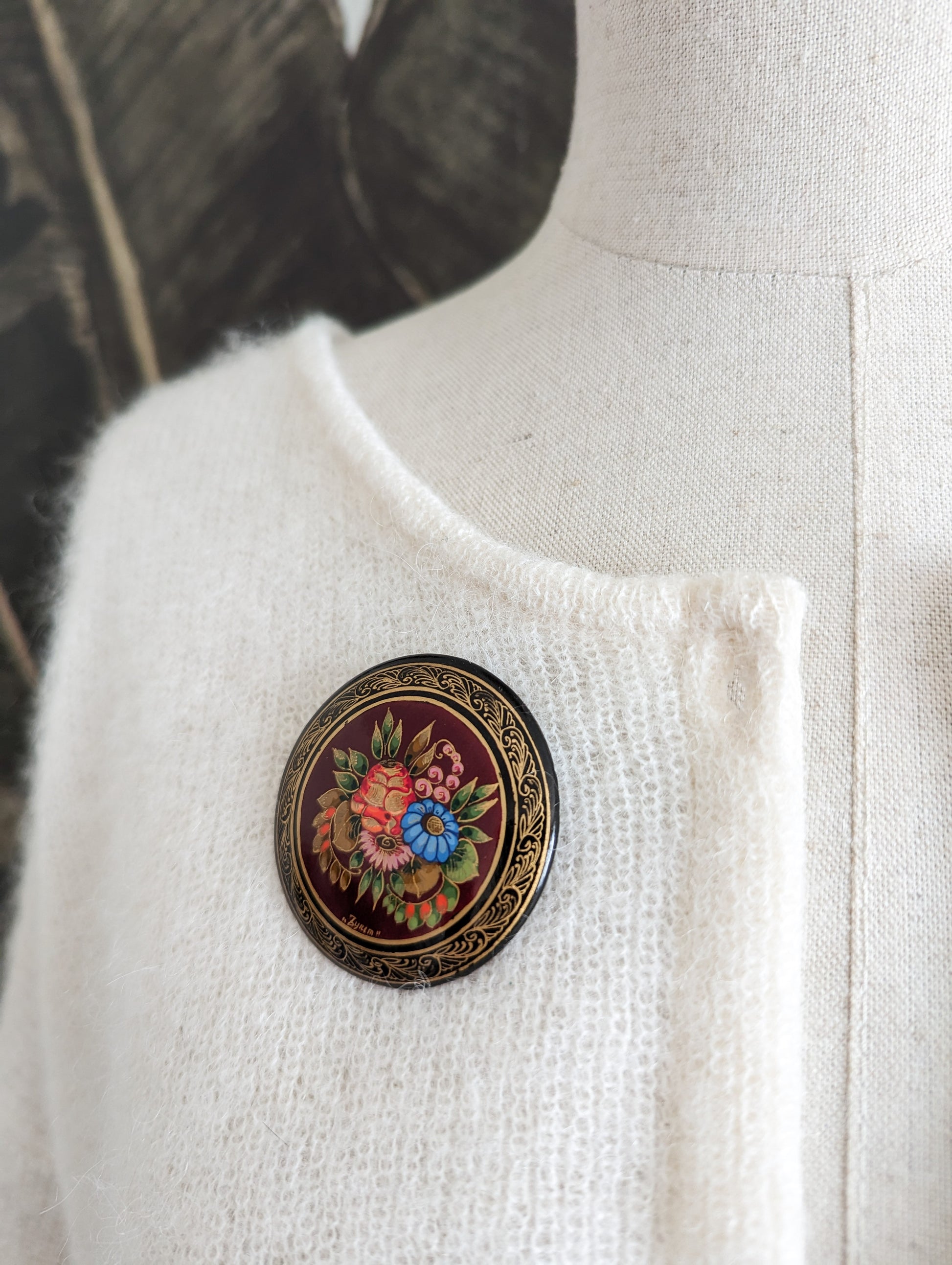 Magnifique broche en papier mâcher peinte à la main. Ces bijoux sont un Artisanat traditionnel des pays baltiques et scandinaves.