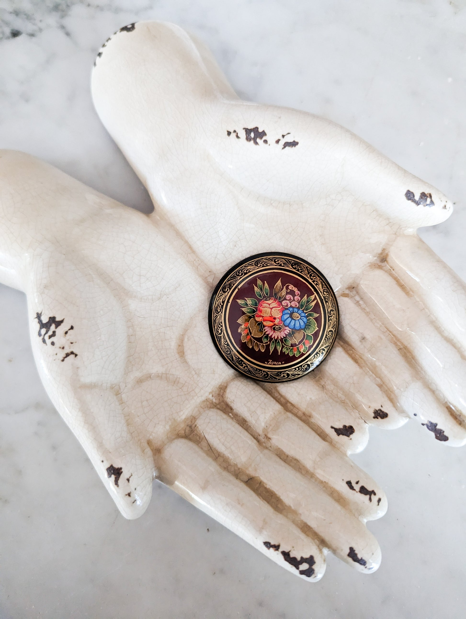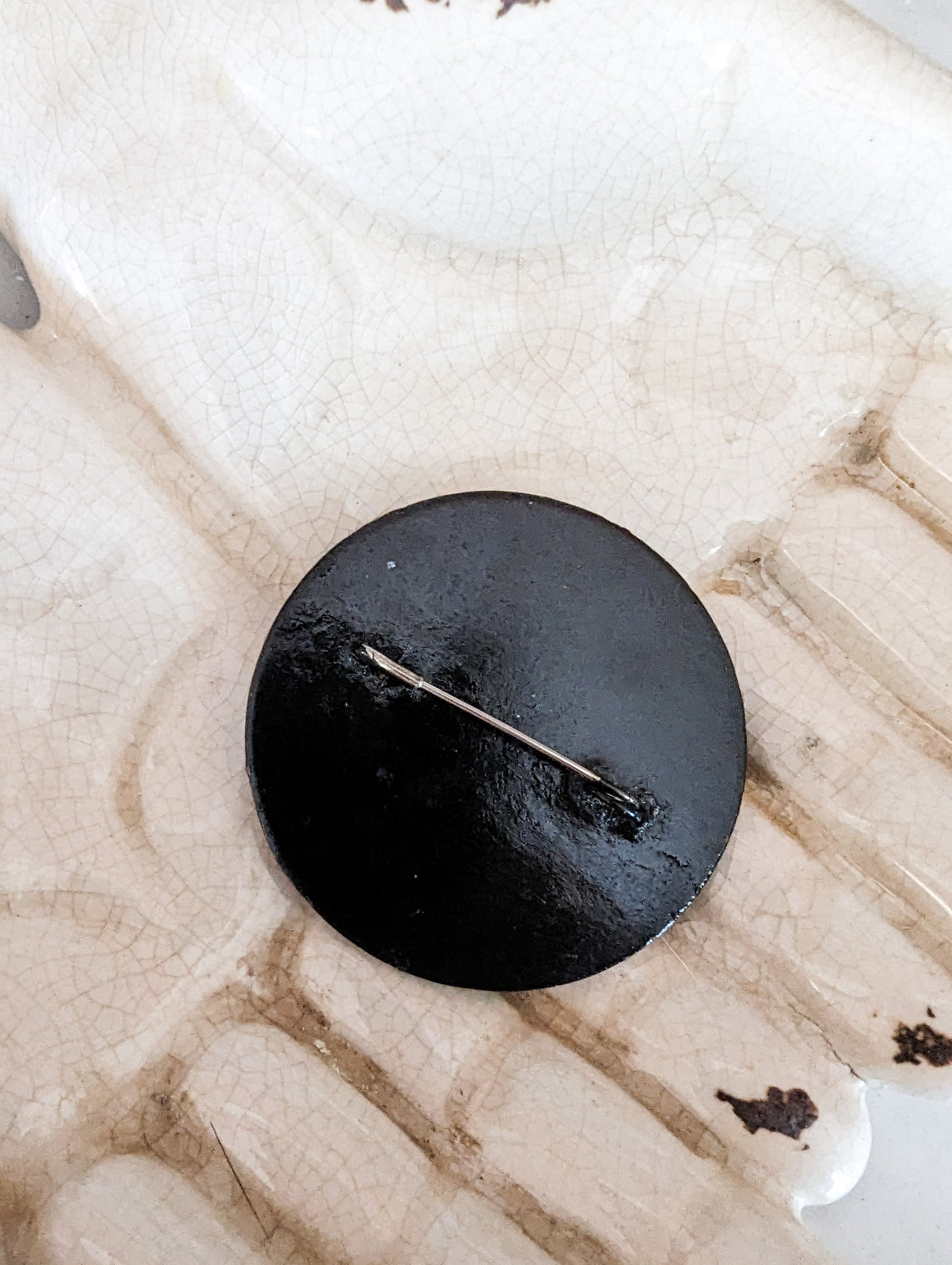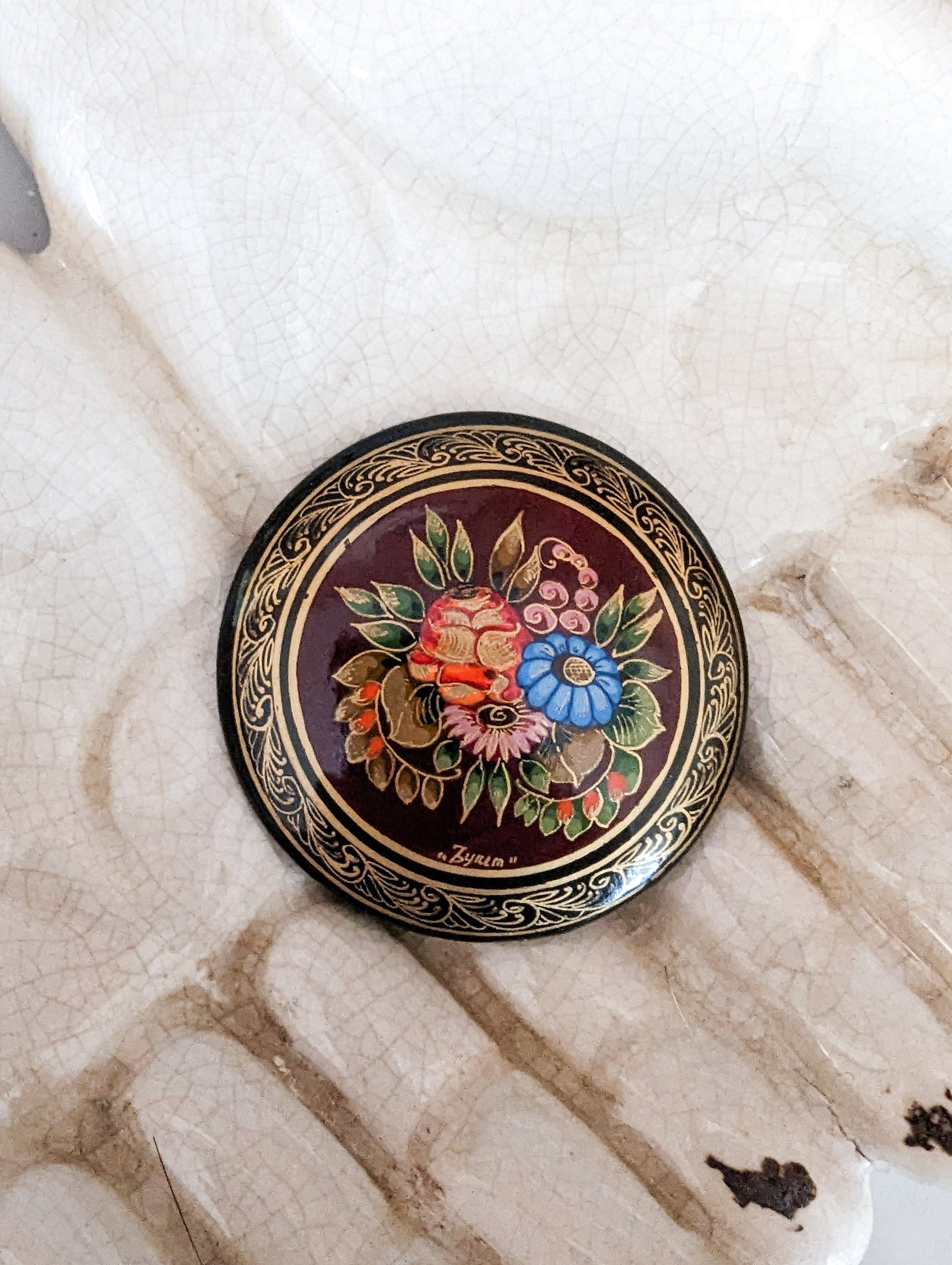 Magnifique broche en papier mâcher peinte à la main. Ces bijoux sont un Artisanat traditionnel des pays baltiques et scandinaves.