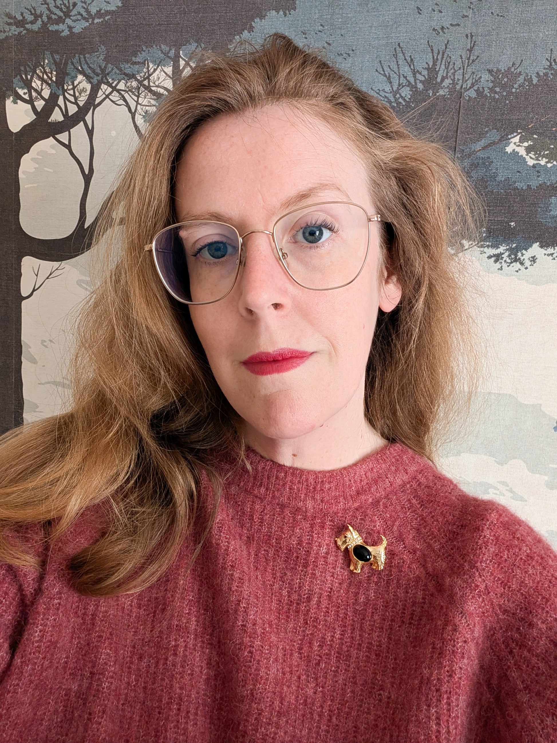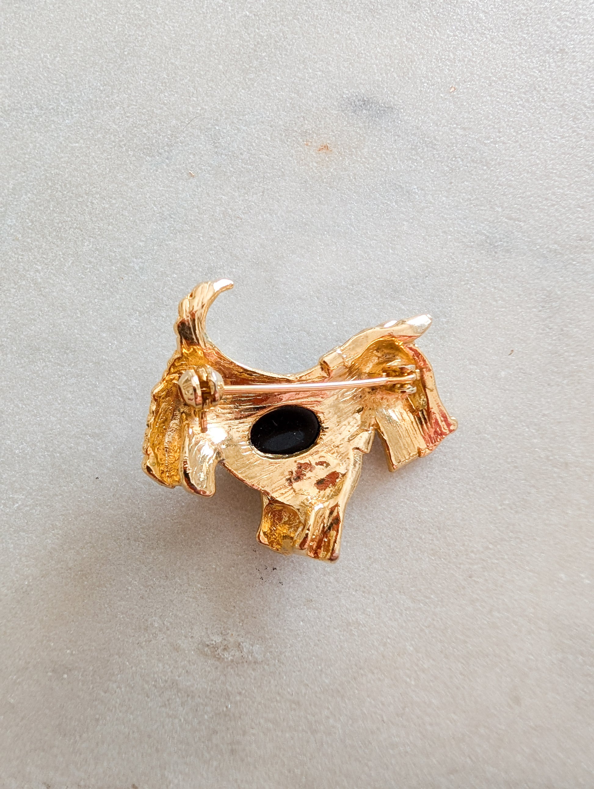 Le chien est en métal doré. Le collier est figuré par des strass en verre blanc.