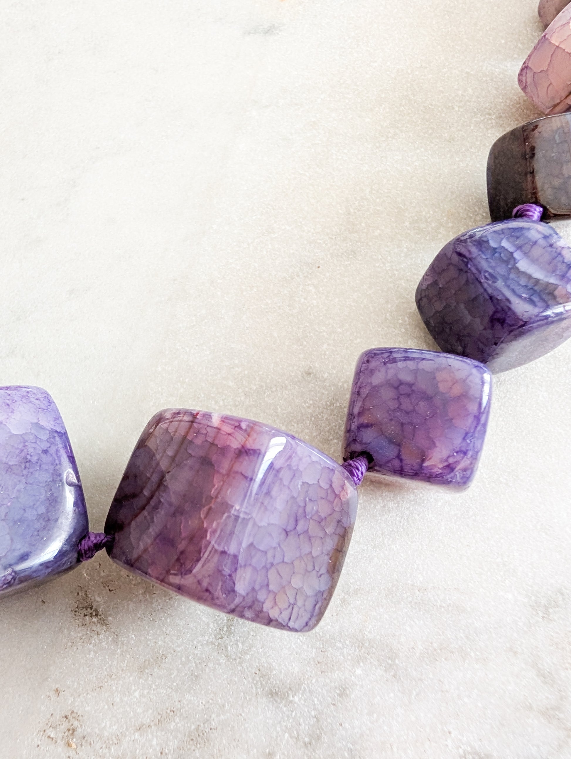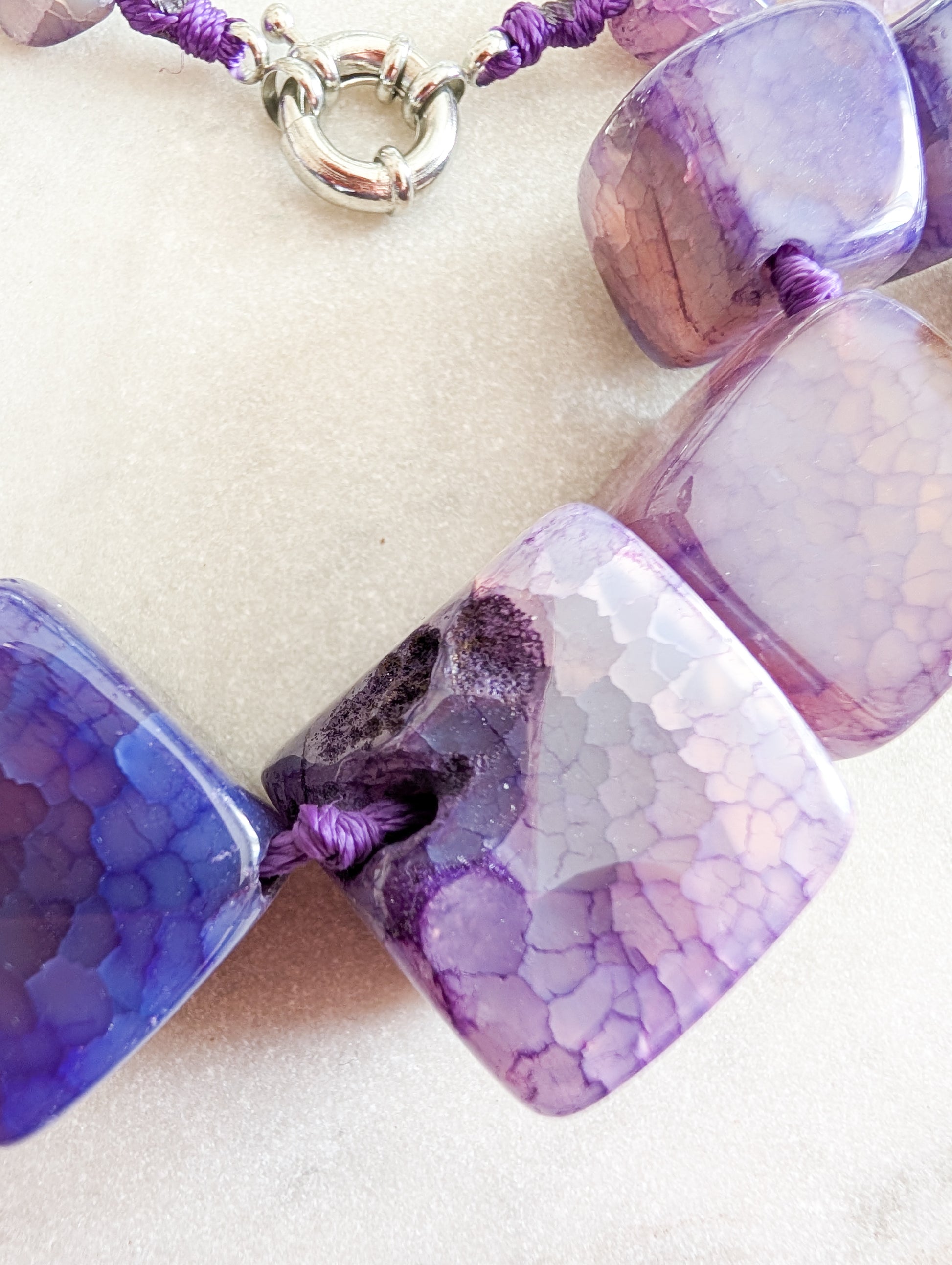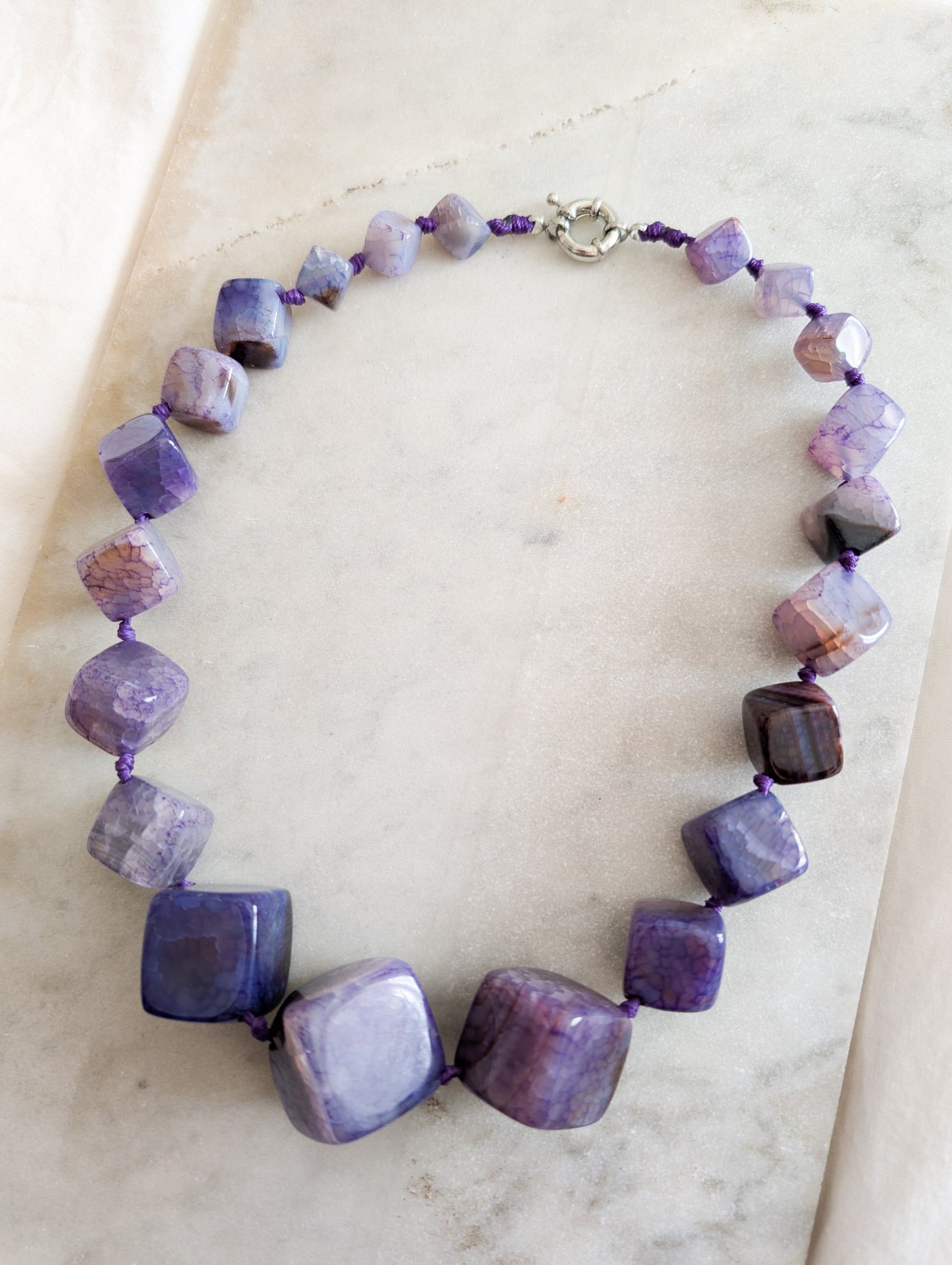 Il présentés de grandes pierres cubiques en pierre veine de dragon. La pierre est teintée dans ces belles teintes violettes.