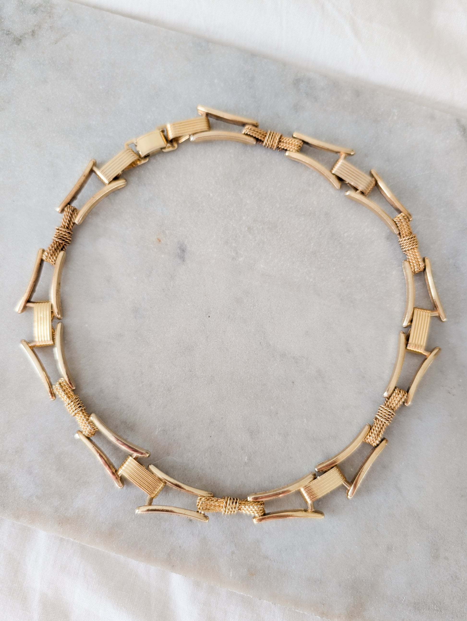Il est en métal doré. Le collier présente une succession de maillons géométriques. Magnifique attaches en métal travaillées comme des cordelettes.