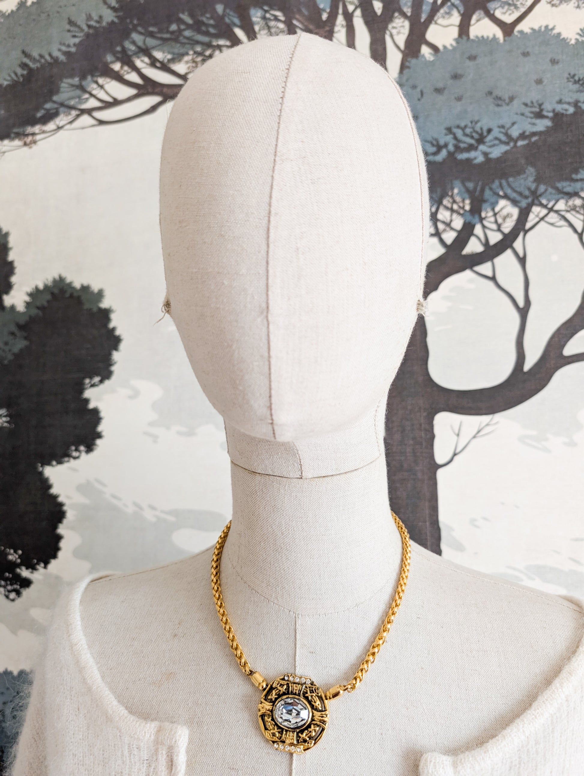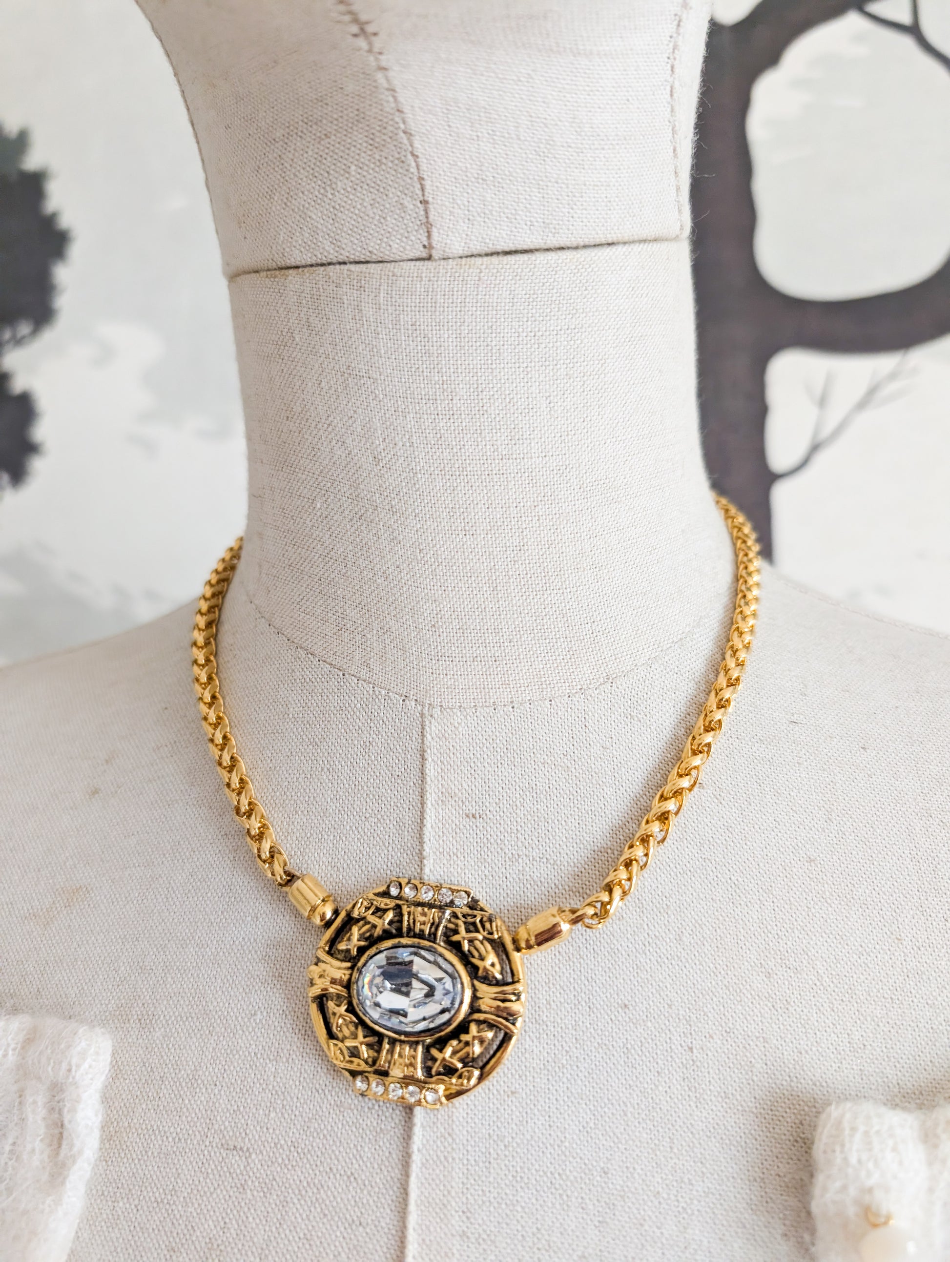 Au centre un médaillon doré pour pavé de strass en verre et d'une grande pierre à facettes en verre blanc.