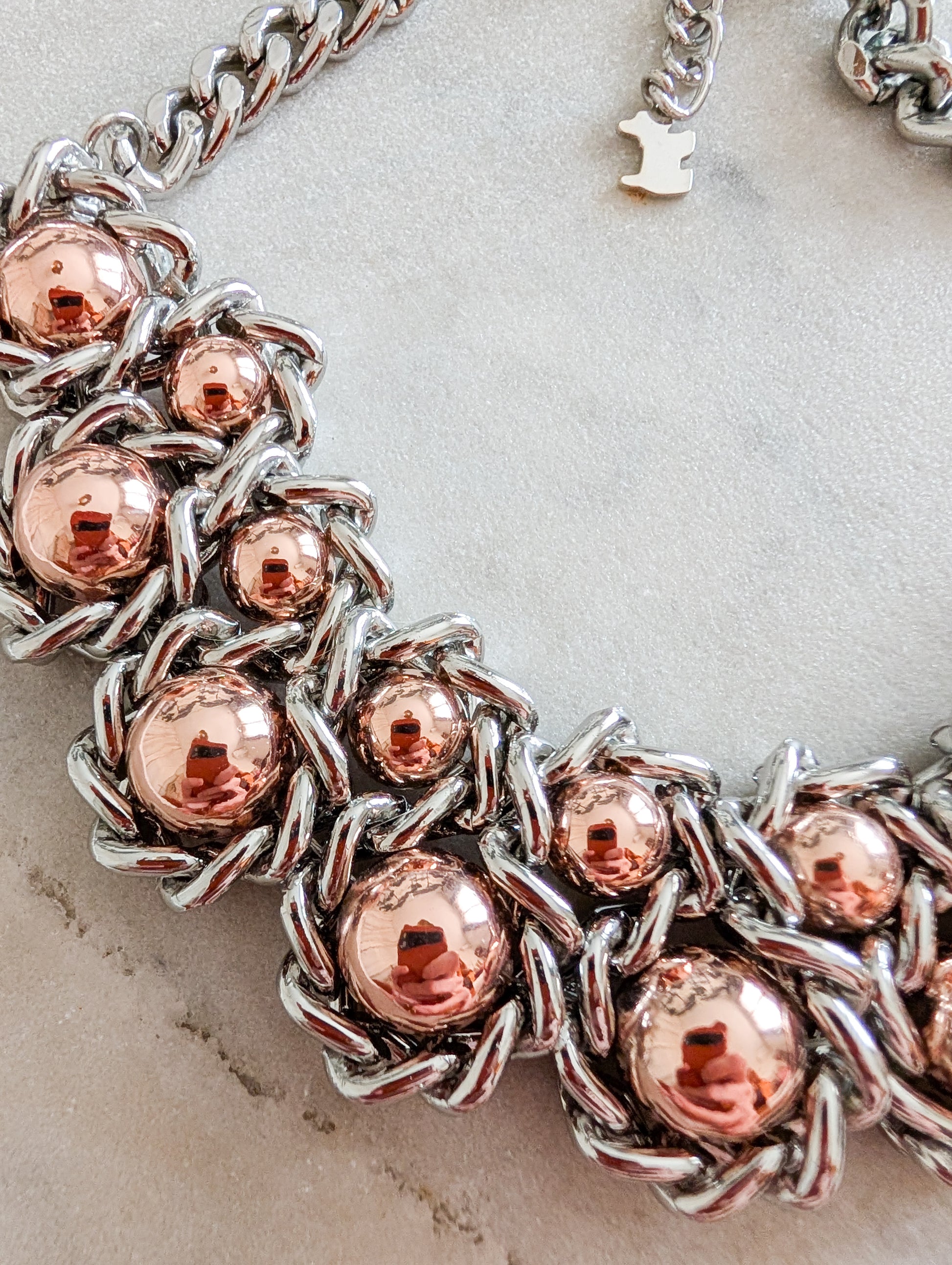 Le collier présente une maille gourmette. Celle ci est finement entrelacée entre des perles en métal cuivré.