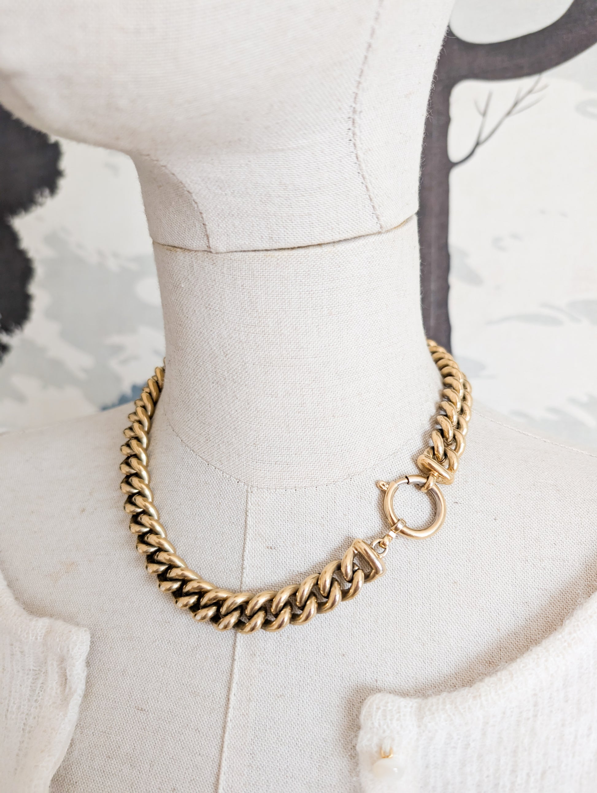 Le collier est un classique de la maison. Il présente un épaisse maille gourmette. Au centre un beau fermoir bouée. Le fermoir peut être porté devant, sur le côté ou dans le cou.