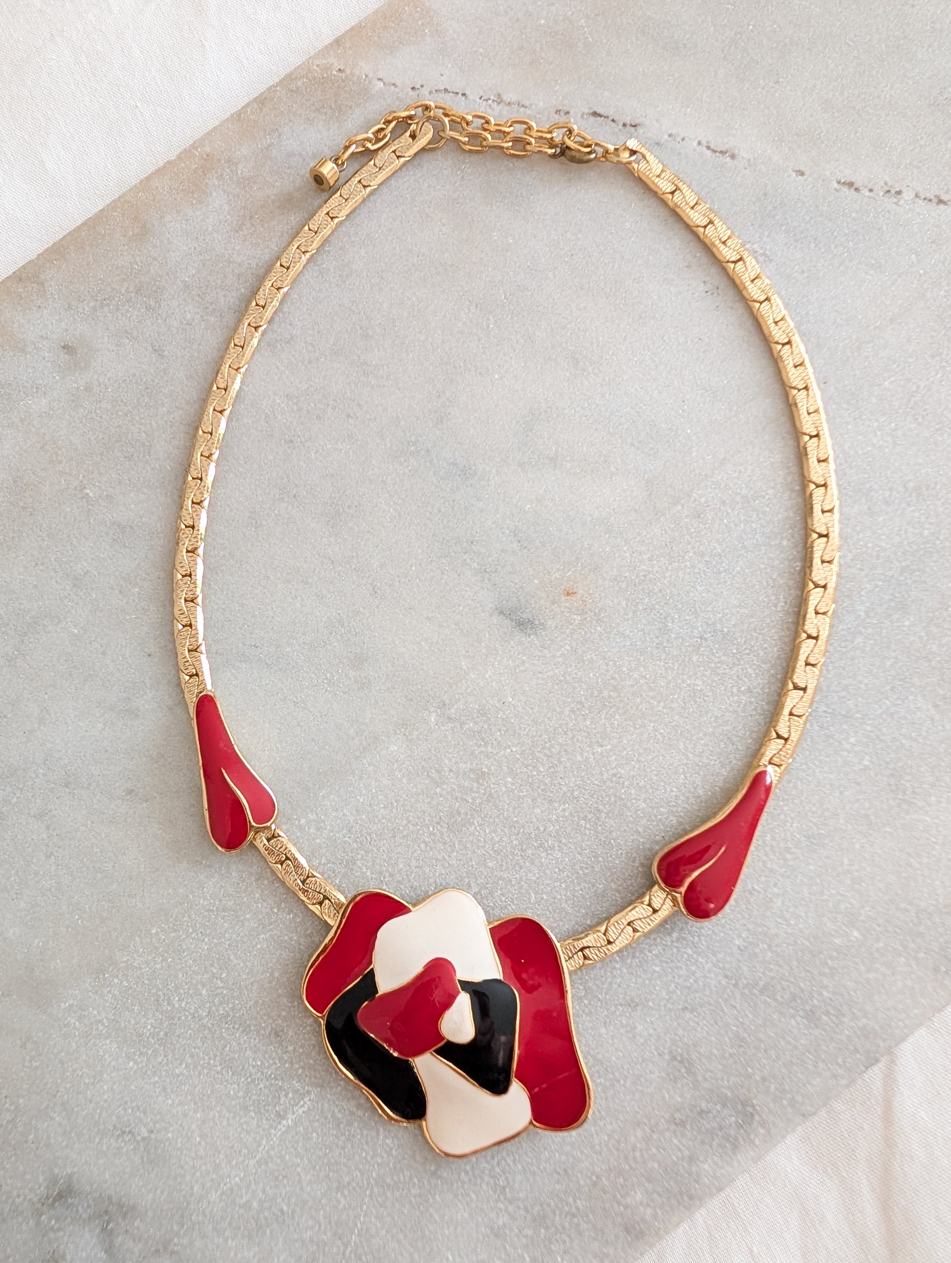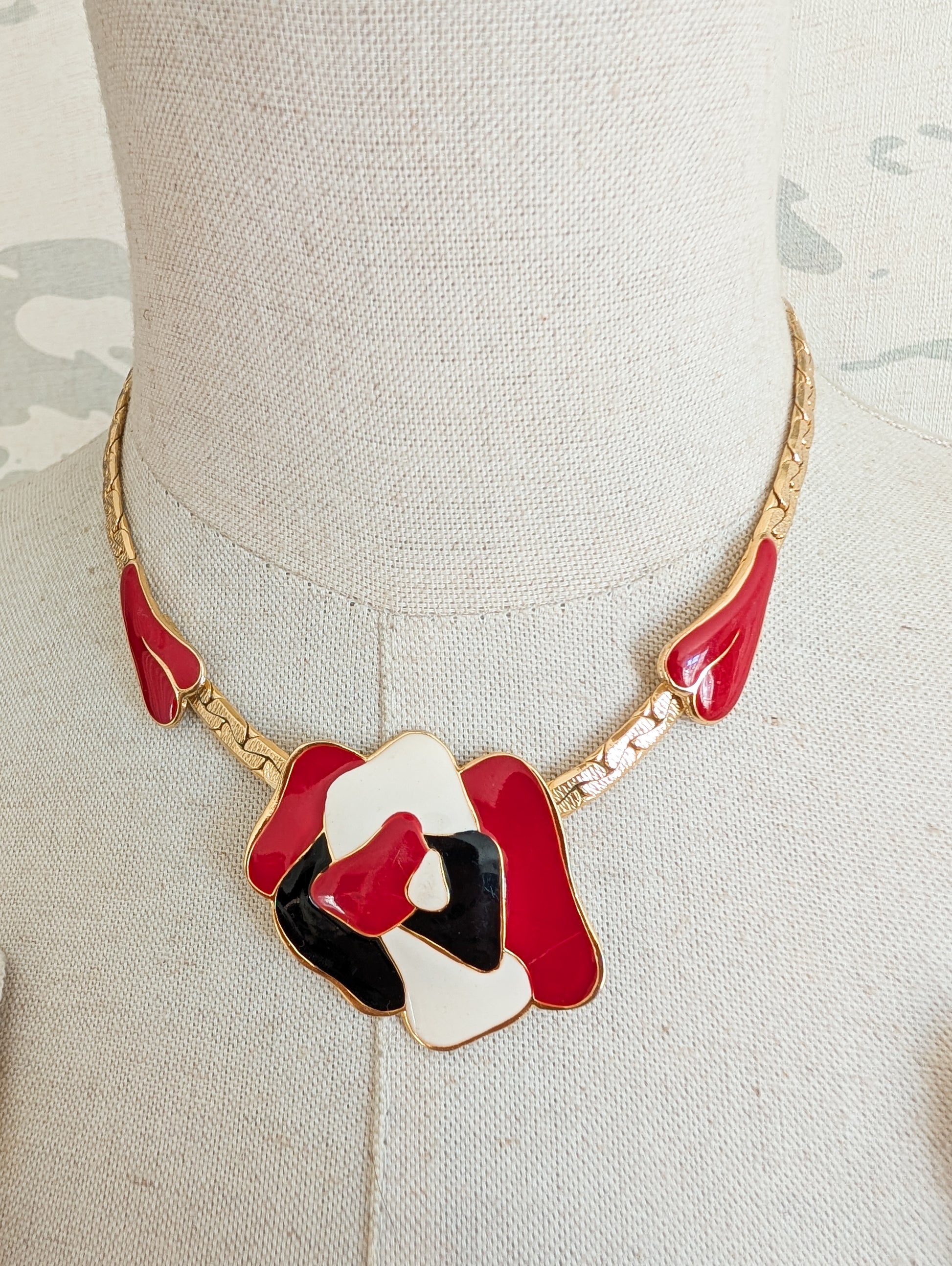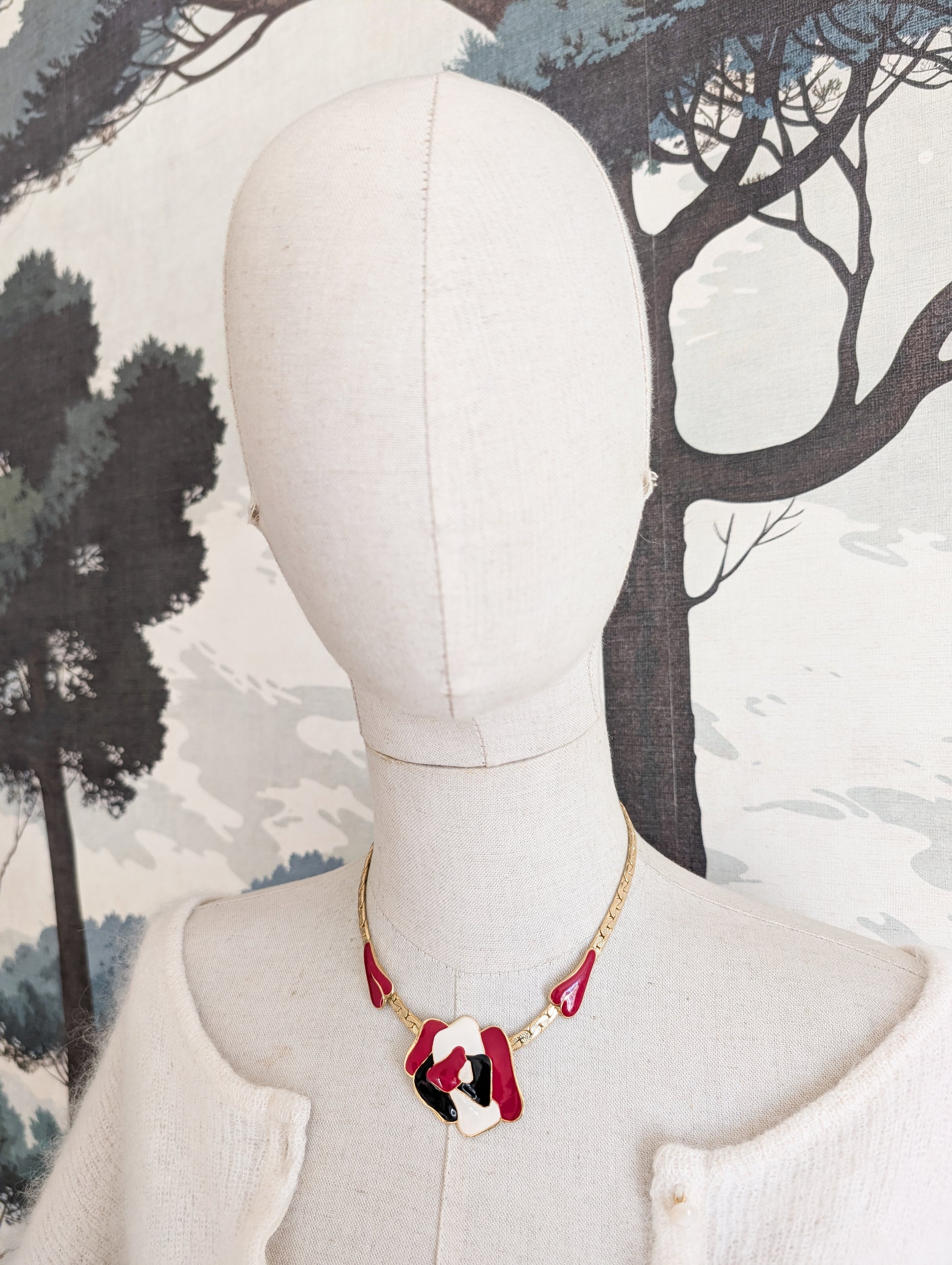 Le collier présente une maille plate dire maille palmier en métal doré. Au centres une très belle fleur laquée de rouge blanc et noir. Deux fleurs rouges sur les côtes.