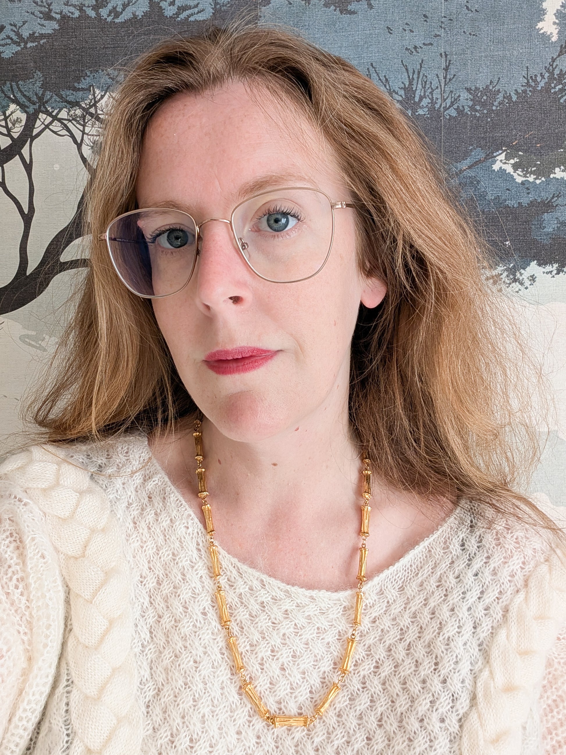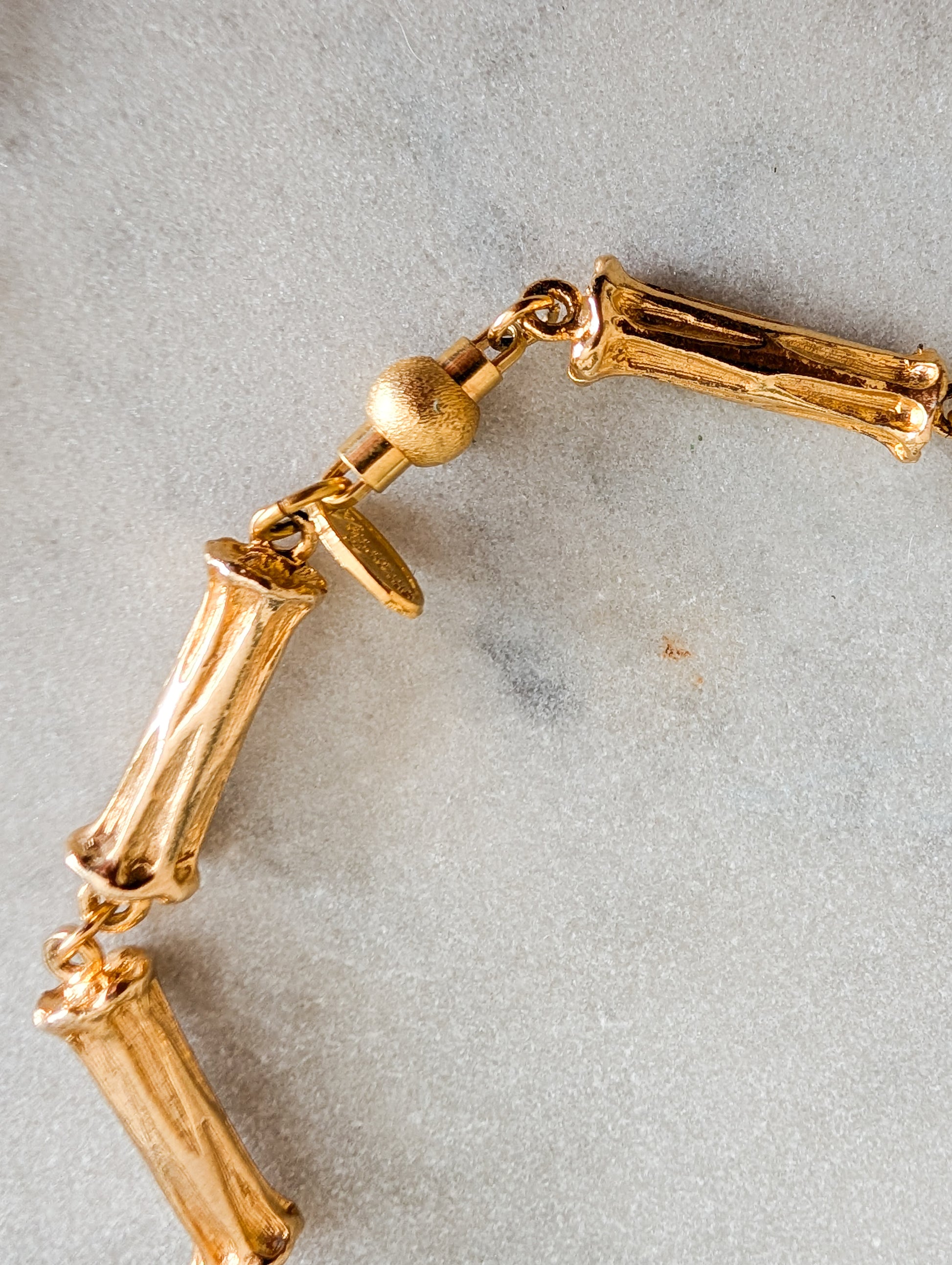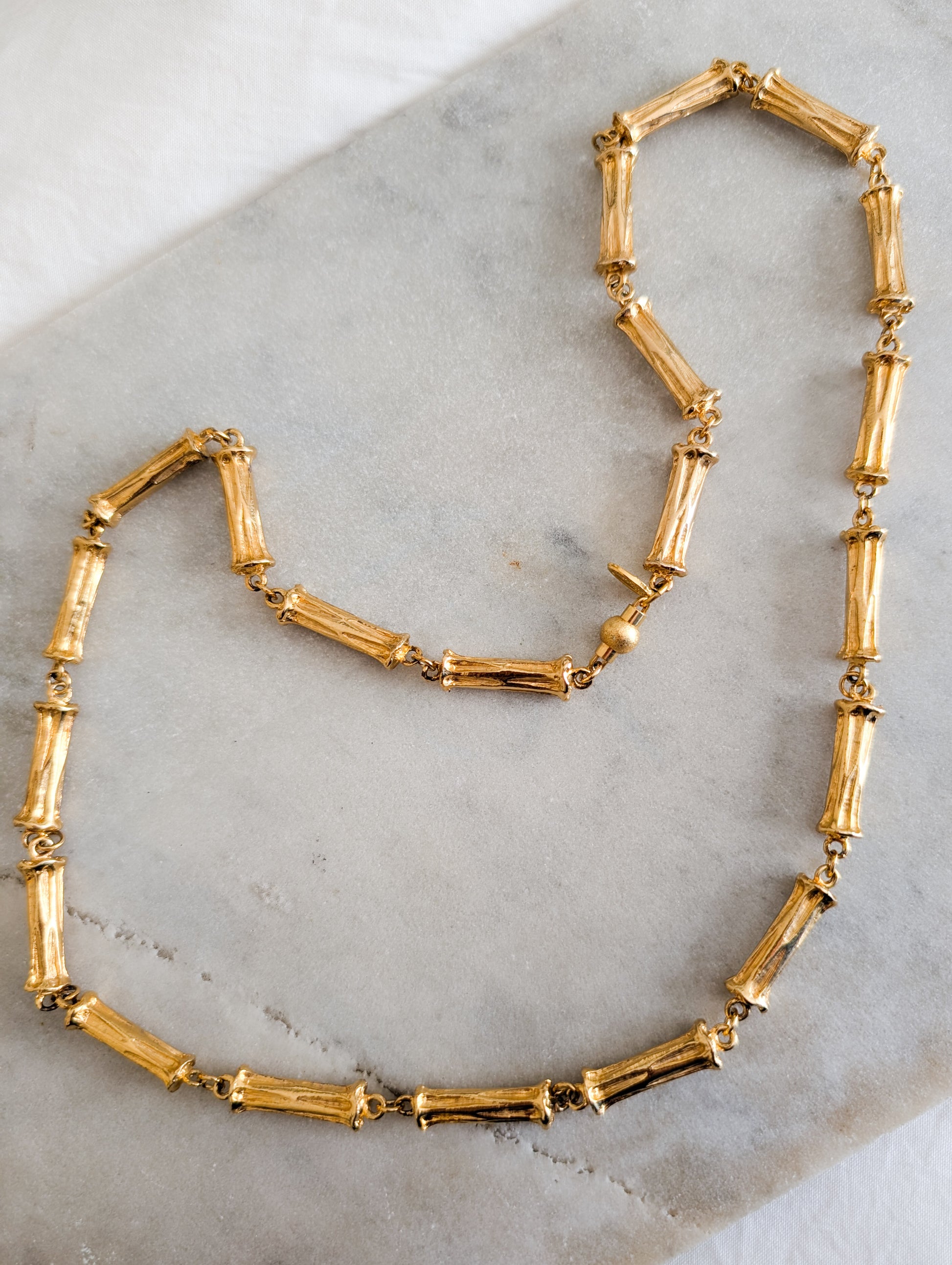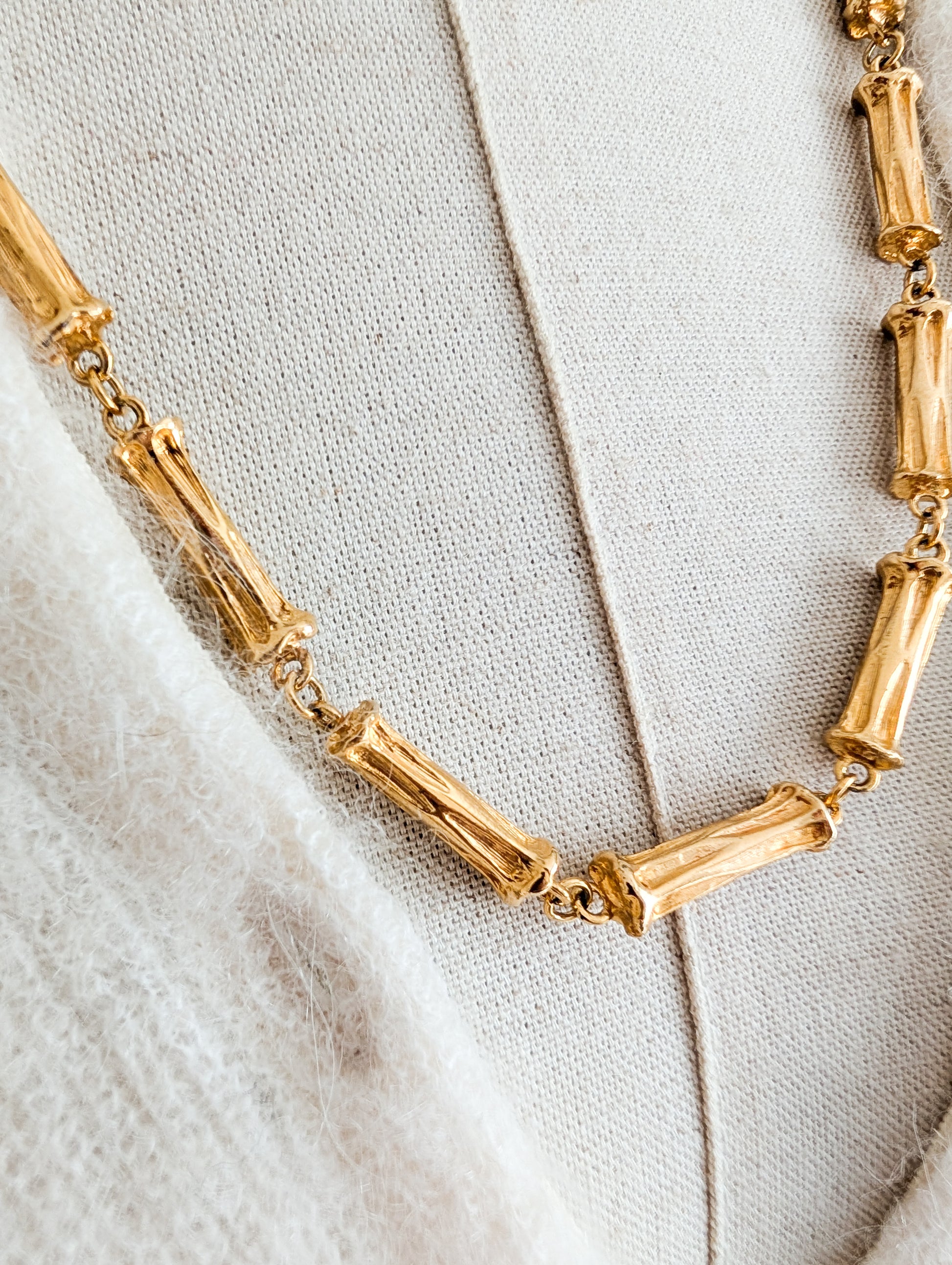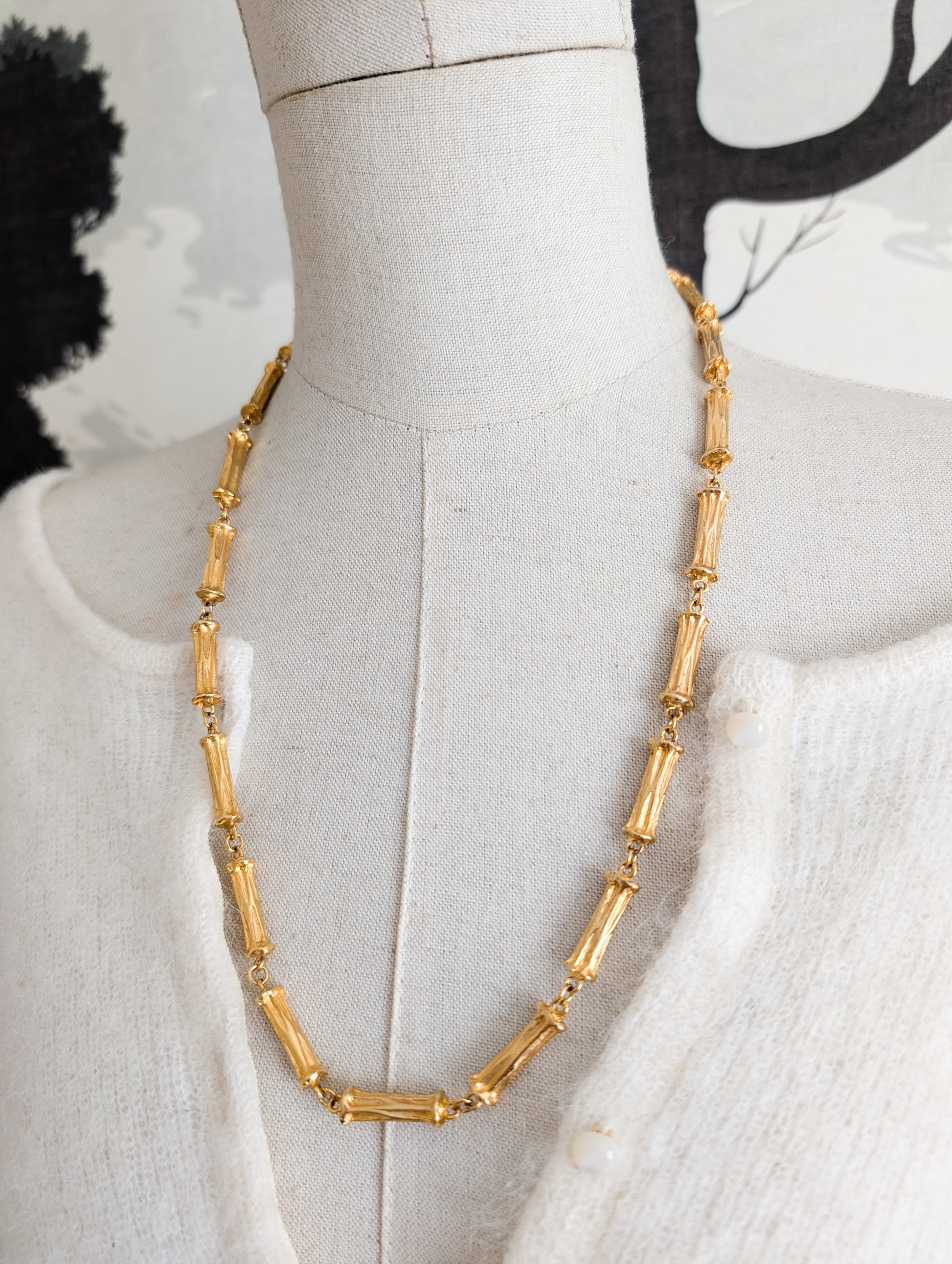 Le collier présente une chaîne, dont les maillons sont des bambous en métal doré. Doré. J'aime beaucoup le fermoir, très original, et iconique du travail de la maison Corocraft.