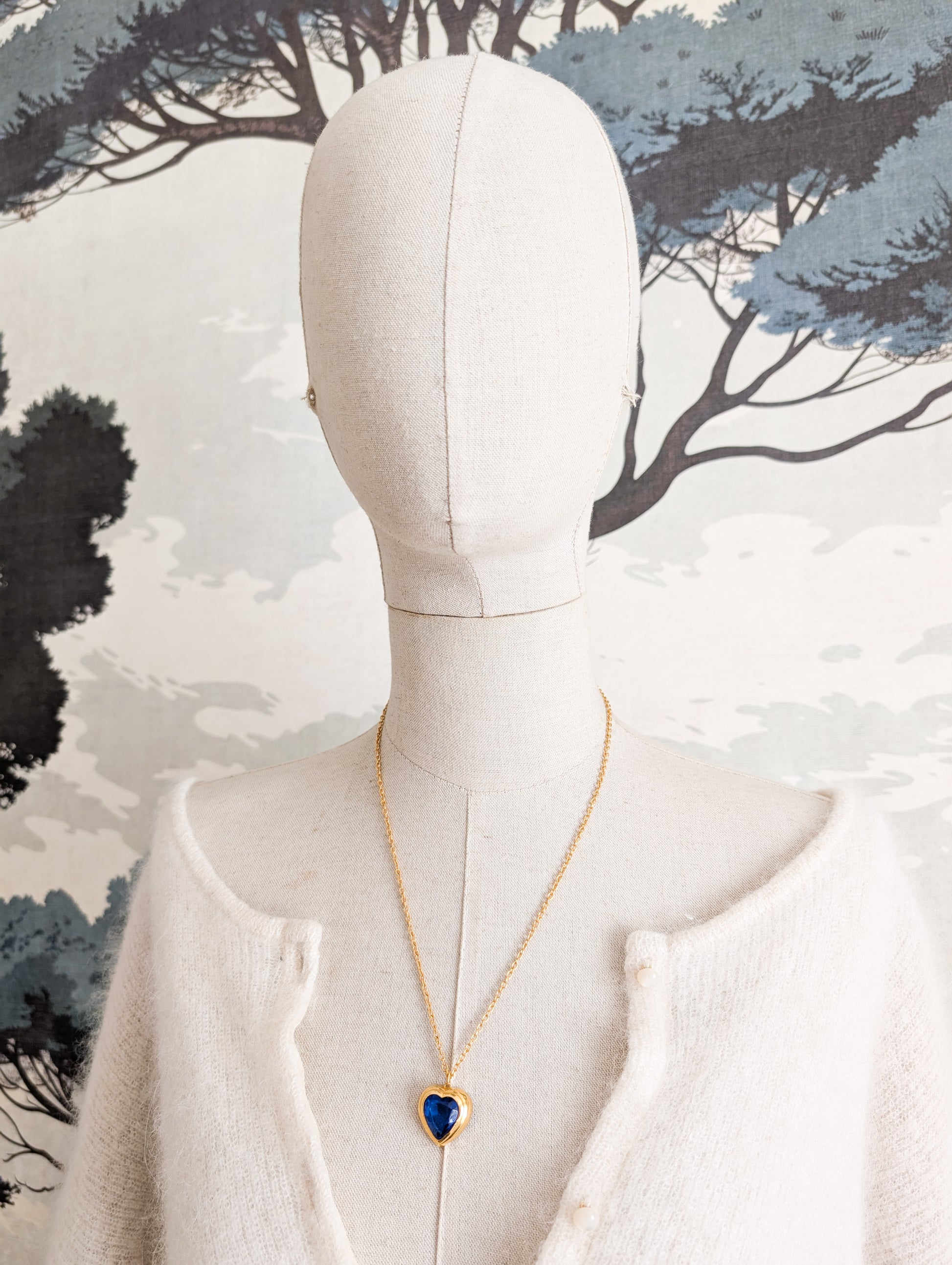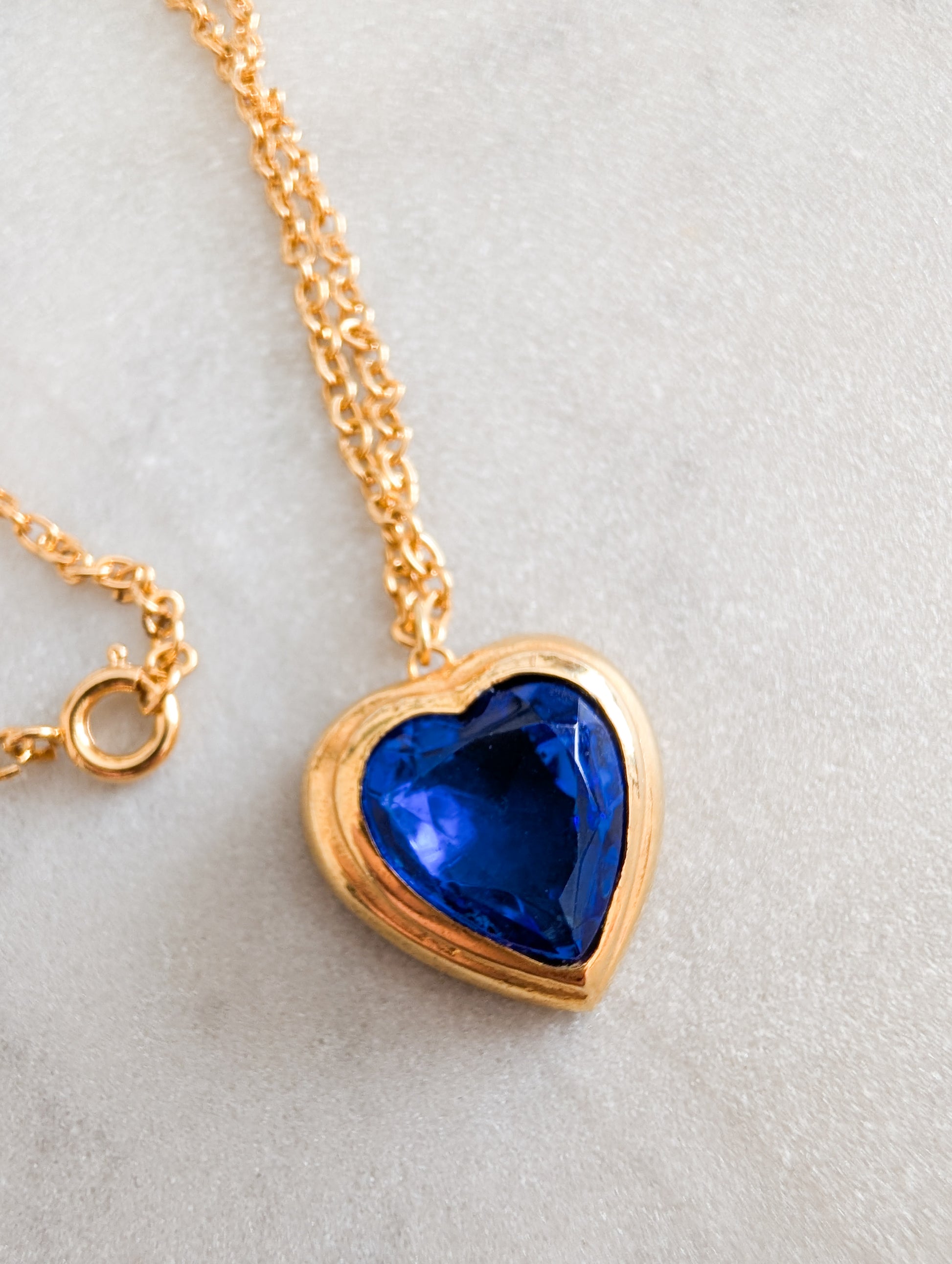 Le collier présente un très beau pendentif en forme de coeur qui encadre une pierre à facettes en verre bleu. Très belle couleur saphir.