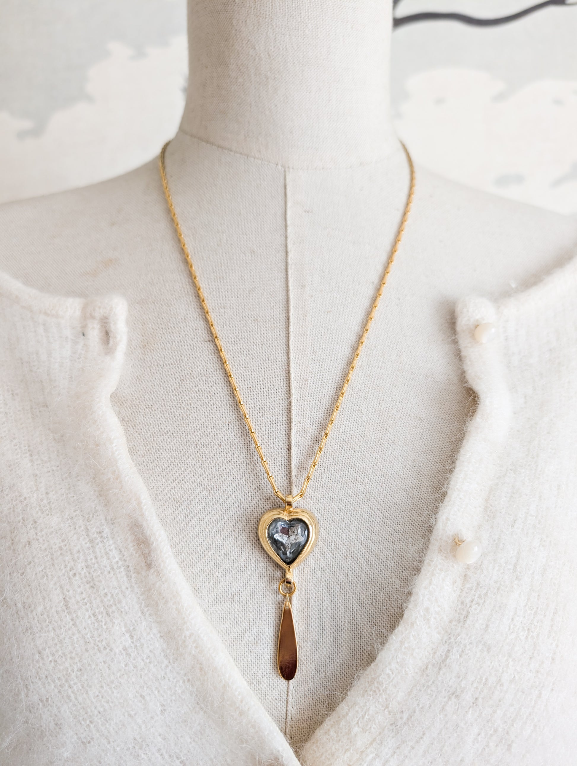 Le collier présente un très beau pendentif en forme de coeur qui encadre une pierre à facettes en verre bleu. Très belle couleur bleu clair presque argent.