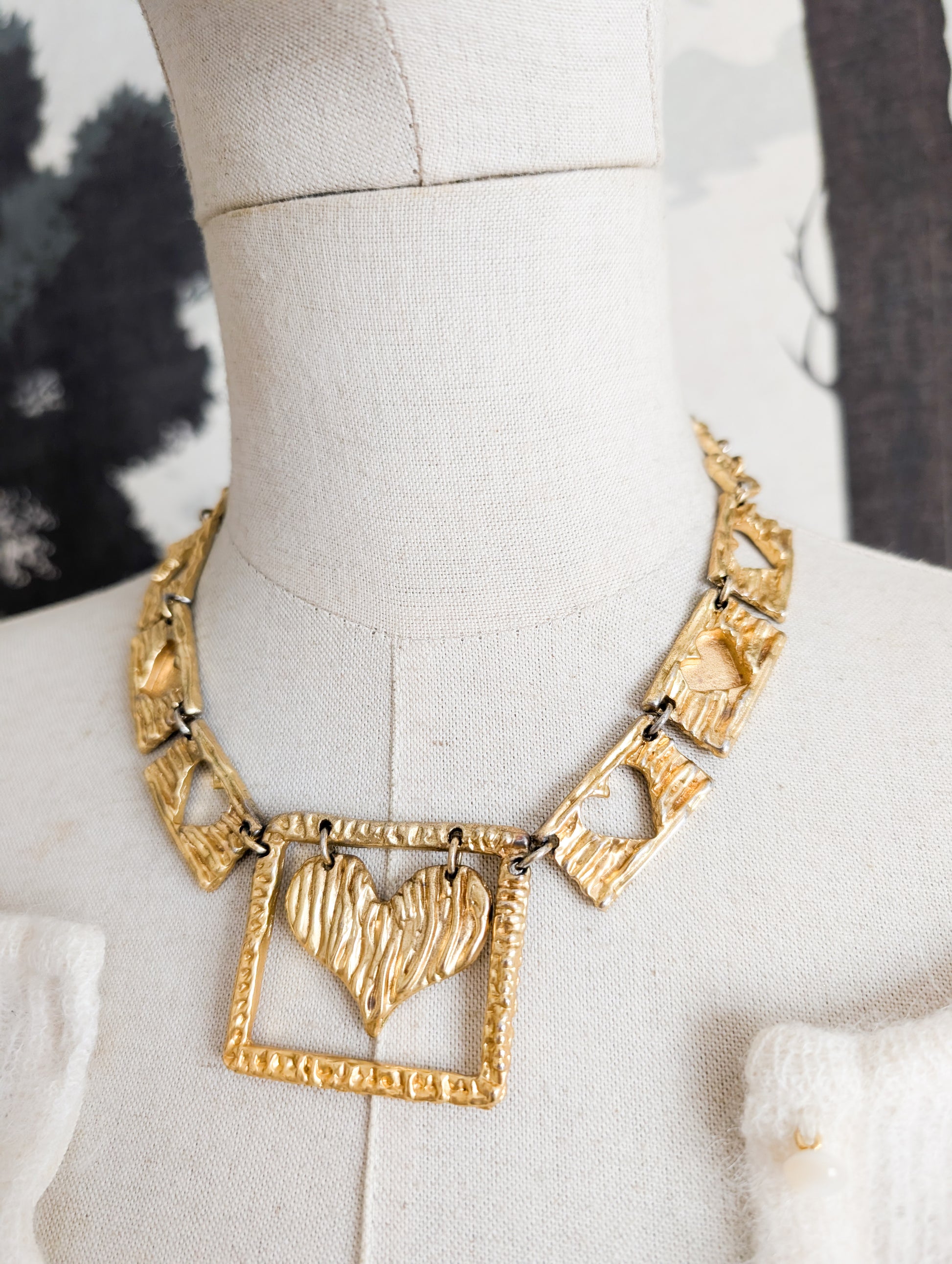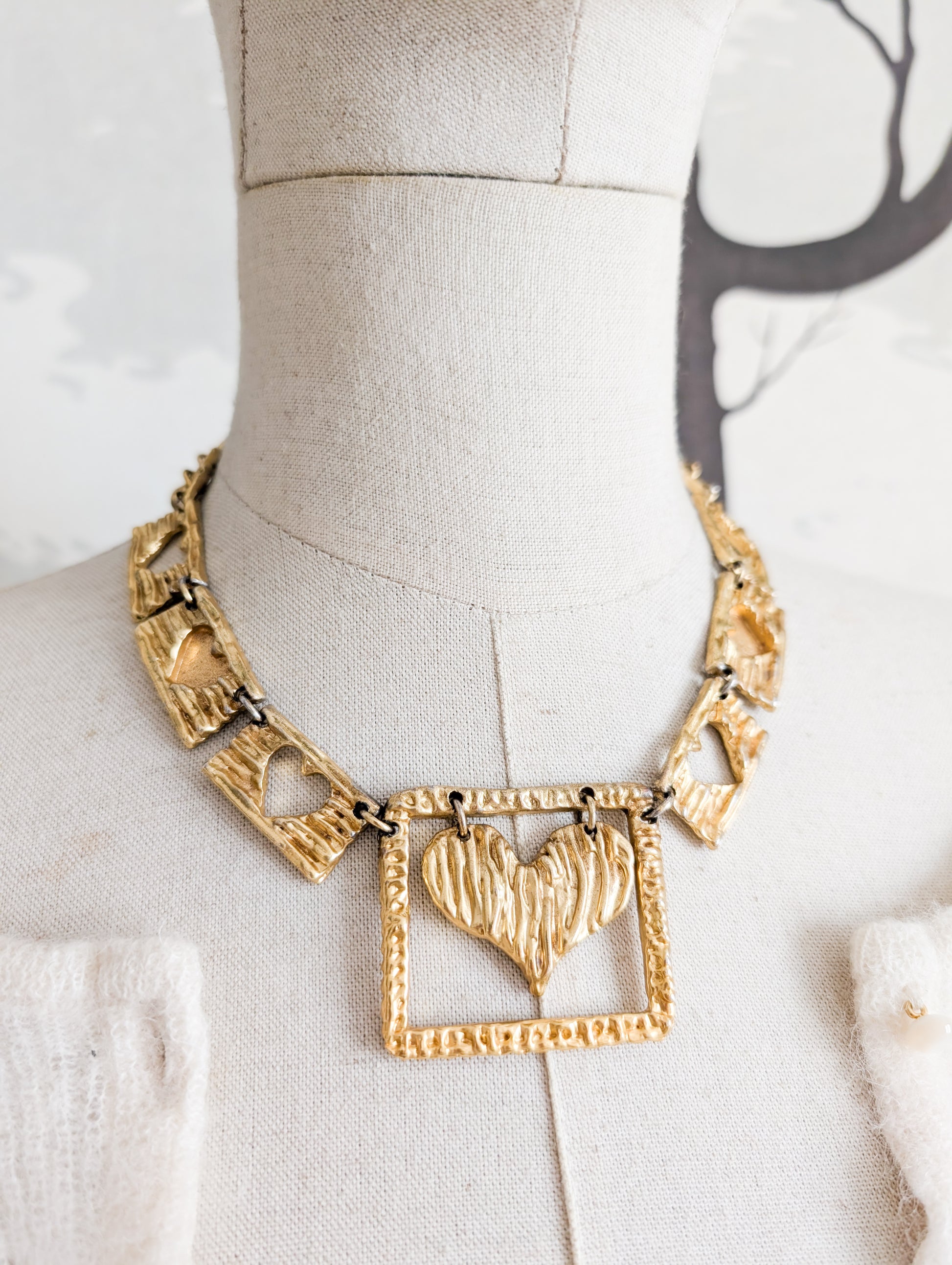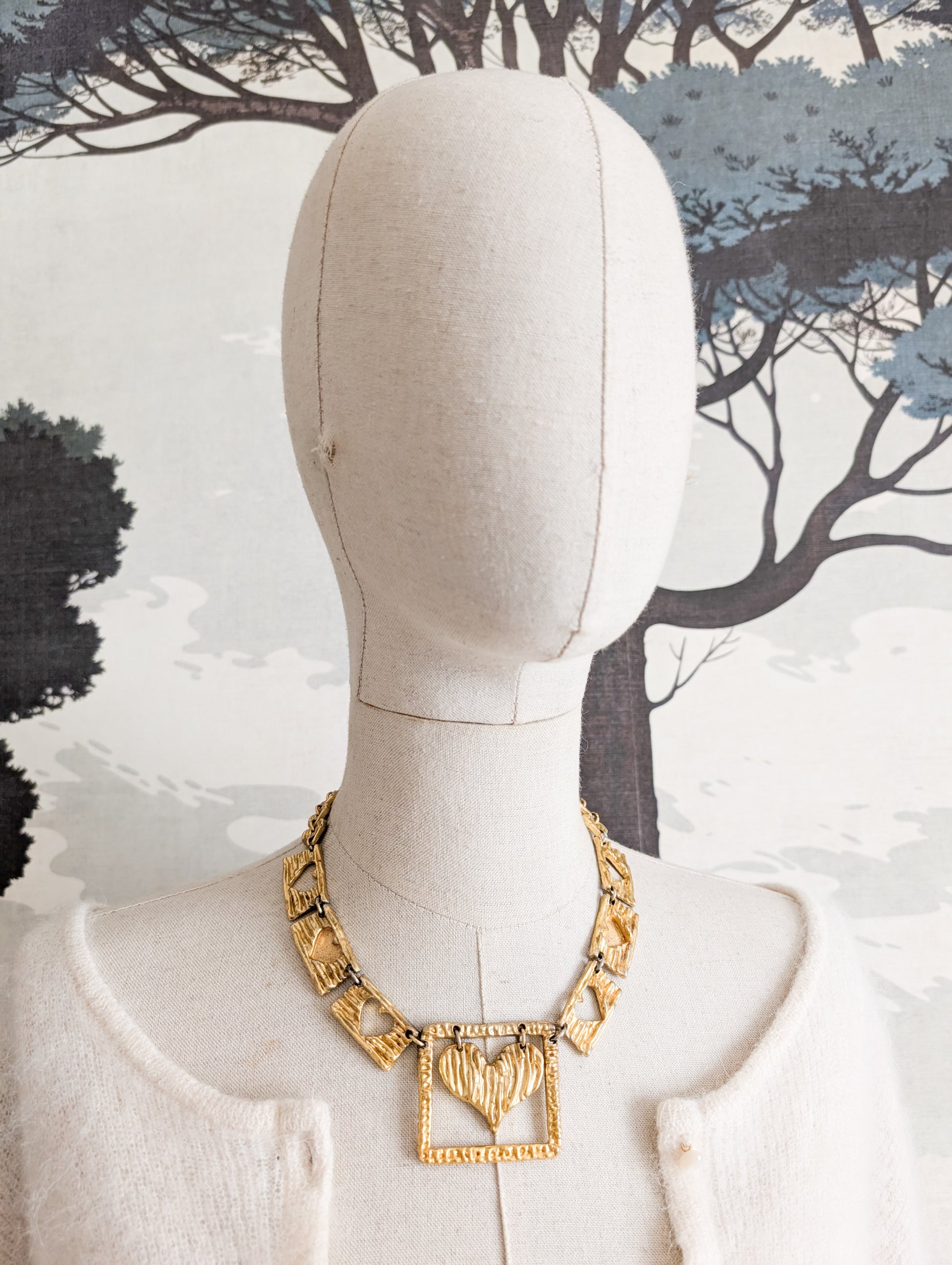 Le collier présente une structure en métal doré au fini texturé. Au centre, un grand pendentif carré encadre un joli cœur en relief.