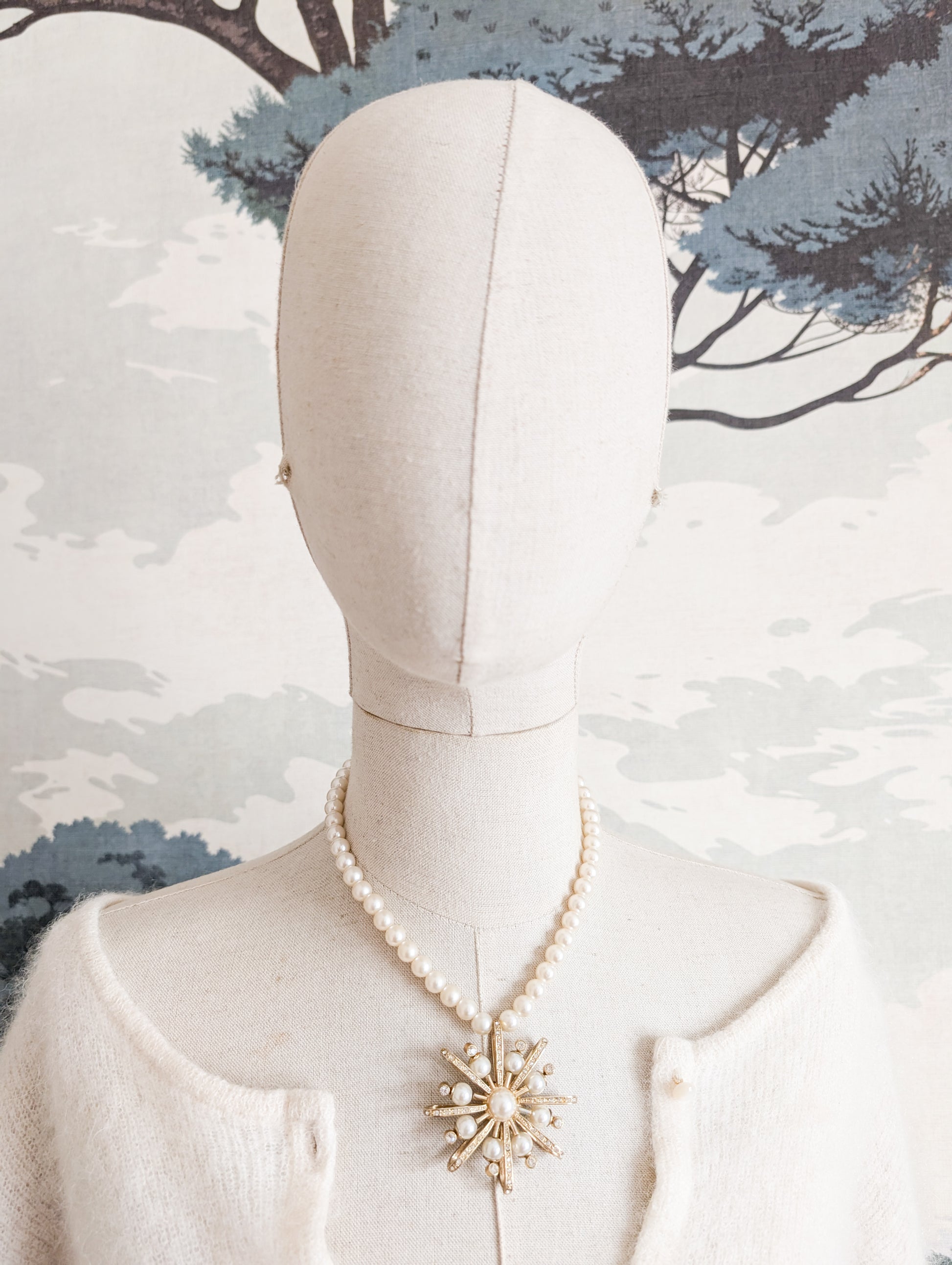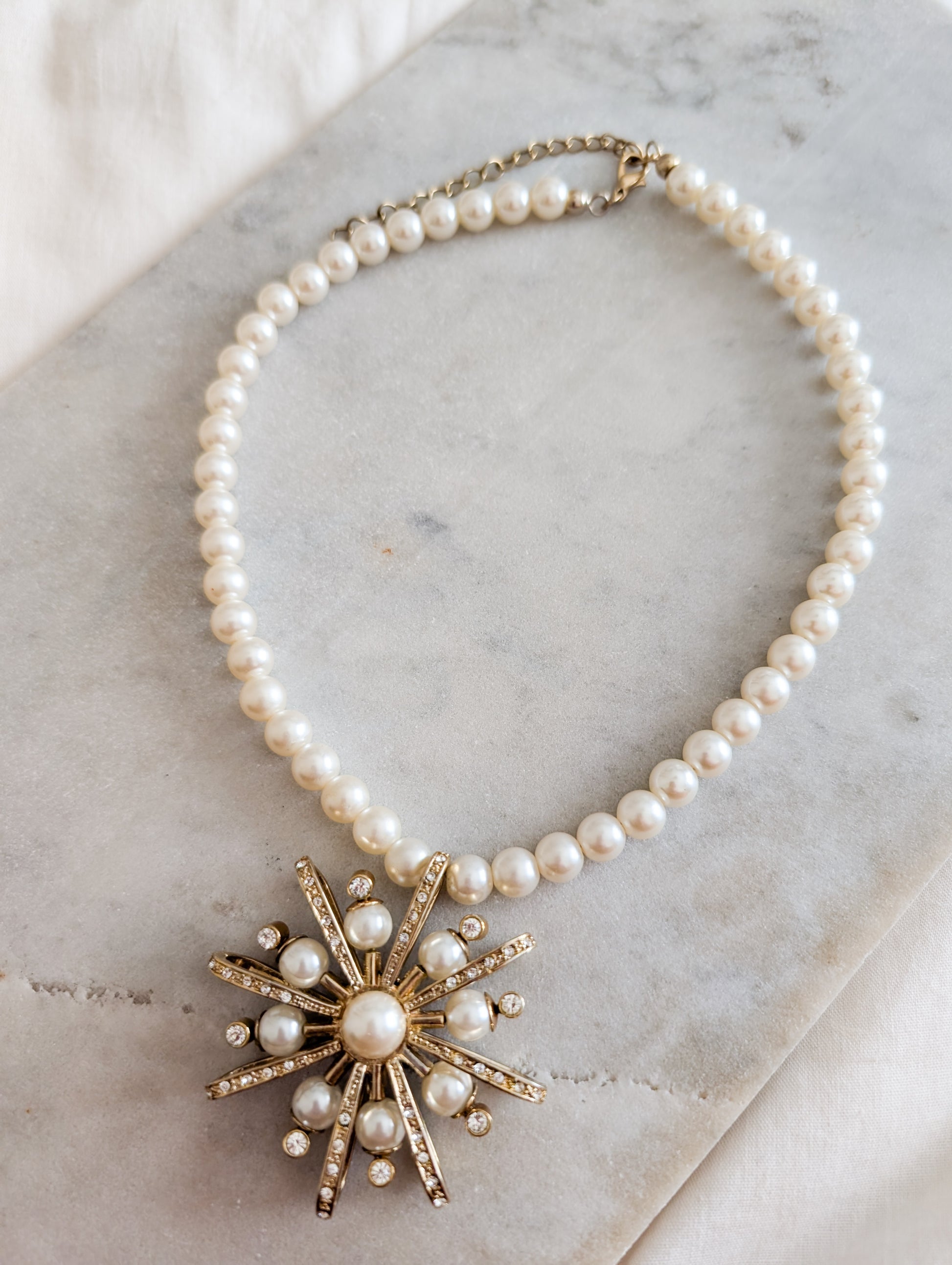 Le collier présente un rang de perles fantaisie en plastique blanc nacré. Très beau pendentif étoile en métal doré, pavé de strass blanc et de perles.