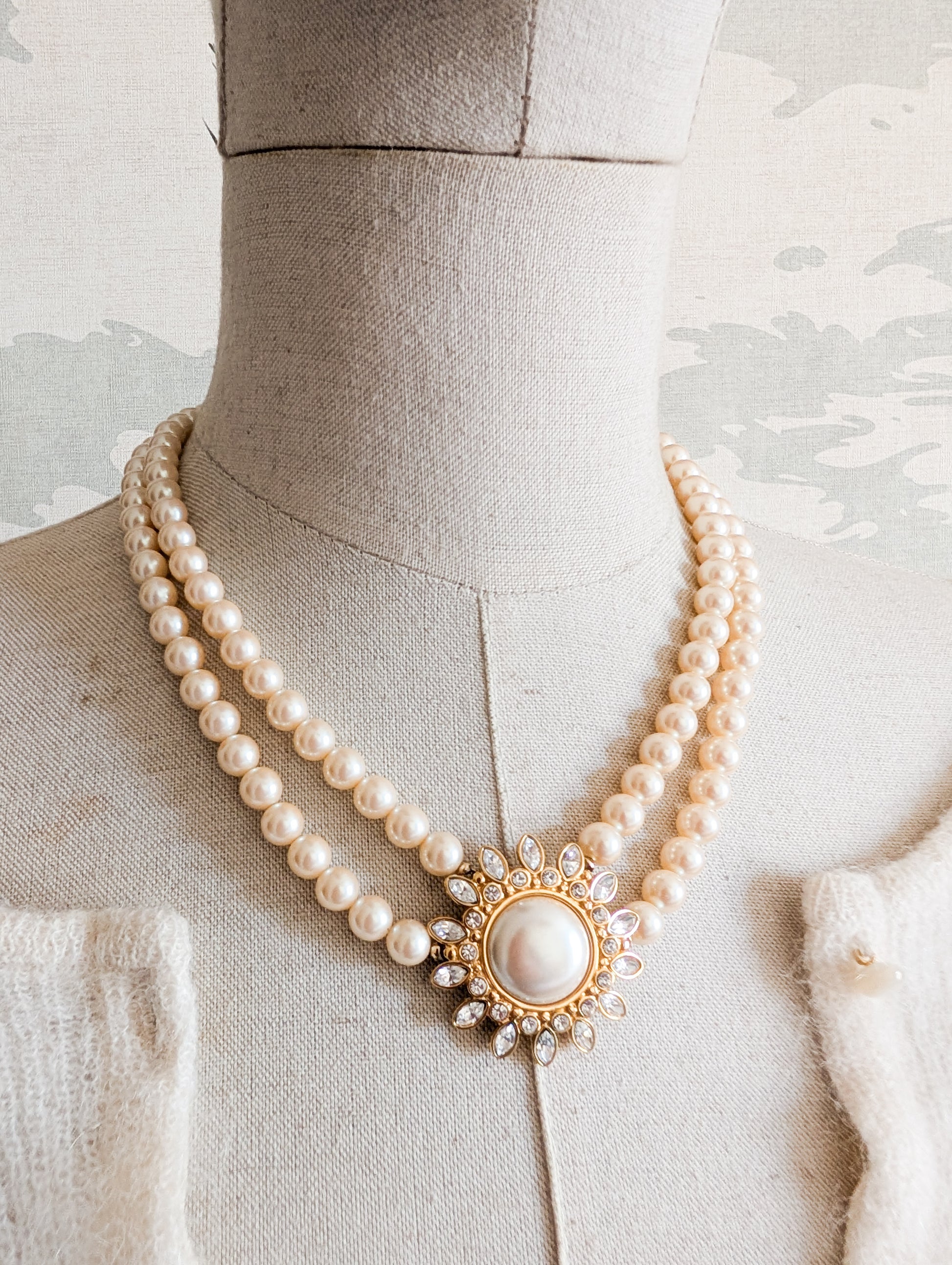 Le collier présente deux rangs de perles de verre nacrées.bau centre, un magnifique médaillon en métal doré pavé de strass en verre blanc et d'une perle fantaisie.