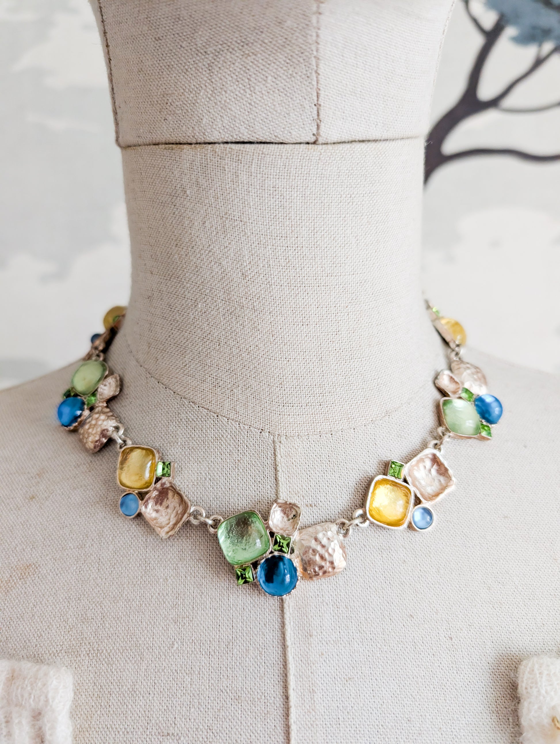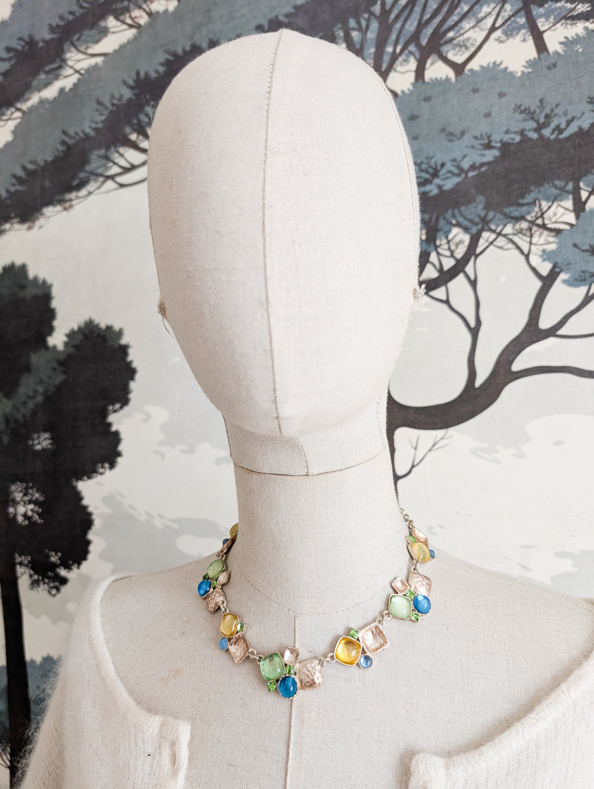Le collier est en métal argenté. Les mailles sont pavées de cabochons colorés en résine et de strass en verre vert.